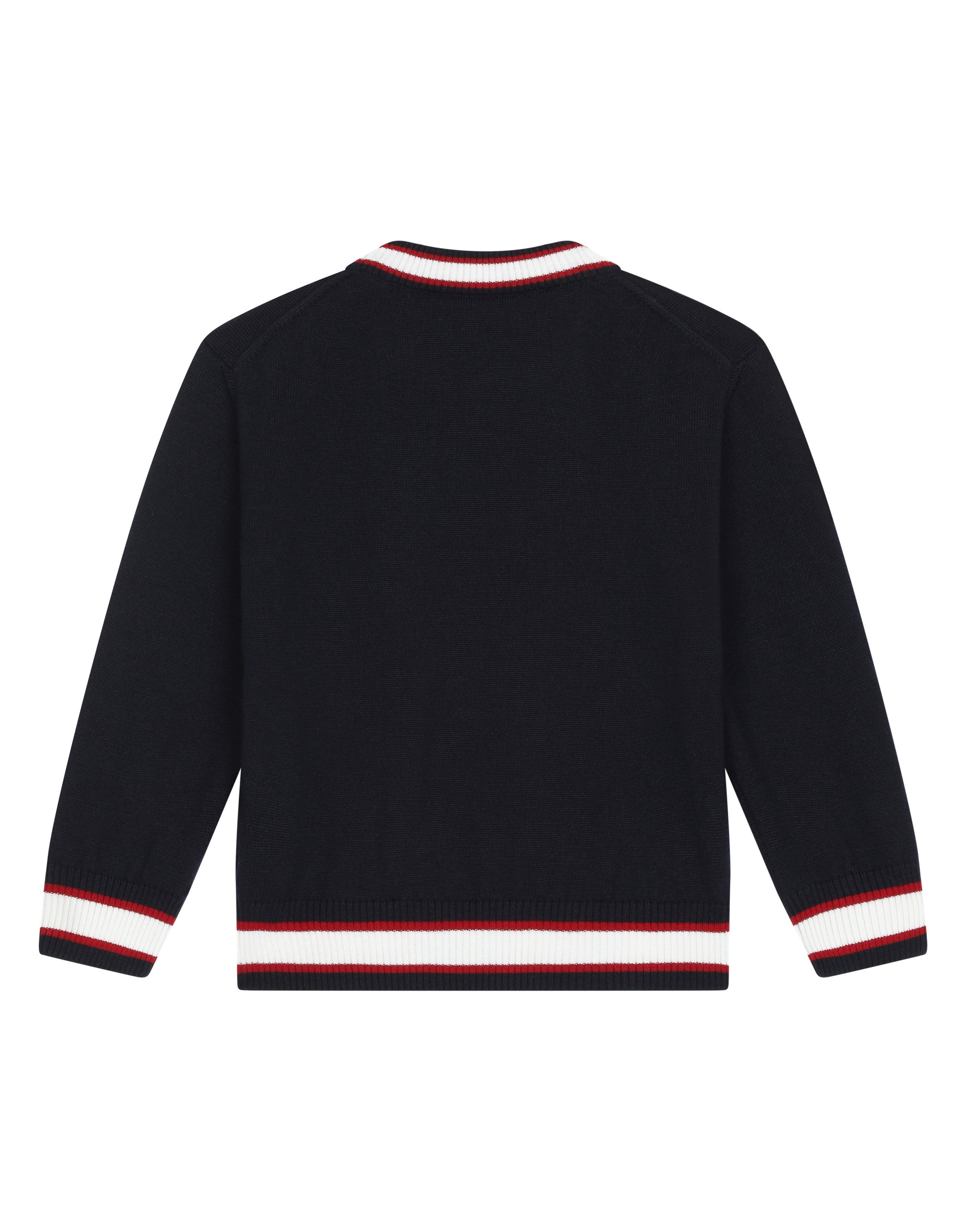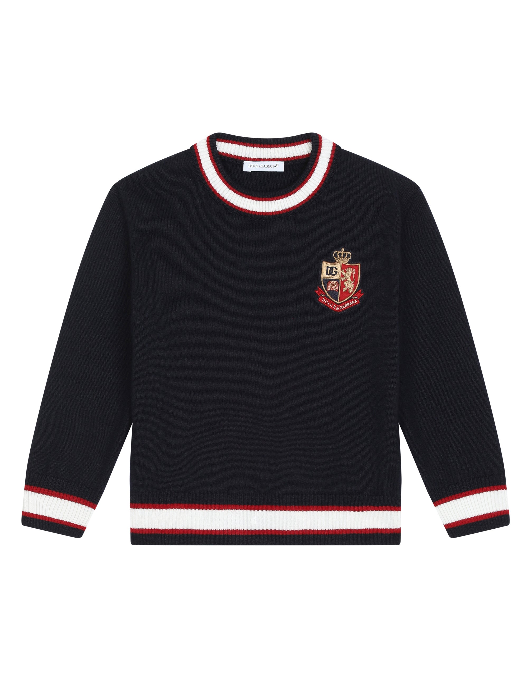 The Back To School capsule collection plays around with a mix of bold patterns and accents. The tartan gives the pieces flawless varsity style, embellished by heraldic patches, while colorful designs and lettering create exclusive prints. a cool and ironic look for comfortable and versatile pieces. This round-neck sweater features the heraldic patch and contrasting piping. • Regular fit • 14-gauge knit • Fine-rib round neck • Long sleeves • Embroidered heraldic patch on the front • Fine-rib hem and cuffs • The item in the size 3 years measures 38 cm from the shoulder seam • Made in Italy