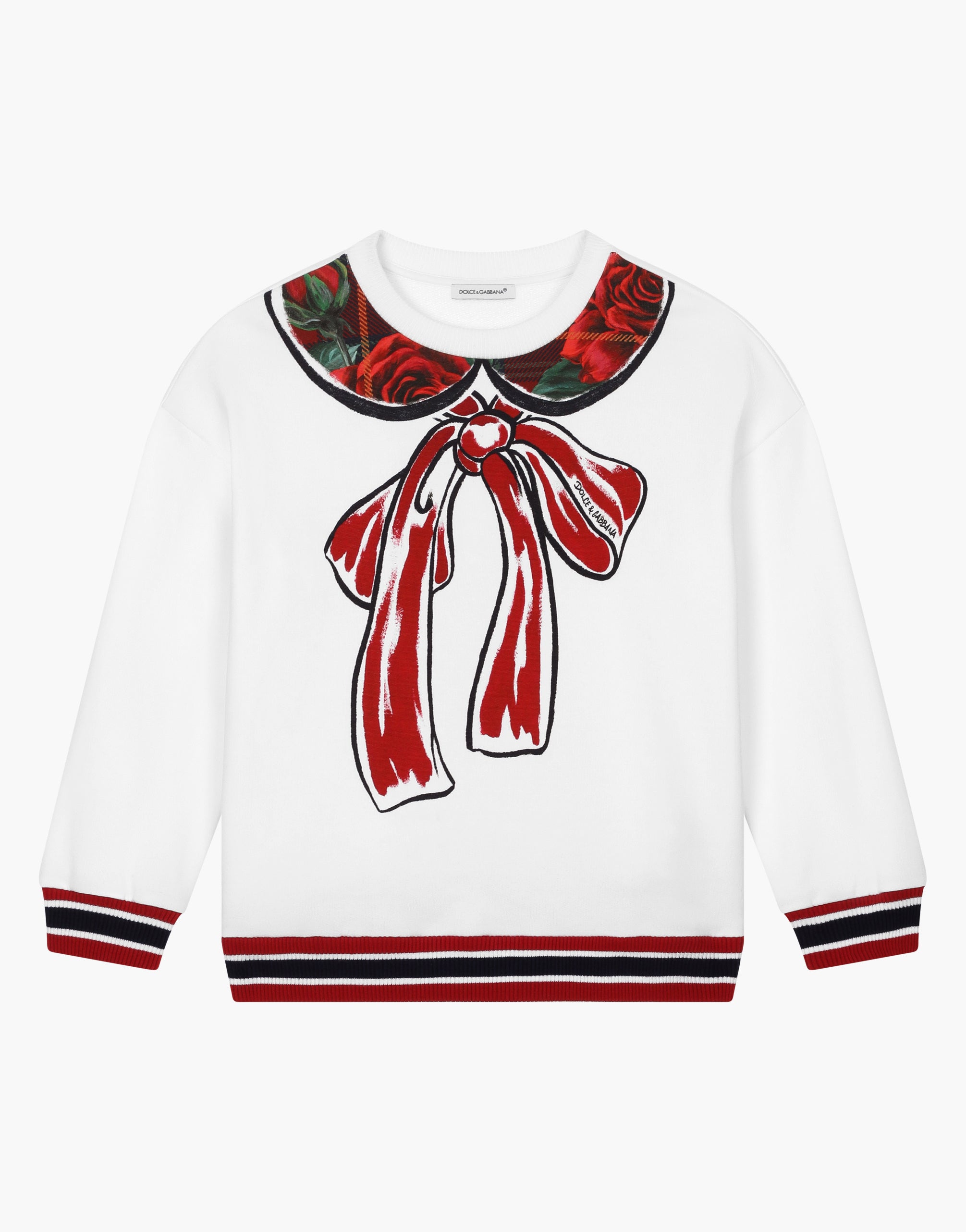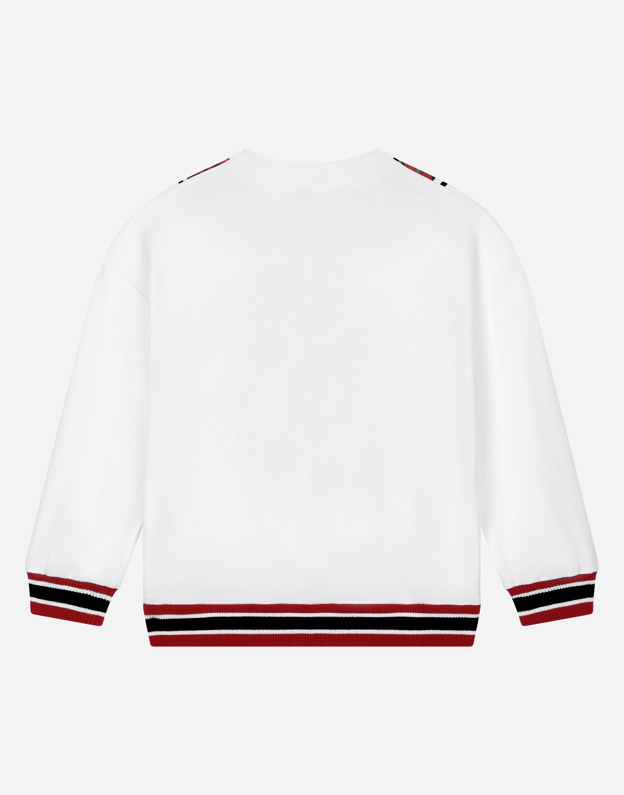 The Back to School collection ironically recounts the tartan print that has been given a fluid aesthetic and the concept of the mascot, which is transforming into a fun and sporty mini leopard for the occasion, dressed head to toe in Dolce&Gabbana looks. “Too Cool For School”, contemporary outfits, a mix of colorful patches, logos and symbols overlap for streetwear looks in which our iconic accents become interchangeable and ultra-creative to provide stylish back-to-school looks. Round-neck sweatshirt with trompe l'oeil bow print: • Multi-colored • Regular fit • Round neck • Long sleeves • Trompe l'oeil print • Stretch knit hem and cuffs • Unlined • The item in the size 6 years measures 50 cm from the shoulder seam • Made in Italy The difference in the print placement that you may find on this product is a feature of Dolce&Gabbana’s “Handmade” pieces. A detail that makes every garment or accessory unique and exclusive.