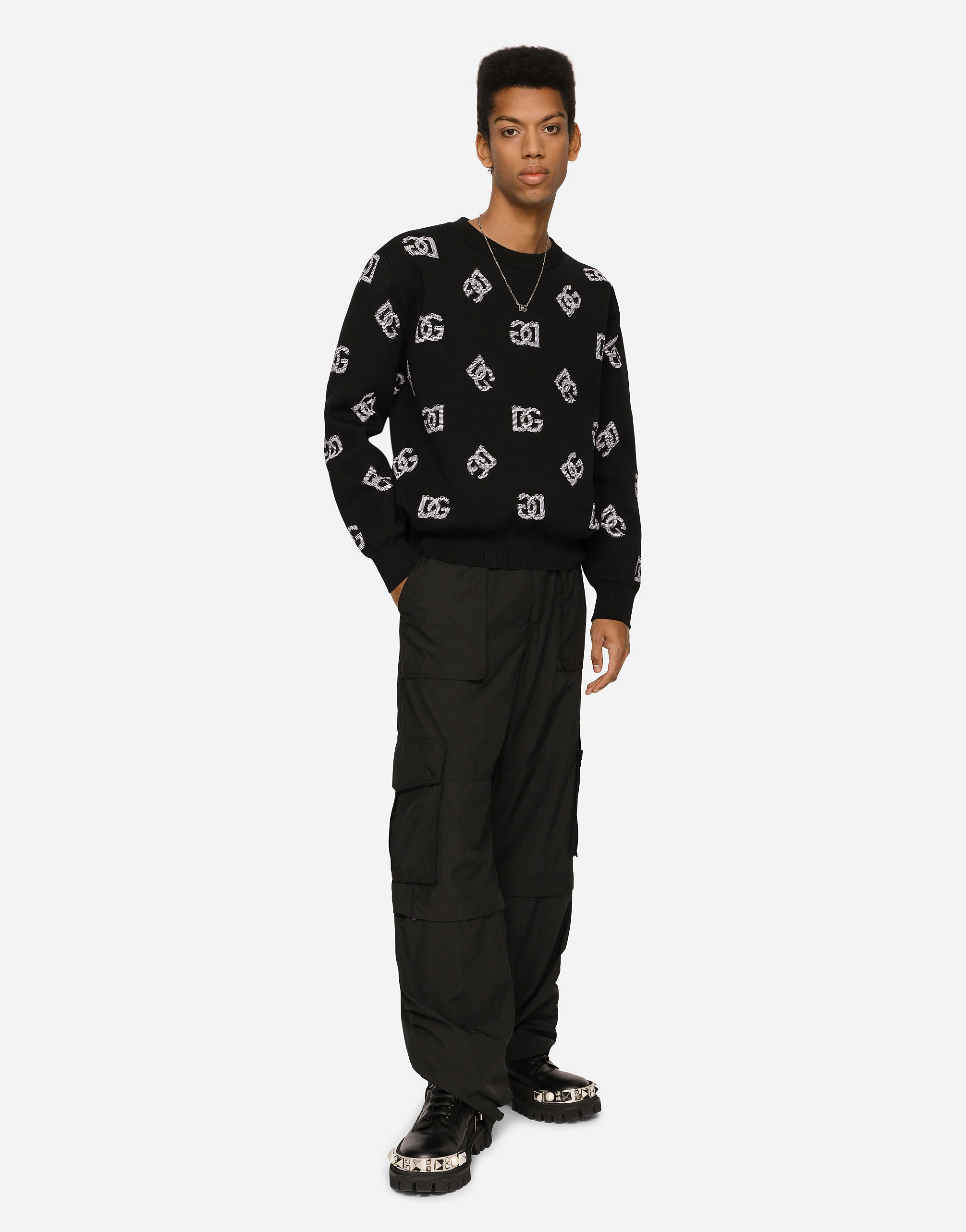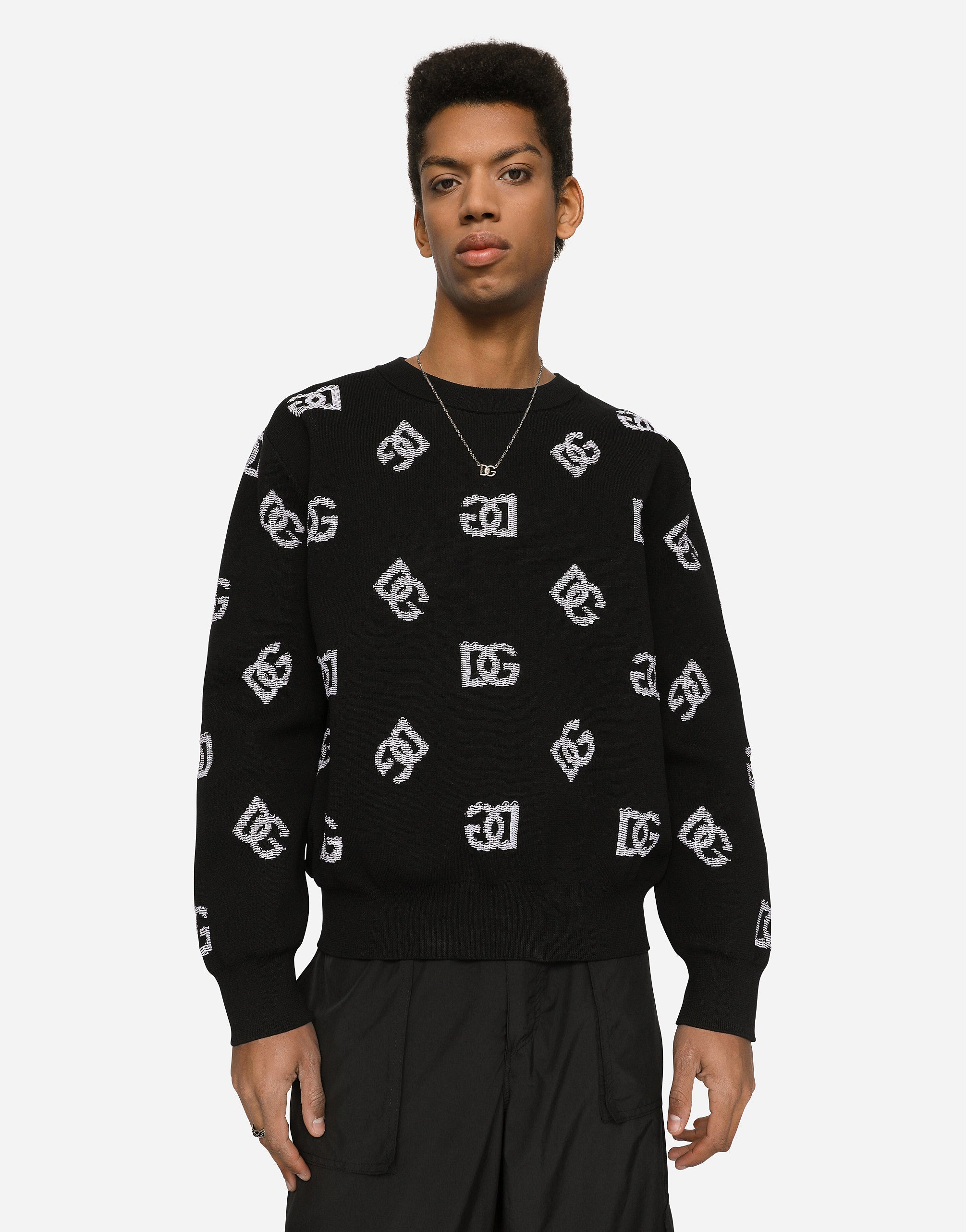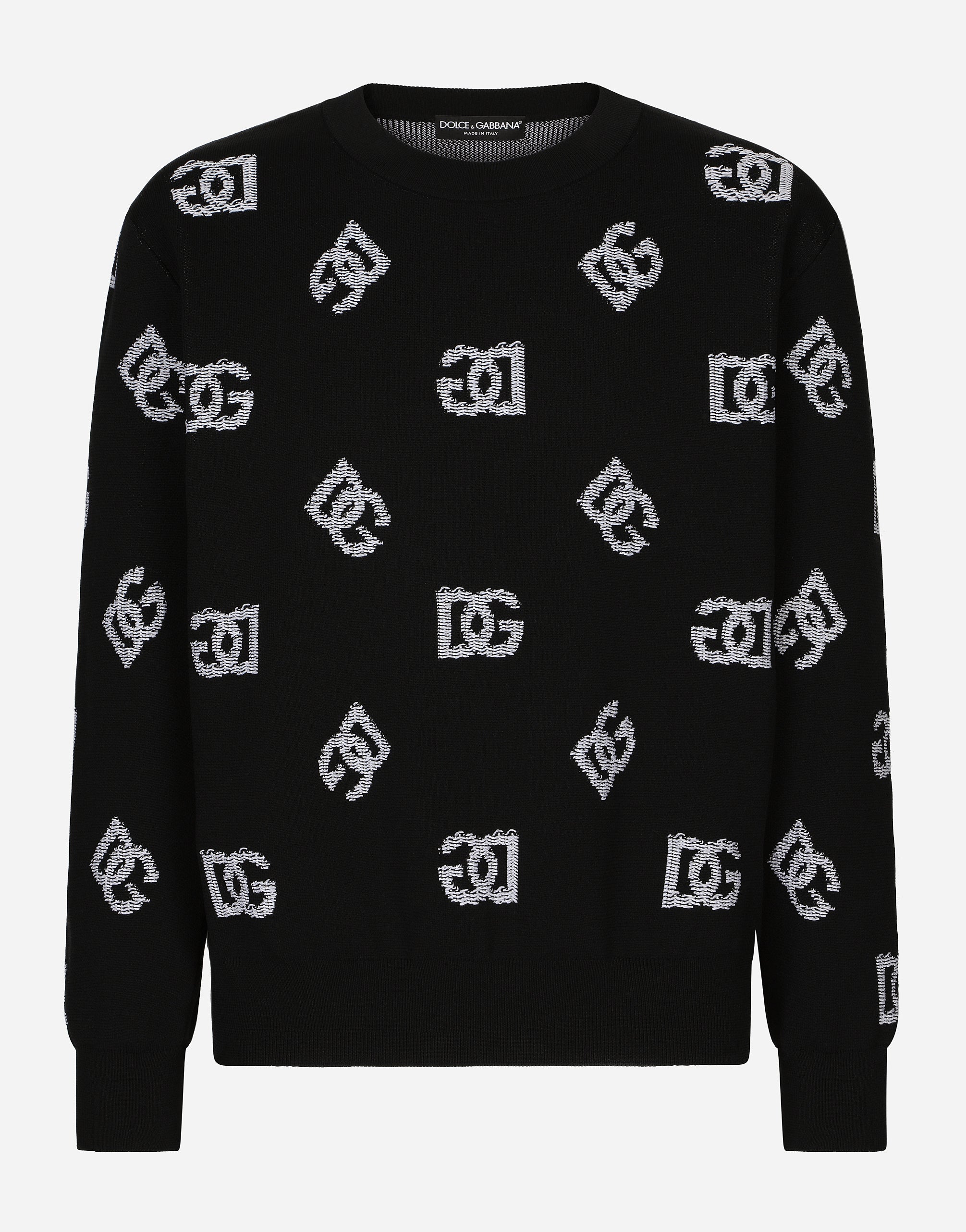 The “Dark Side” Collection is inspired by the Punk Rock movement that was on the rise in England and the United States in the mid-70s. Looking at Punk, Dolce&Gabbana is paying tribute to the legends of entire generations, celebrating uniqueness, individuality and provocation by making men free to express themselves with the language of today. Round-neck technical jacquard sweater with DG logo. • Oversize fit • 3-gauge plain knit • The piece measures 69 cm from the shoulder seam on a size M • The model is 185 cm tall and wears a size M • Made in Italy