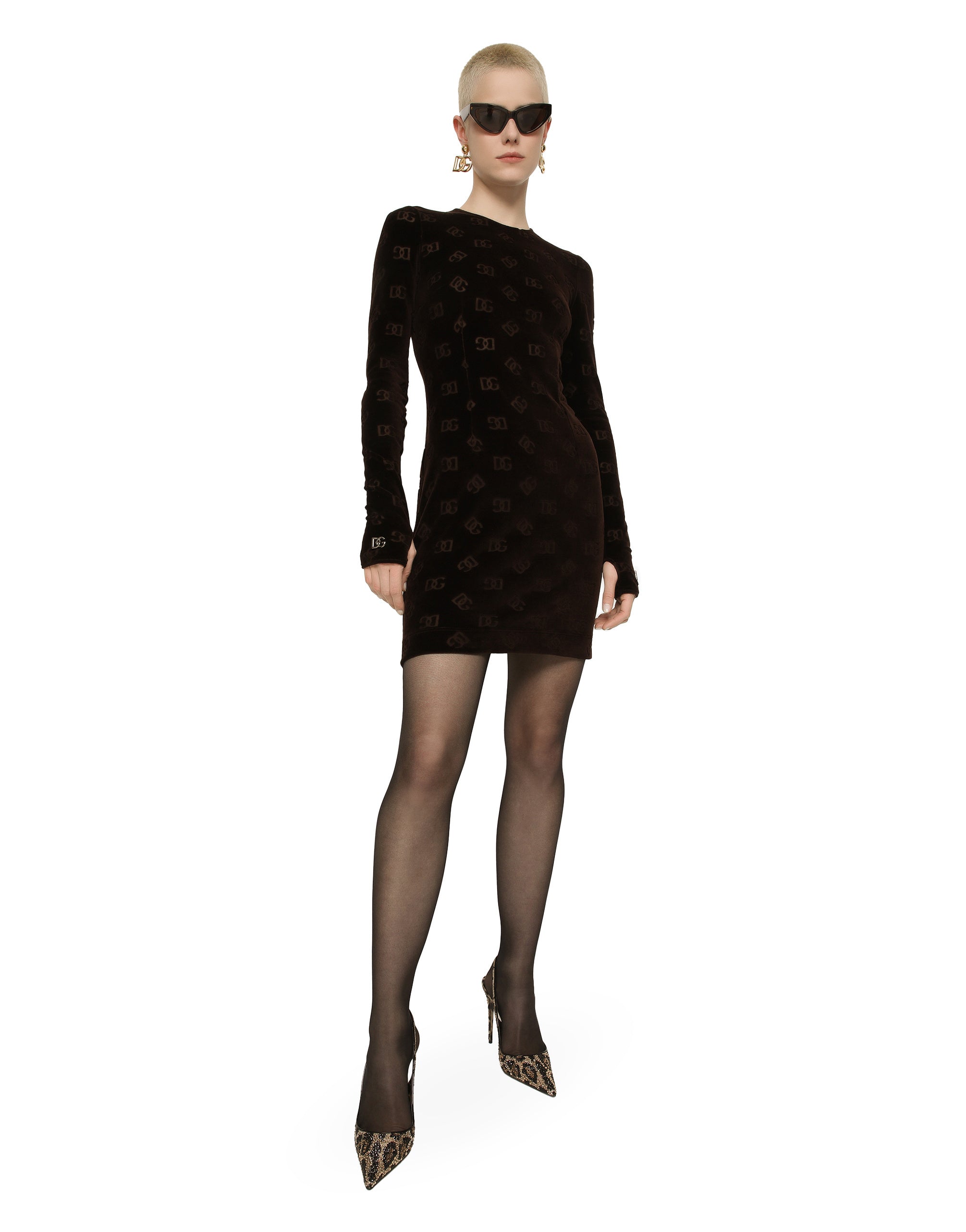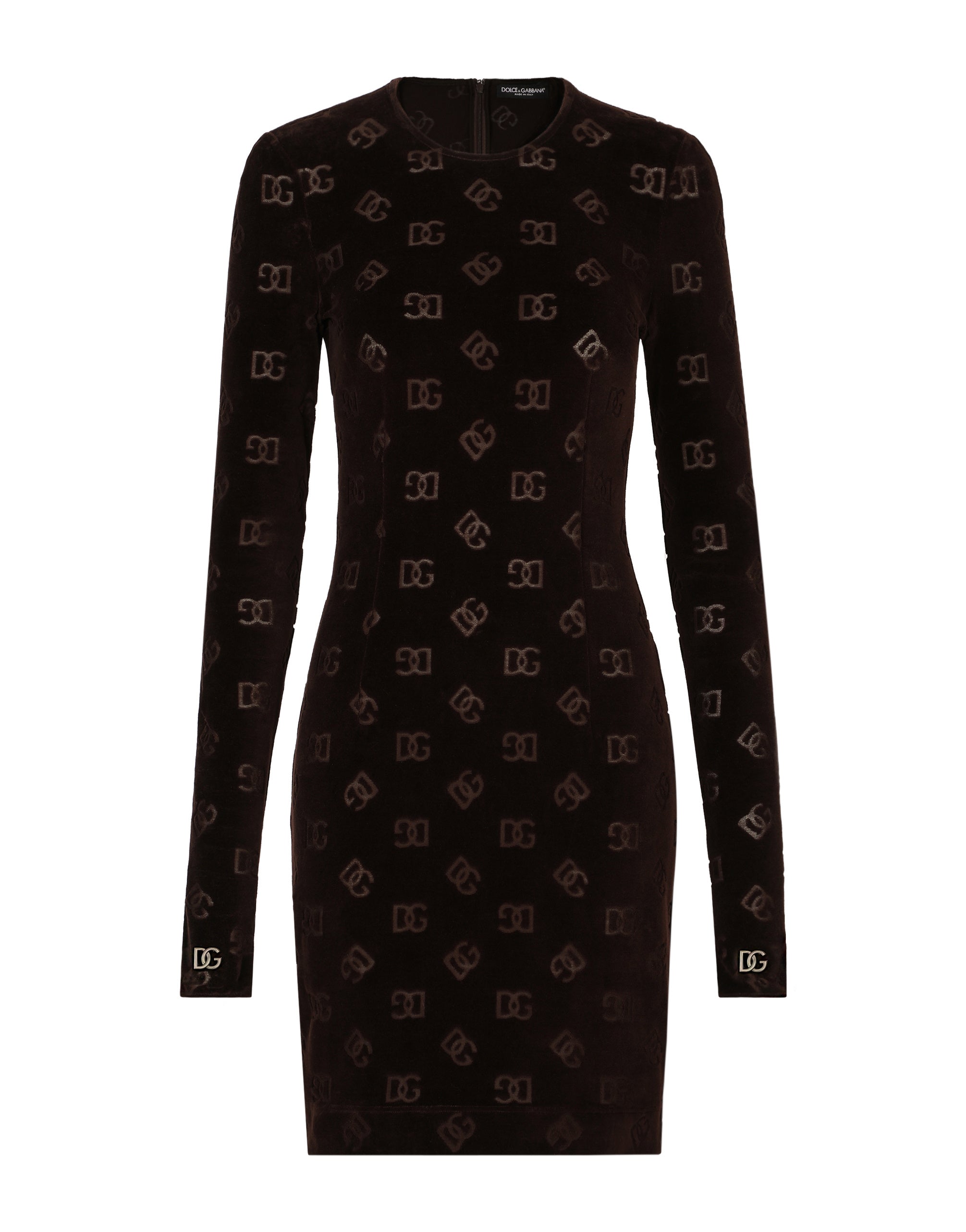 The Cammello collection represents emotion, sensuality, but also balance. Neutral, warm and timeless camel overlays the iconic leopard print, creating a new take on relaxed, enveloping femininity. This world is inhabited by various nuances, ranging from camel to warm orange hues and even various spice colors. A collection that is the veritable expression of casual, urban style, perfect for different occasions - unmistakable, unique and sophisticated. Short cotton chenille dress with jacquard DG logo: • Brown • Round neck • Long sleeves • Unlined • Rear zipper and hook-and-eye fastening • The piece measures 50 cm from the waist down on a size IT 40 • The model is 175 cm tall and wears a size IT 40 • Made in Italy