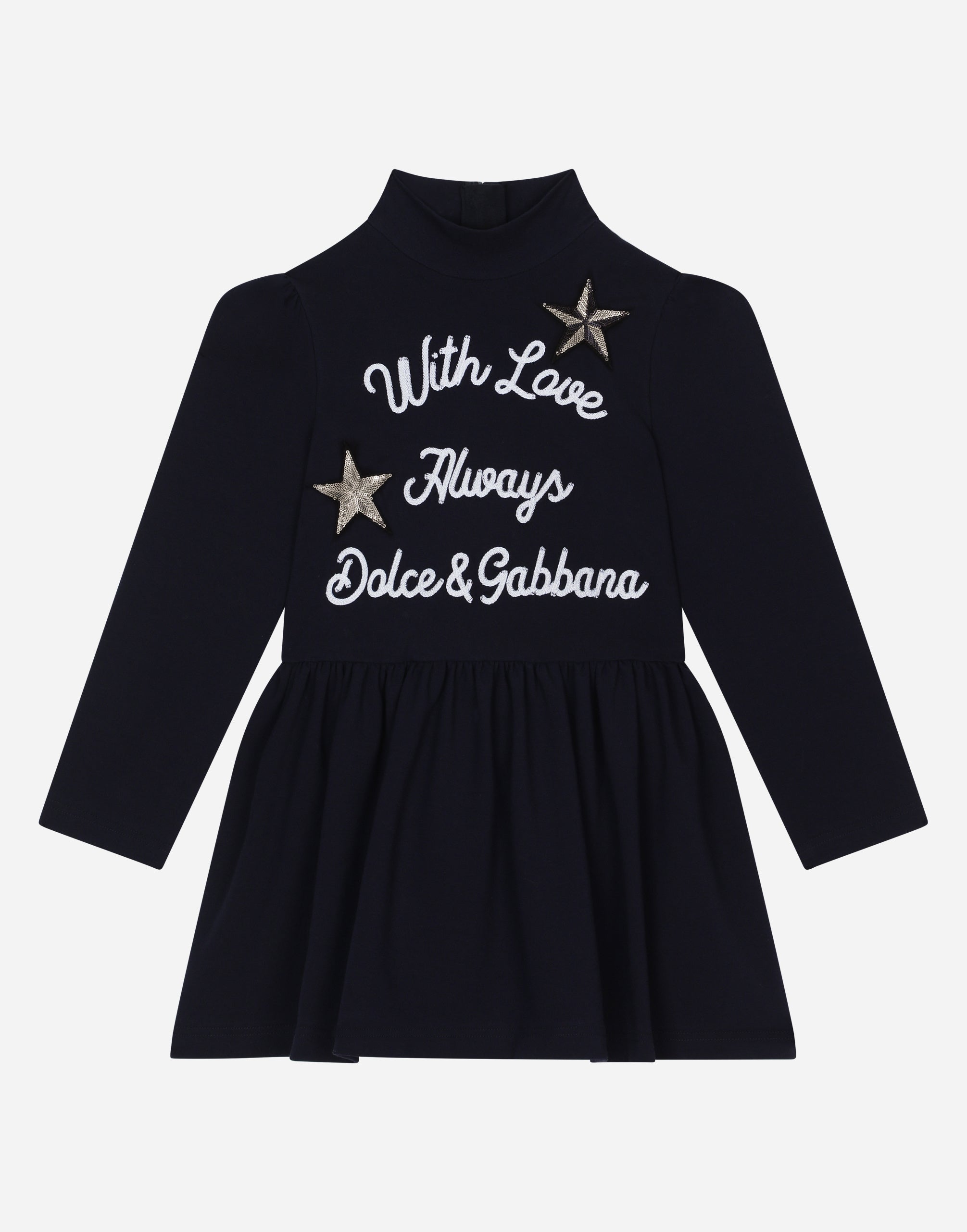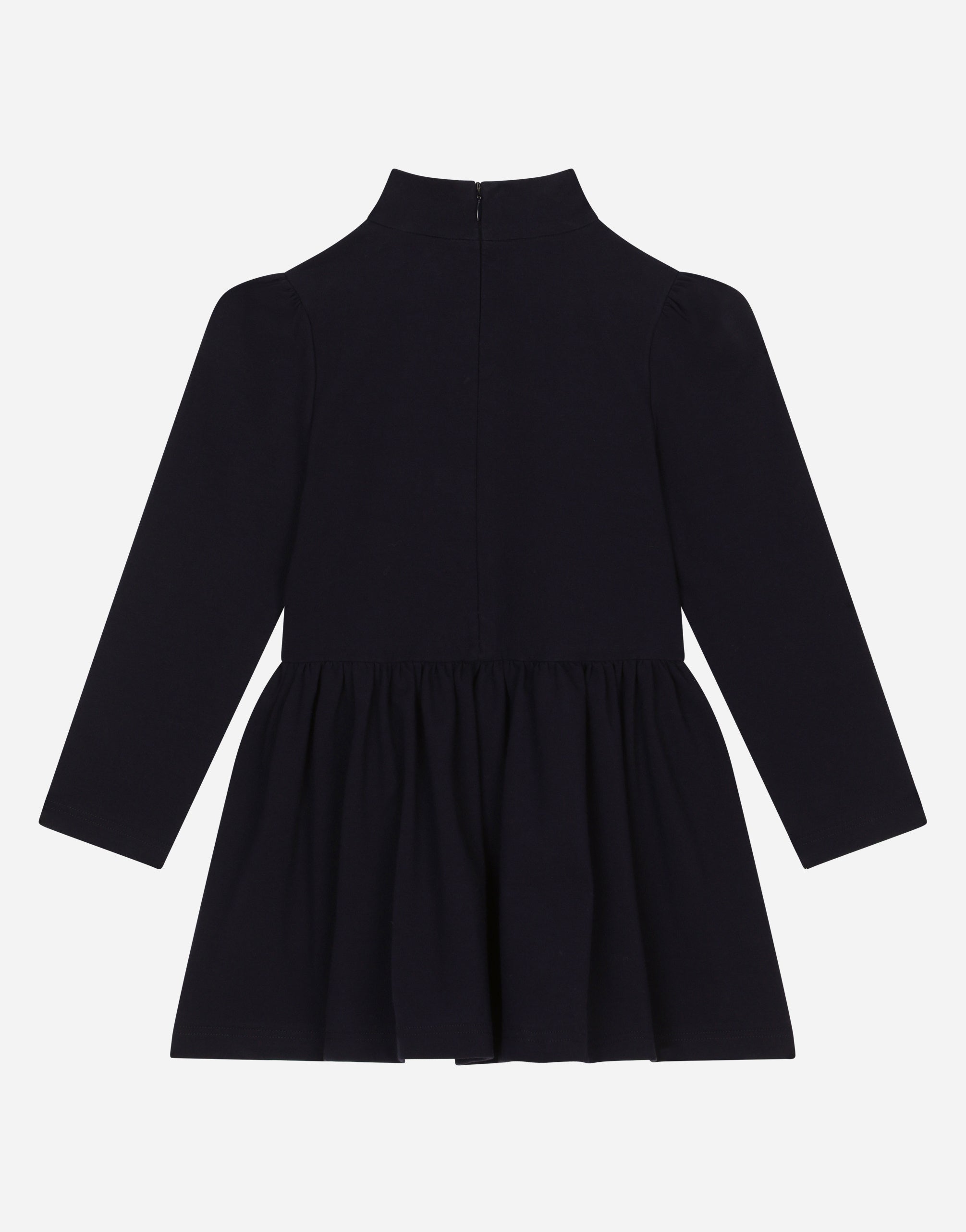 The Sailor line features a chic and timeless nautical-inspired look. Stripes, emblems and golden buttons distinguish go-to pieces that exude French allure, brightened up by pops of color and sparkling sequins. A mix that takes style and elegance to the next level with a classic edge. This short interlock dress is perfect for all occasions. • Regular fit • Turtle-neck • Long sleeves • Gathered waist • Concealed zipper fastening on the back • The item in the size 3 years measures 54 cm from the shoulder seam • Made in Italy