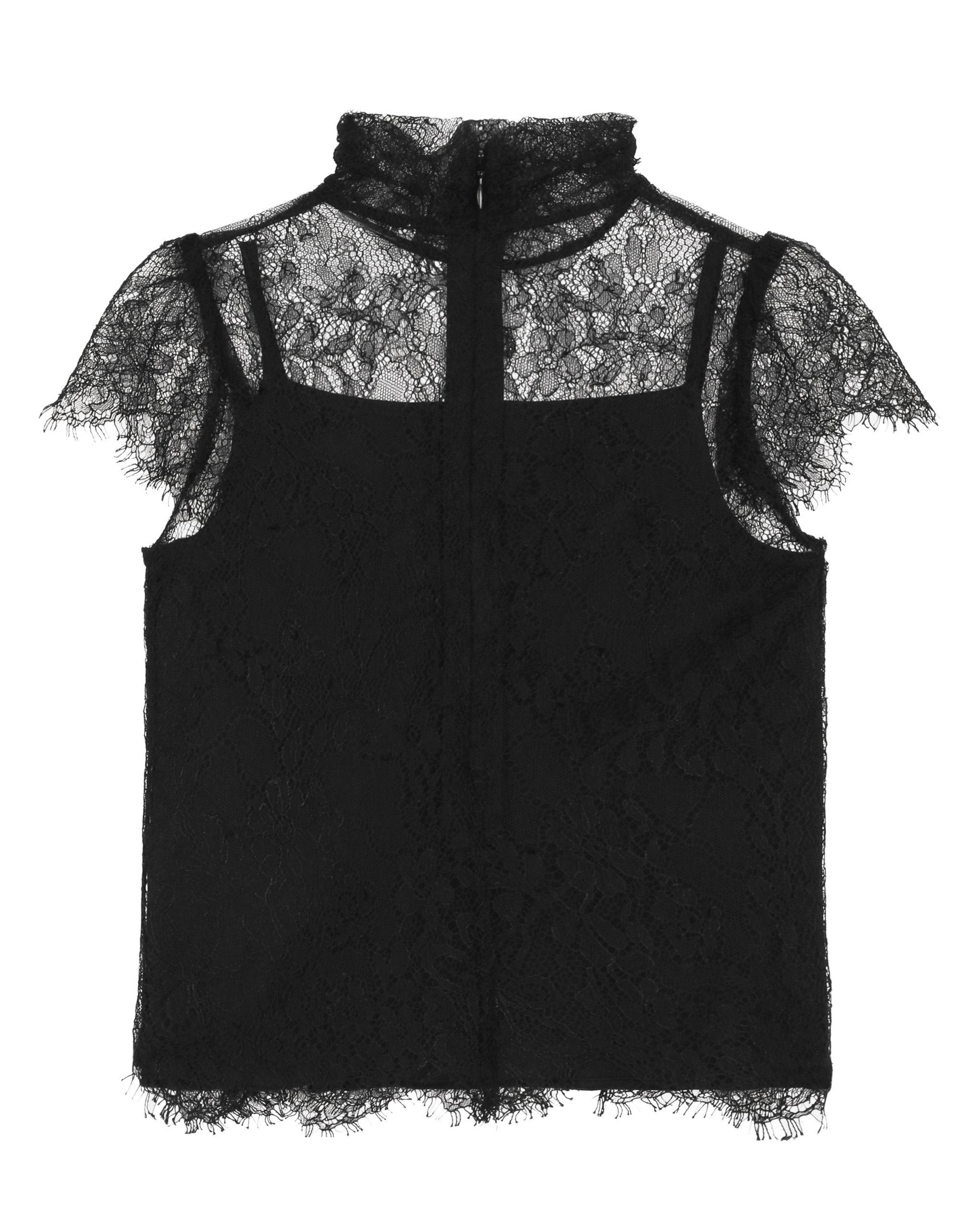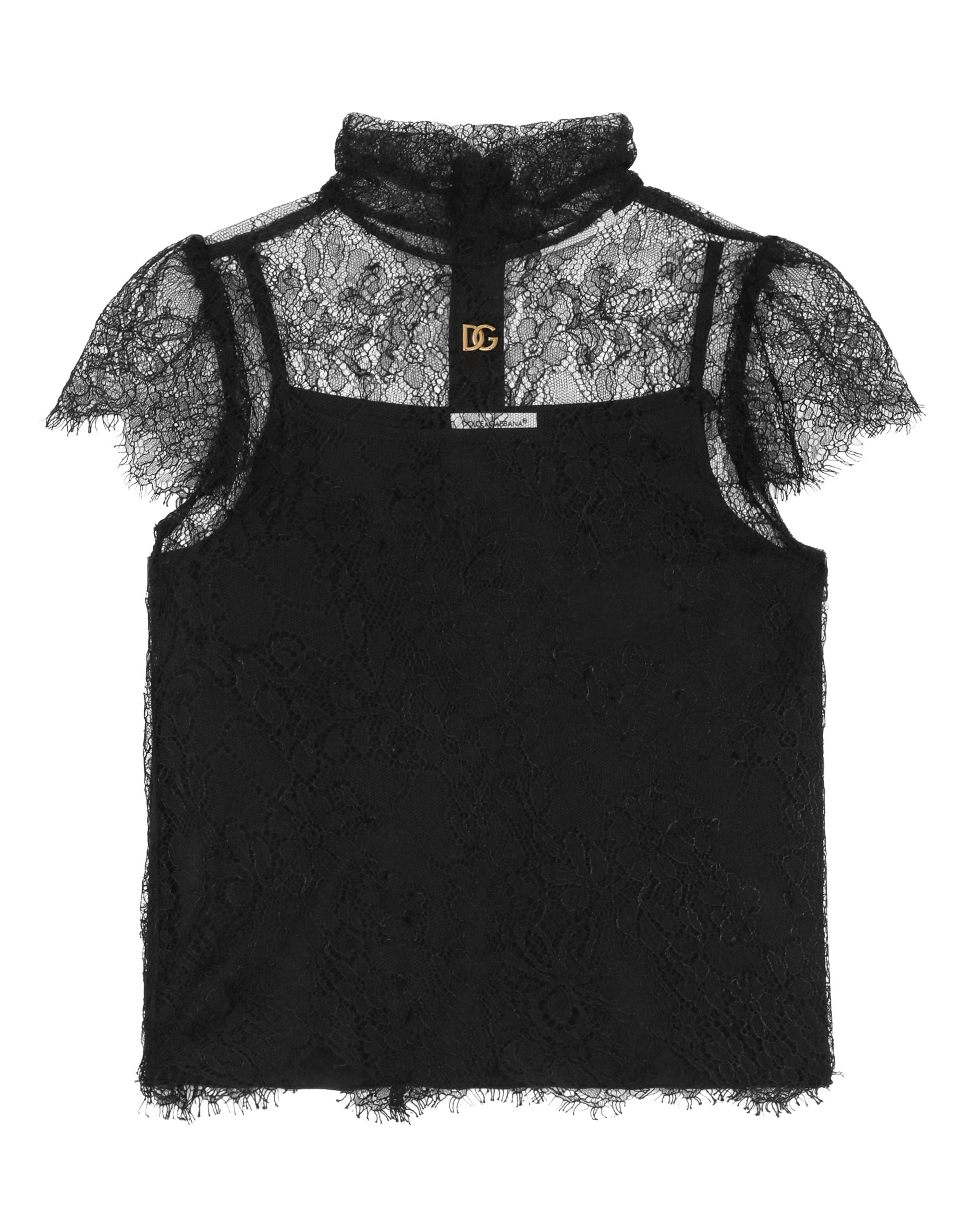 The new FW 23-24 Girl’s Collection invites us to discover the beating heart of Dolce&Gabbana through a journey that touches upon 4 colors, Sicilia black, volcano red, baroque gold and trousseau white. Playing around with shape, volume and irony, little girls can reinvent themselves and dress up in their mamma’s clothes. Volcano red trench coats, little dresses, crystals alternating with white shirts and 3D flowers, paired with Chantilly lace featuring gold detailing, lead us on a discovery into the true essence of Dolce&Gabbana. Short-sleeved Chantilly lace top with DG logo on the front: • Black • High neck • Metal DG logo on the front • Short sleeves • Back zipper fastening • Lining with silk tank top • The piece in the size 6 years measures 44 cm from the shoulder seam •Made in Italy