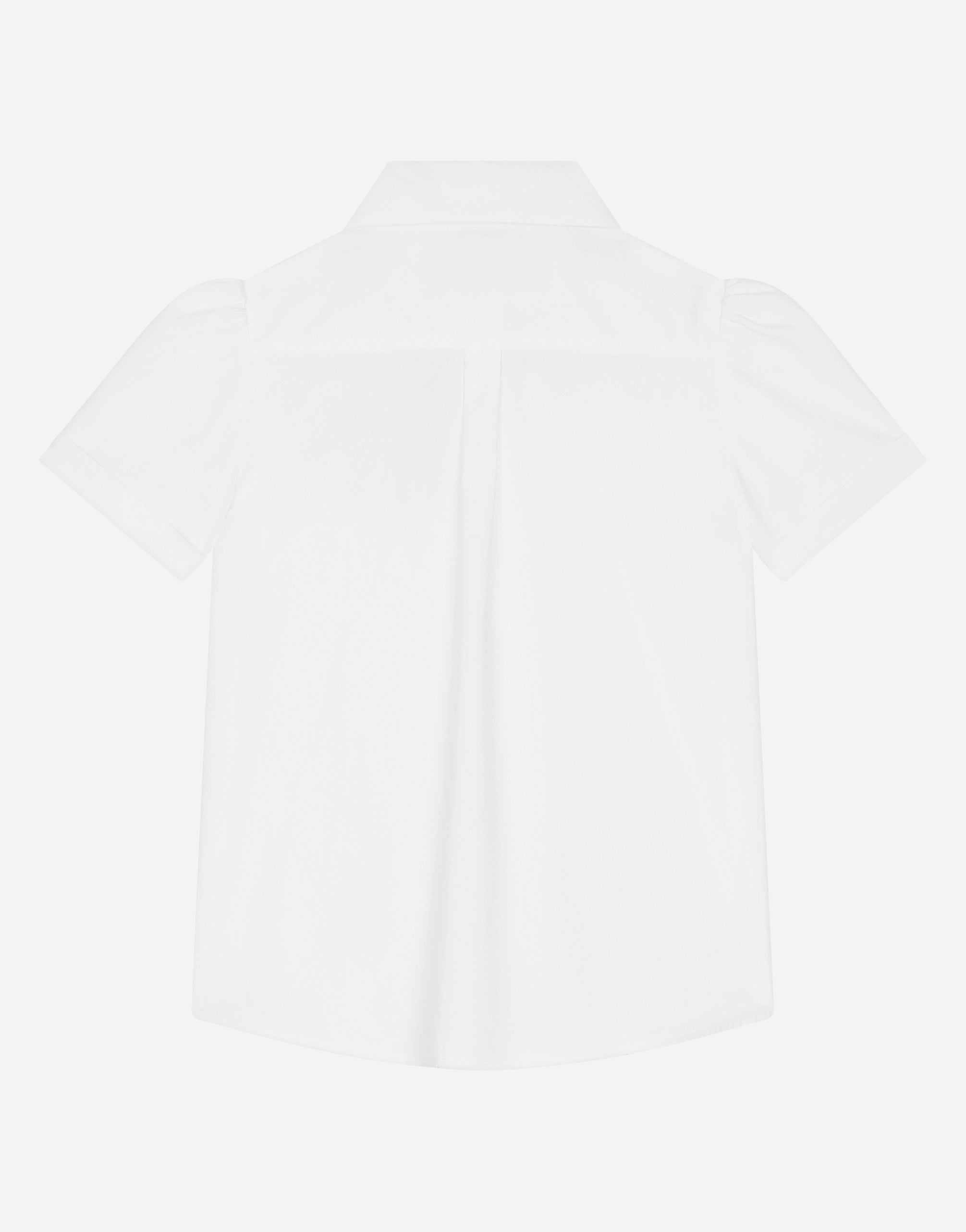The Back to School collection ironically recounts the tartan print that has been given a fluid aesthetic and the concept of the mascot, which is transforming into a fun and sporty mini leopard for the occasion, dressed head to toe in Dolce&Gabbana looks. “Too Cool For School”, contemporary outfits, a mix of colorful patches, logos and symbols overlap for streetwear looks in which our iconic accents become interchangeable and ultra-creative to provide stylish back-to-school looks. Short-sleeved poplin shirt with rose patch: • White • Regular fit • Shirt collar • Embroidered rose patch • Short gathered sleeves • Button fastenings at the front • The item in the size 6 years measures 46.40 cm from the shoulder seam • Made in Italy