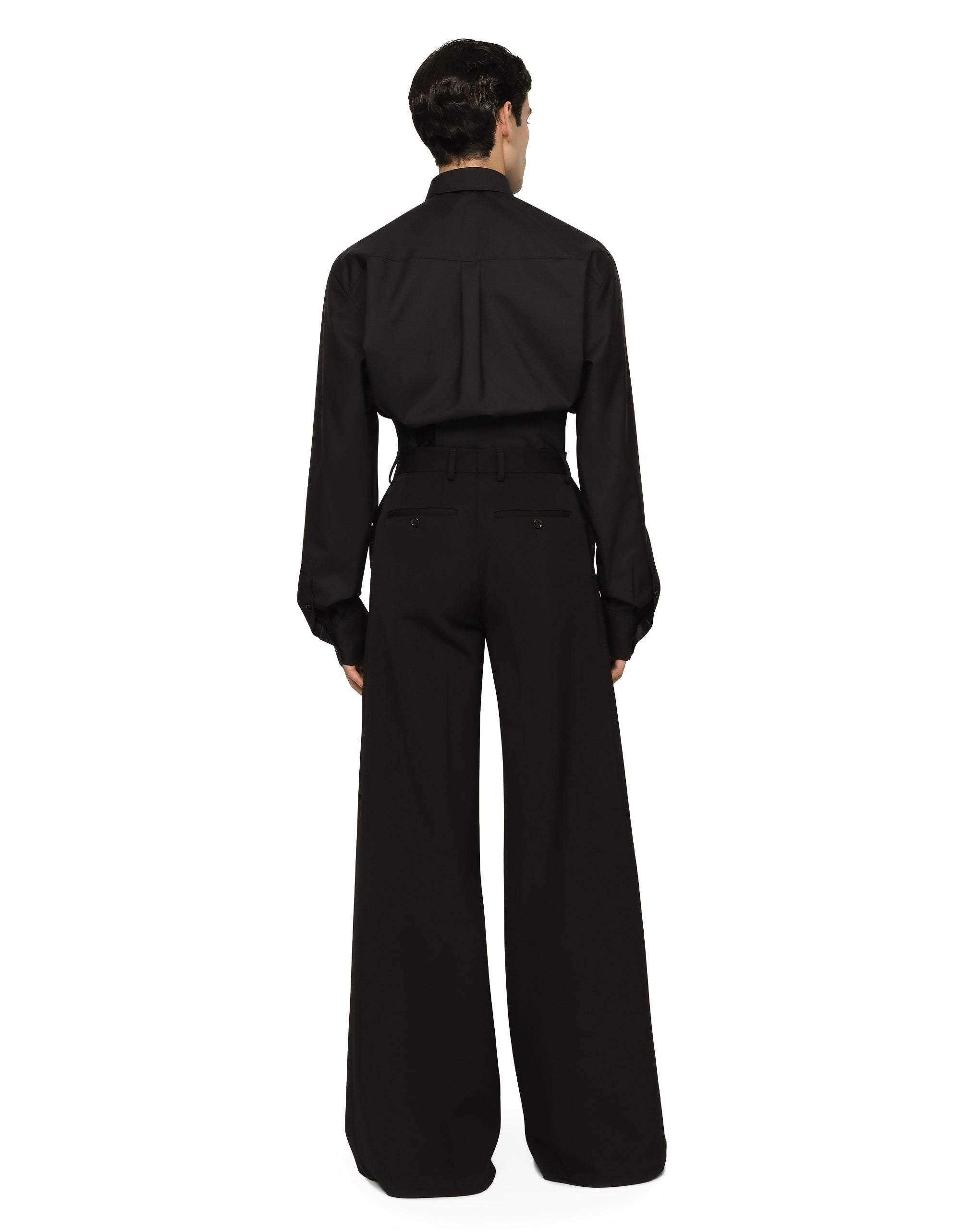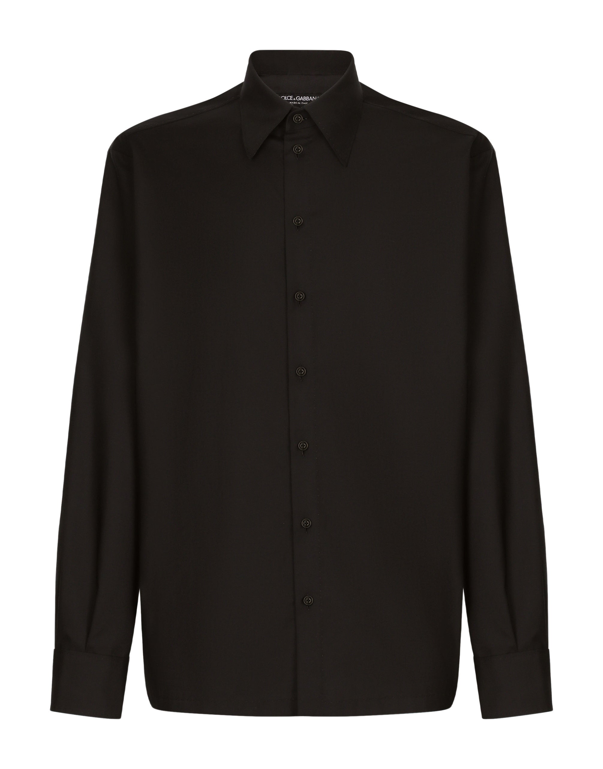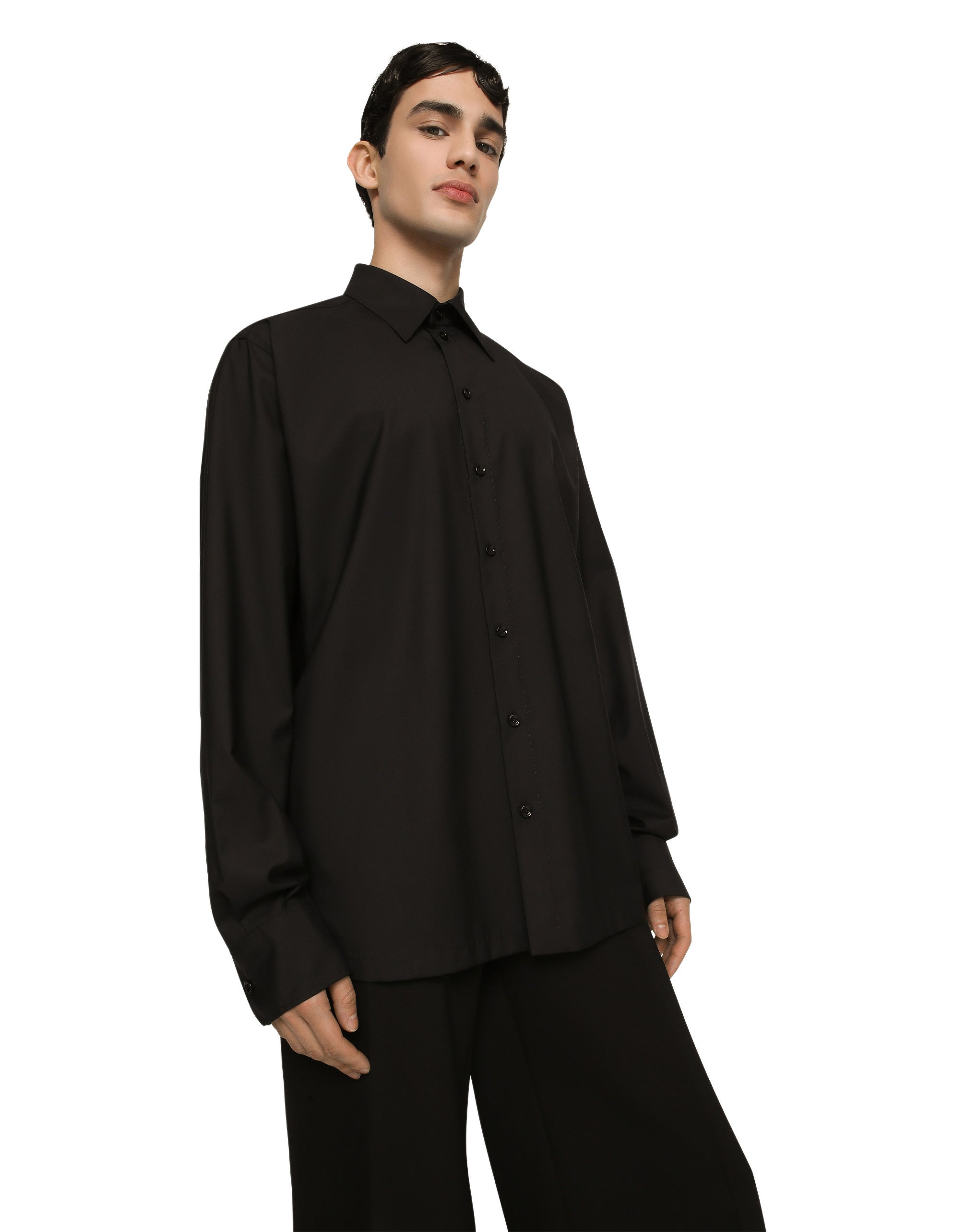 The pieces designed for FW23-24 represent the true essence of Dolce&Gabbana. They dominate with their pure volumes, tailored cut and new proportions. Coats, tops, white shirts, oversize pants, corset girdles and sash-bands that cinch the waist are reissues of the F/W 99-00 collection. Black, the absolute protagonist, which represents elegance, formality and seduction, has been translated into crystal embellishment that brings the wet volcanic stone of Etna and Stromboli to mind. Wool and silk shirt with satin undercollar and inner cuffs and metal Dolce&Gabbana logo tag: • Loose fit • Kent collar • Button fastenings • Long sleeves • Rear yoke with inverted pleat on hem • Black • The piece measures 78 cm from the rear collar seam on a size IT 40 • The model is 185 cm tall and wears a size IT 40 • Made in Italy