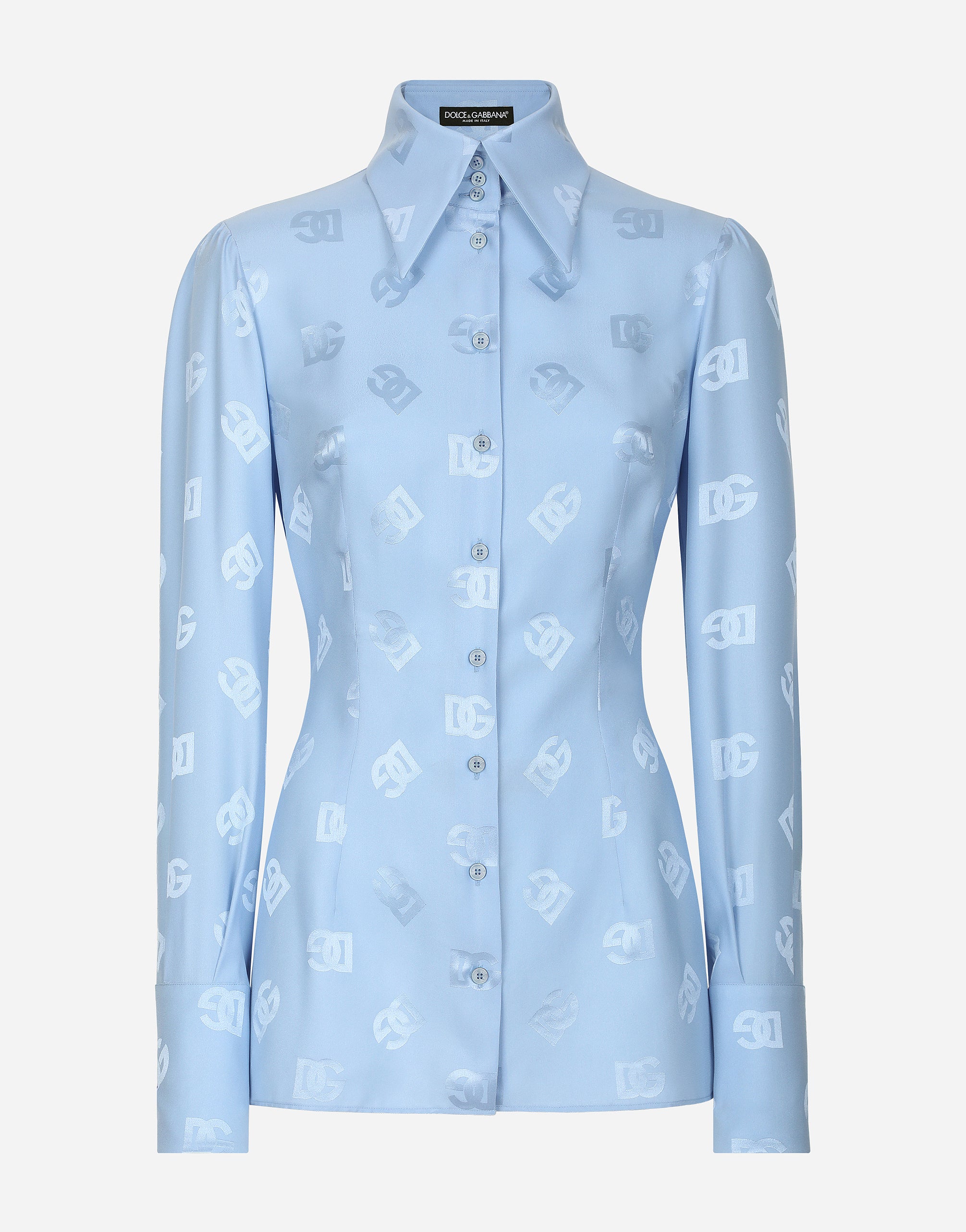 In the FW 24/25 DNA Collection, the rules of classic tailoring have been reworked with an innovative feel. New raschel weave techniques feature on micro-jackets and coats, and original textures are woven on trench coats, skirts, jacquard suits and shirts. The color palette made up of Nero Sicilia black, Milky White and Ocean Blue is also original. The iconic bags in fine nappa leather and “Pyton FC Machine” finish off the looks. Silk satin jacquard shirt with all-over DG logo: • Light blue • Long sleeves • Regular fit • Button fastenings with branded bottom edge • The piece measures 70 cm from the center back on a size IT 40 • The model is 175 cm tall and wears a size IT 40 • Made in Italy