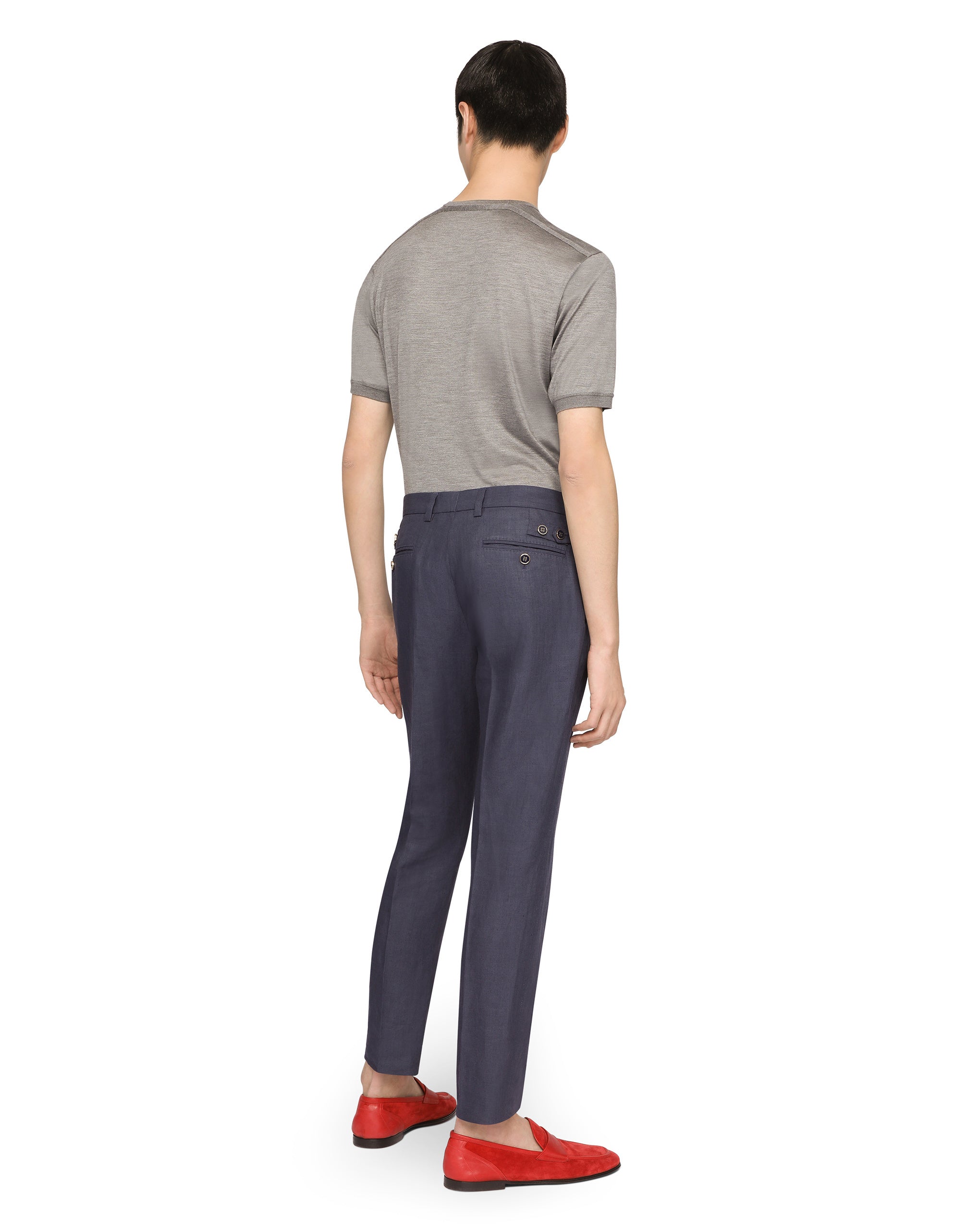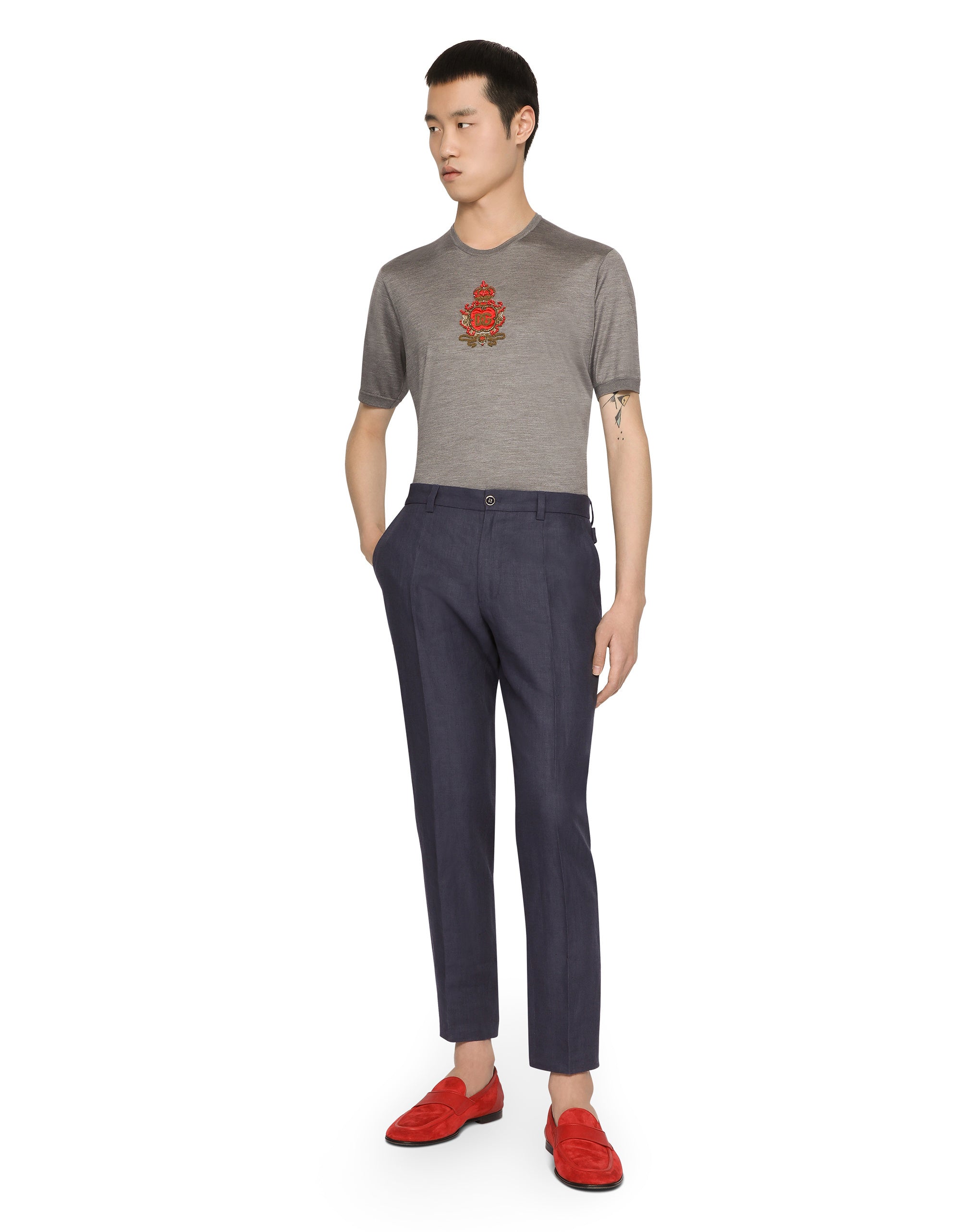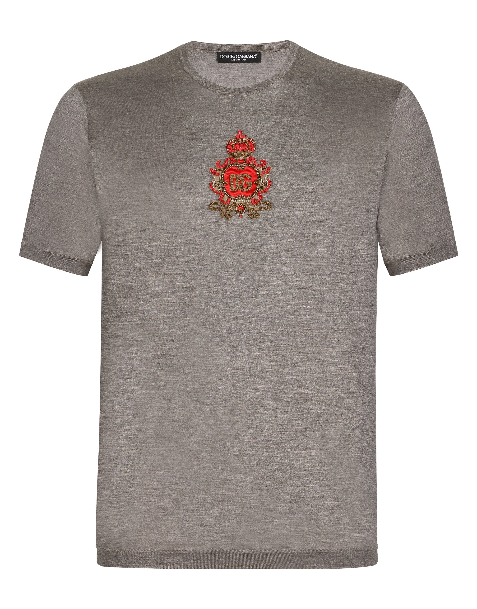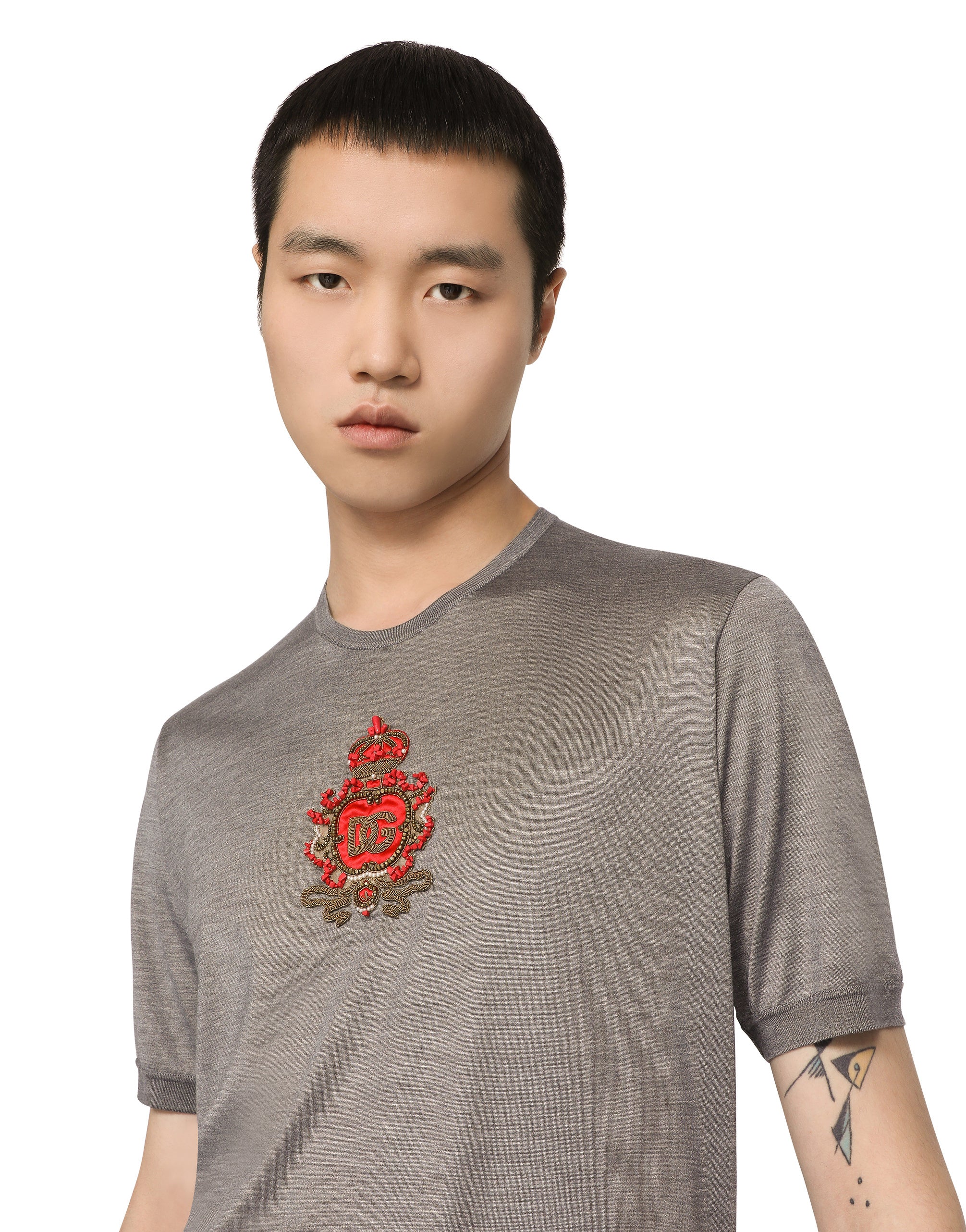 The “Corallo” Collection is a tribute to the sea, a place of freedom, and to red coral especially, which is rich in aesthetic and symbolic potential. Printed fabrics and silks come in iridescent colors with clean silhouettes that emphasize masculine sensuality. Silk jersey melange T-shirt with heraldic DG patch. • Regular fit • Round neck • Short sleeves • The piece measures 72 cm from the rear collar seam on a size IT 48 • The model is 185 cm tall and wears a size IT 48 • Made in Italy