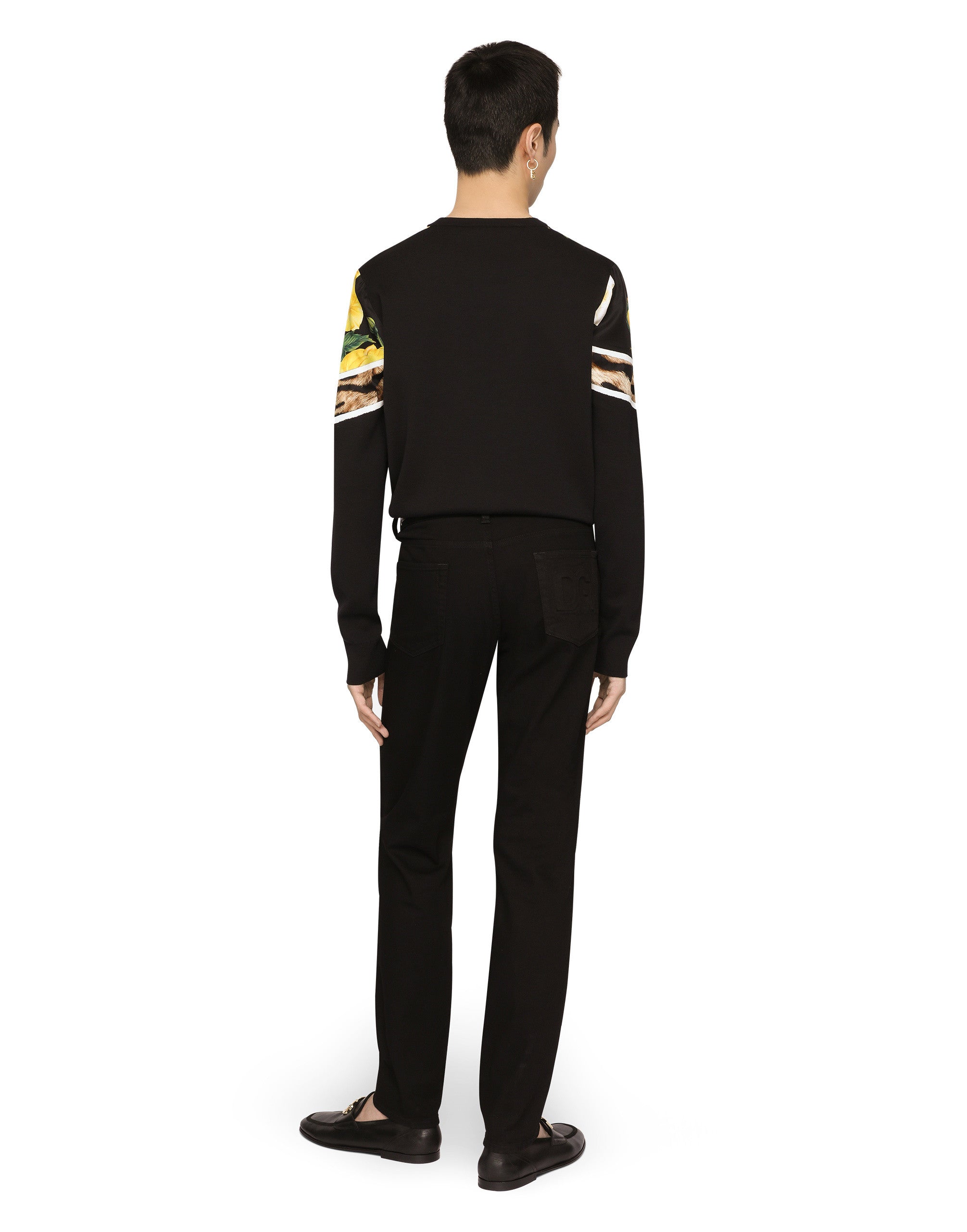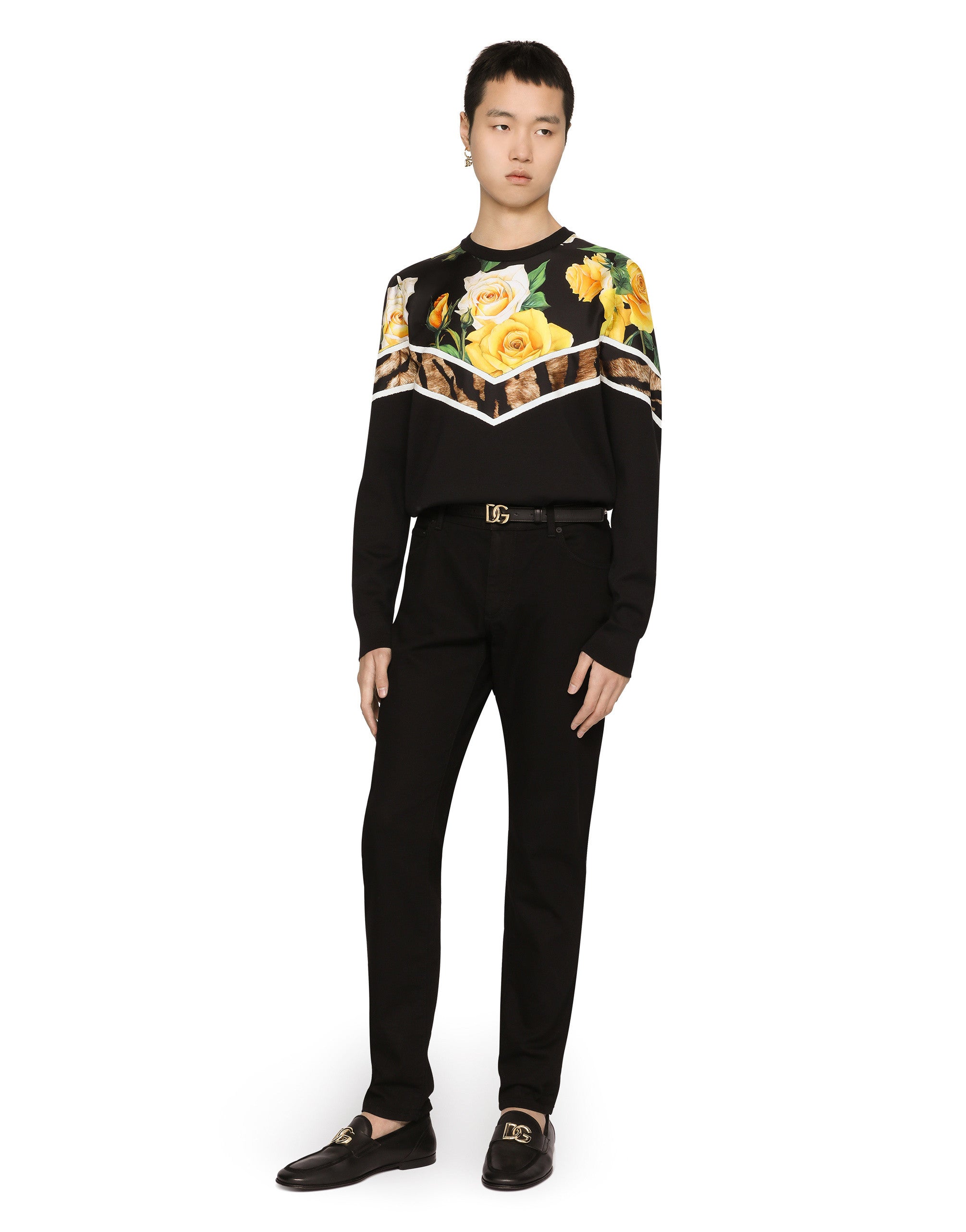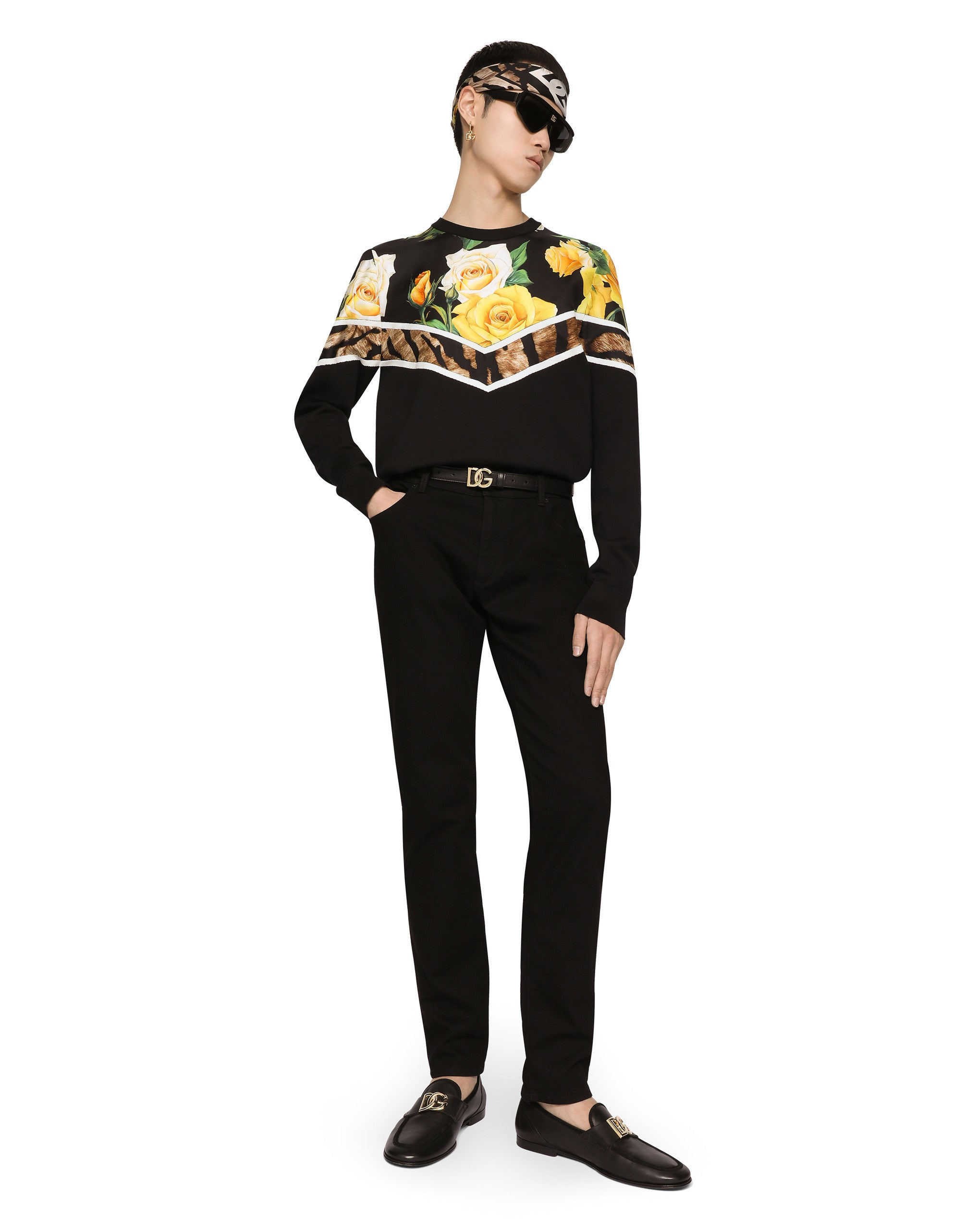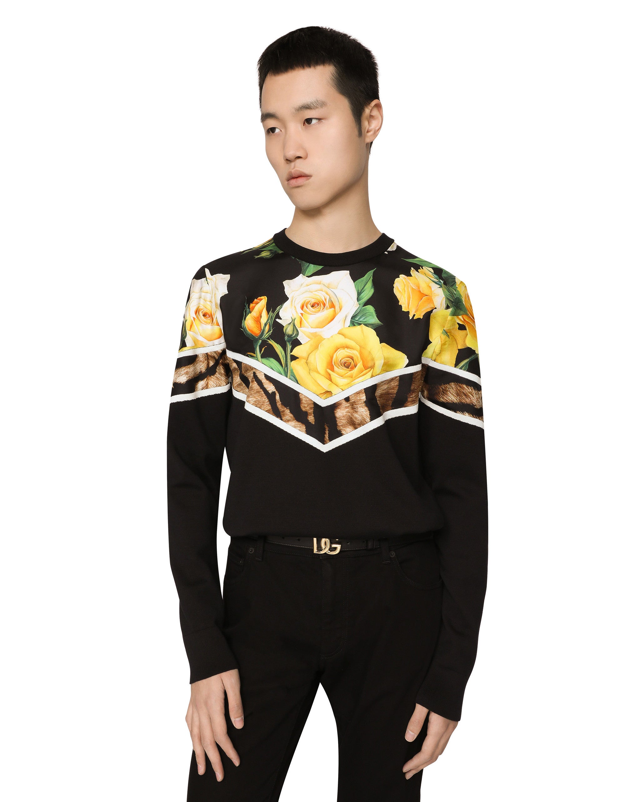 The “Eden Secret Garden” Collection represents a tribute to joie de vivre and socializing. Vibrantly-colored floral prints mix with animal prints and fine embroidery to create unique and eccentric pieces that are full of personality. Silk round-neck sweater with printed twill inserts. • Regular fit • 18-gauge plain knit • The piece measures 71 cm from the shoulder seam on a size IT 48 • The model is 185 cm tall and wears a size IT 48 • Made in Italy