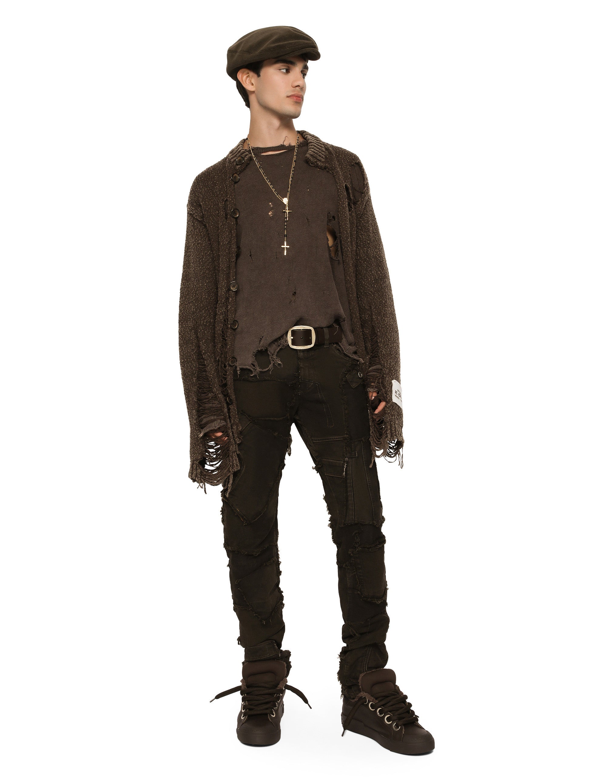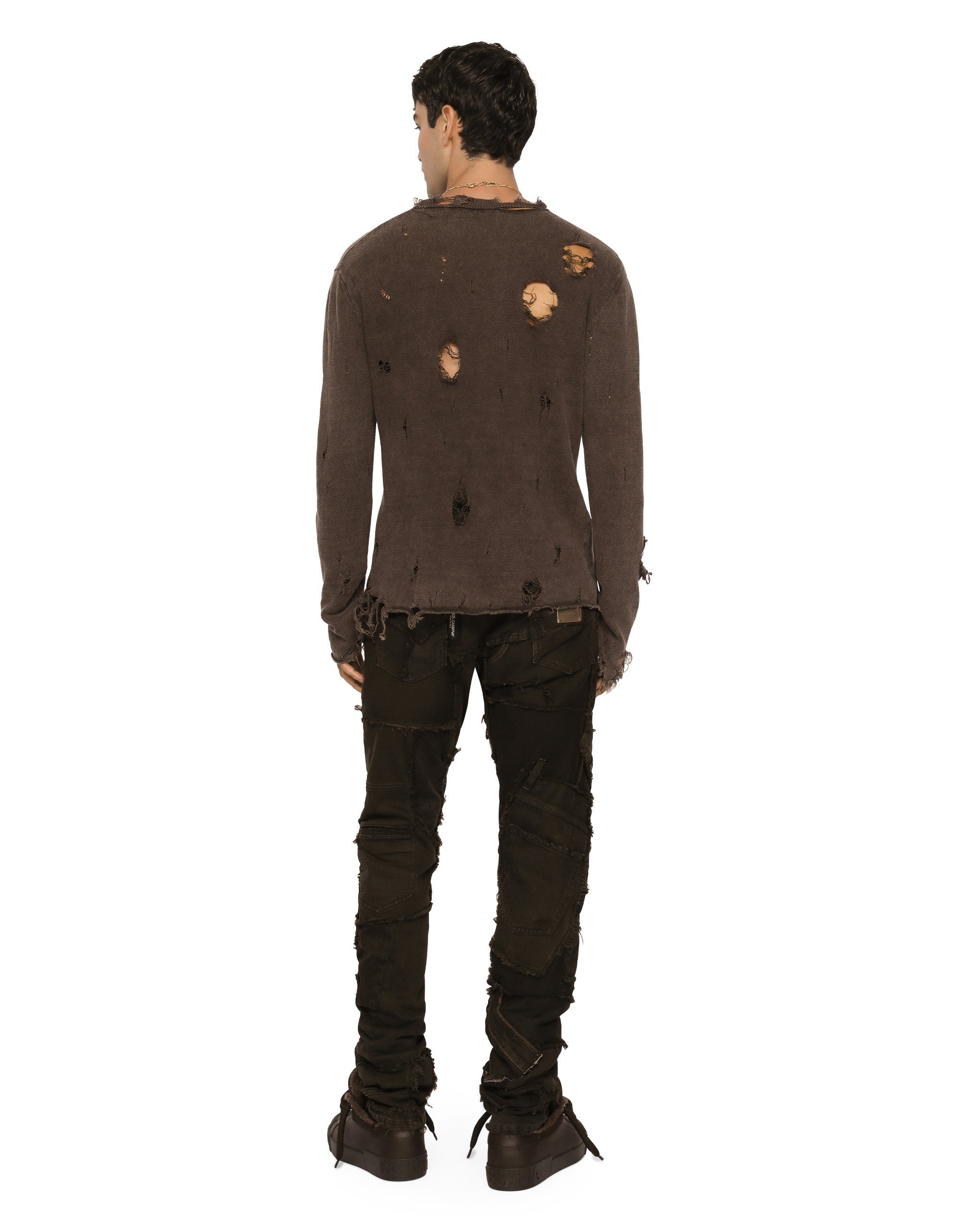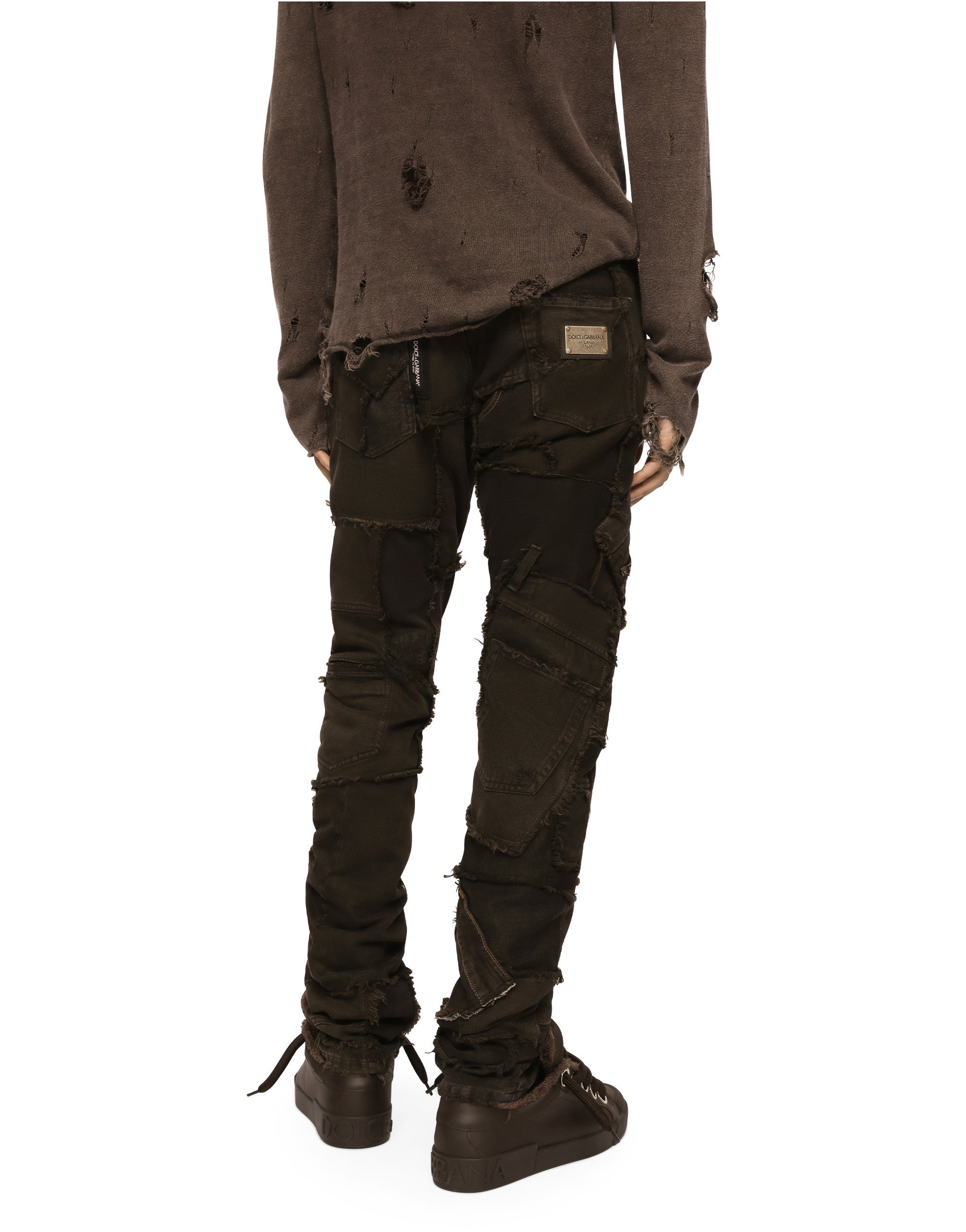 In the “Re-Edition” Fashion Show, the timeless looks from Dolce&Gabbana’s archives were back on the catwalk to create a “re-edited” collection, where the concept of contemporaneity starts from a past that is still a present filled with identity and uniqueness. Thus the Re-Edition label embellishes a few pieces, showing the year the archival garment that inspired it was created. Five-pocket slim-fit jeans in overdyed stretch patchwork denim: • Regular fit • Fly-covered zipper and button fastening • Vintage metal Dolce&Gabbana logo tag on the back • The item measures 105 cm on the outer leg and the hem is 17 cm wide on a size IT 48 • The model is 185 cm tall and wears a size IT 48 • Made in Italy
