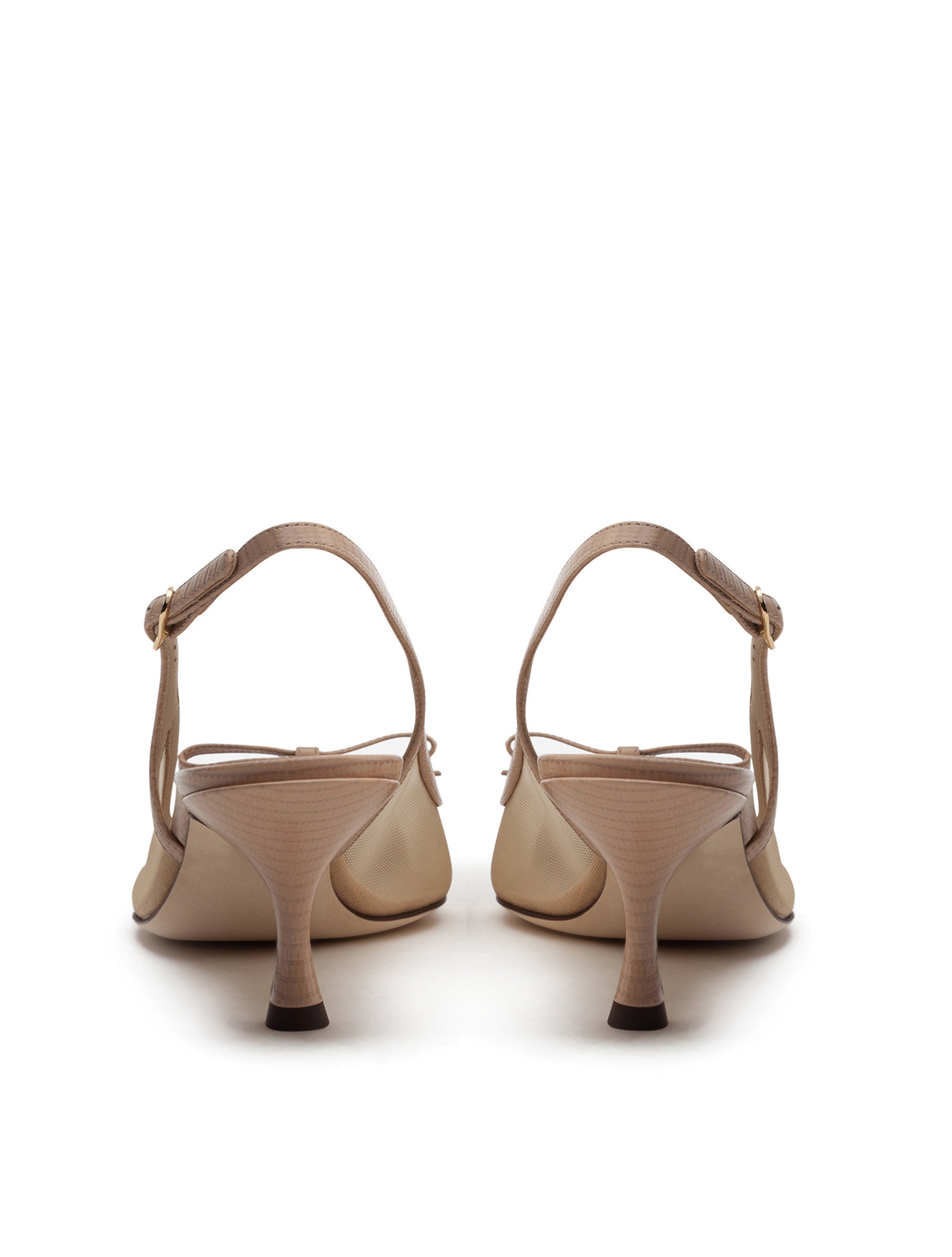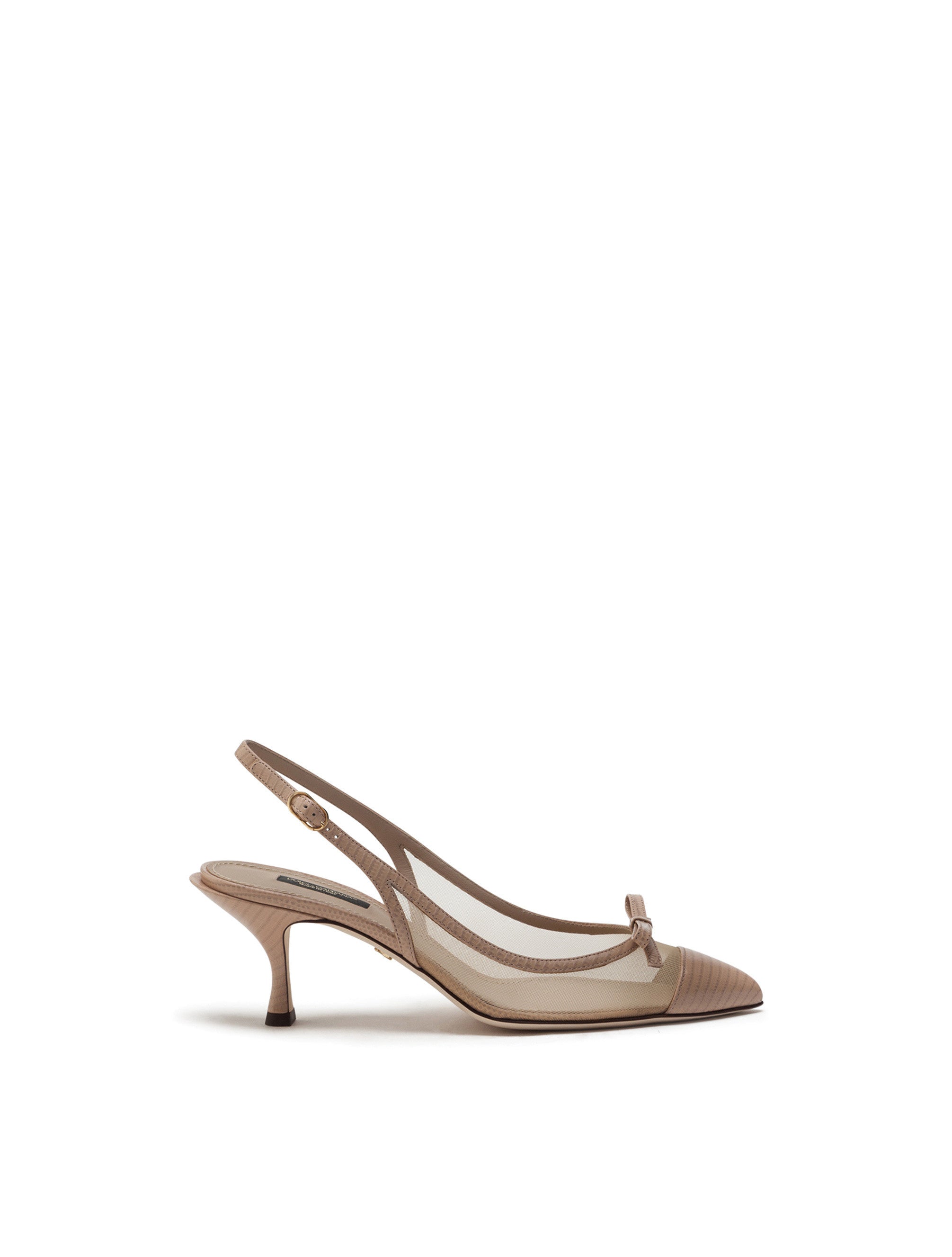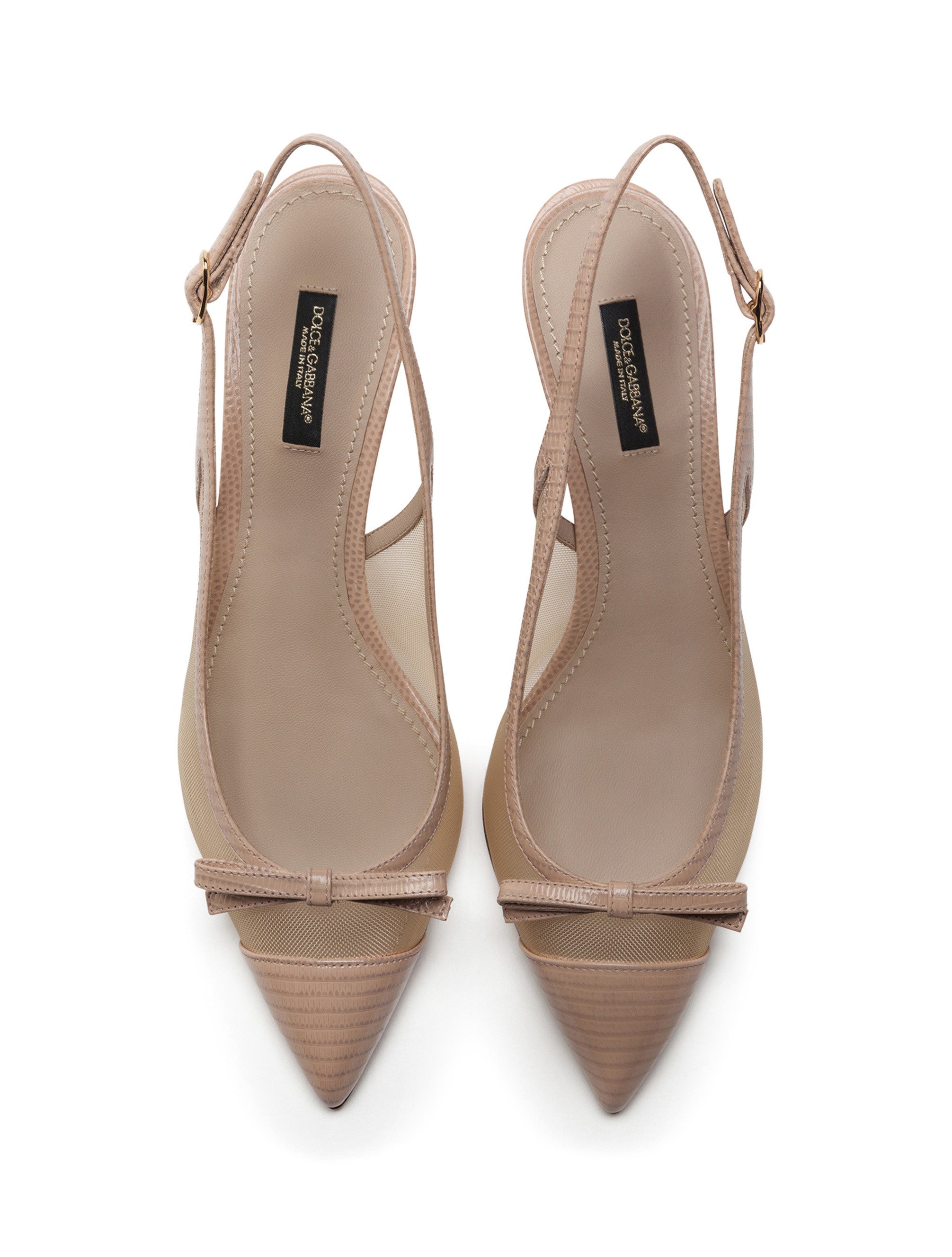 The Lori Slings Backs, by now a symbol of the iconic lines of Dolce&Gabbana, are made of mesh and iguana print leather with a small bow appliqué on the upper. With a feminine and elegant shape, they are made in the nude shade that is perfectly paired with the geranium print on a pink background presented in the collection: • Heel wrapped in iguana print leather 60mm- 2.3 inches • Adjustable strap on the back with galvanic light gold buckle • Leather insole with logoed label • Polished leather bottom with logo detail • Packaging in theme with the product • Made in Italy External Composition: 73% Calfskin 27% Nylon Internal Composition: 100% Calfskin