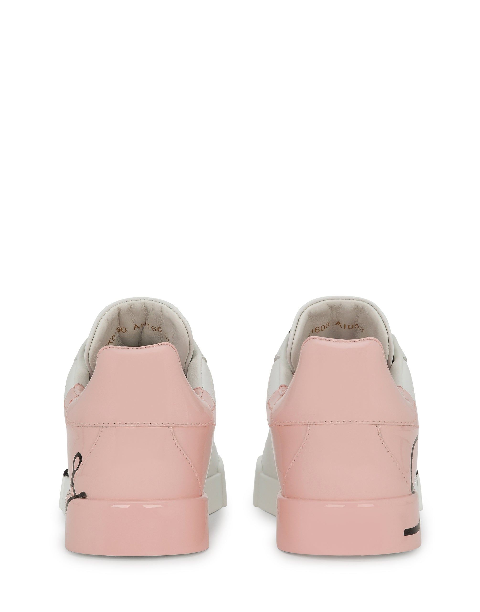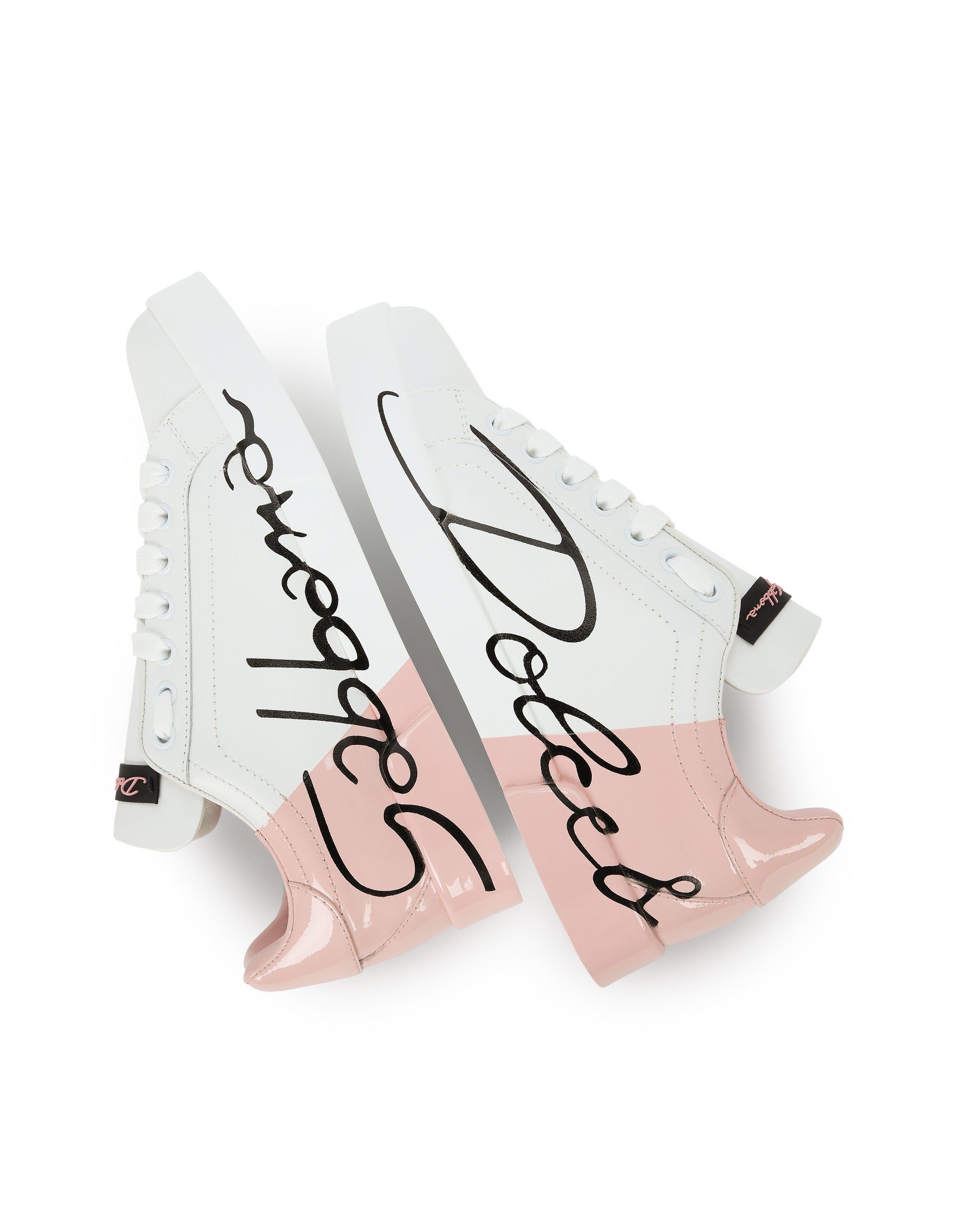 Choose your new sneakers. Unique and fun! Portofino sneakers in calfskin nappa with patent leather detail and logo print: • Calfskin upper with rubberized branded label • Flat laces • Calfskin footbed with branded label • Branded rubber sole • Item comes with themed packaging • Made in Italy External composition: 100% Calfskin Internal composition: 80% Calfskin 10% Sheepskin 5% Natural Rubber 5% Polyester