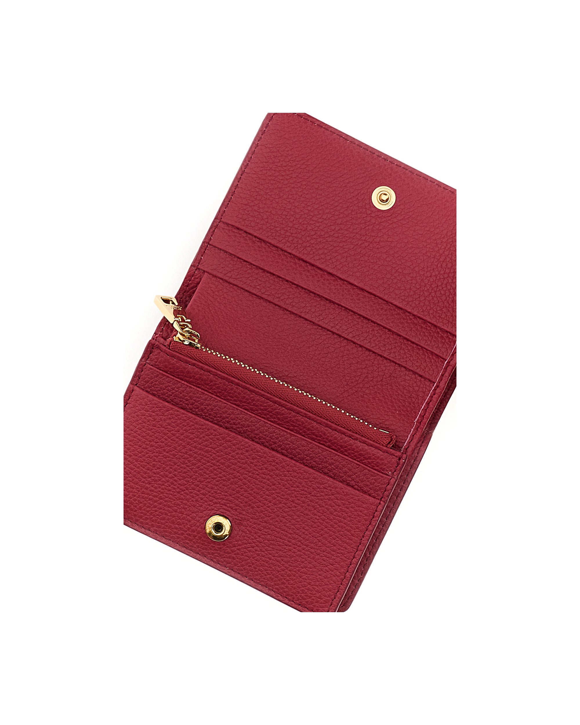 Women's wallet in solid-coloured drummed calf leather, inner credit card slots, zipped coin pocket, fastening with flap and press stud, logo lettering at the front.