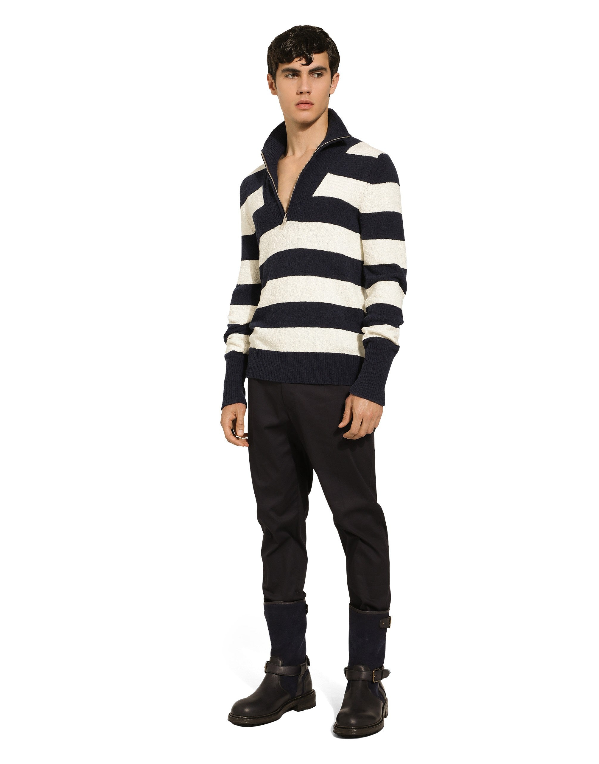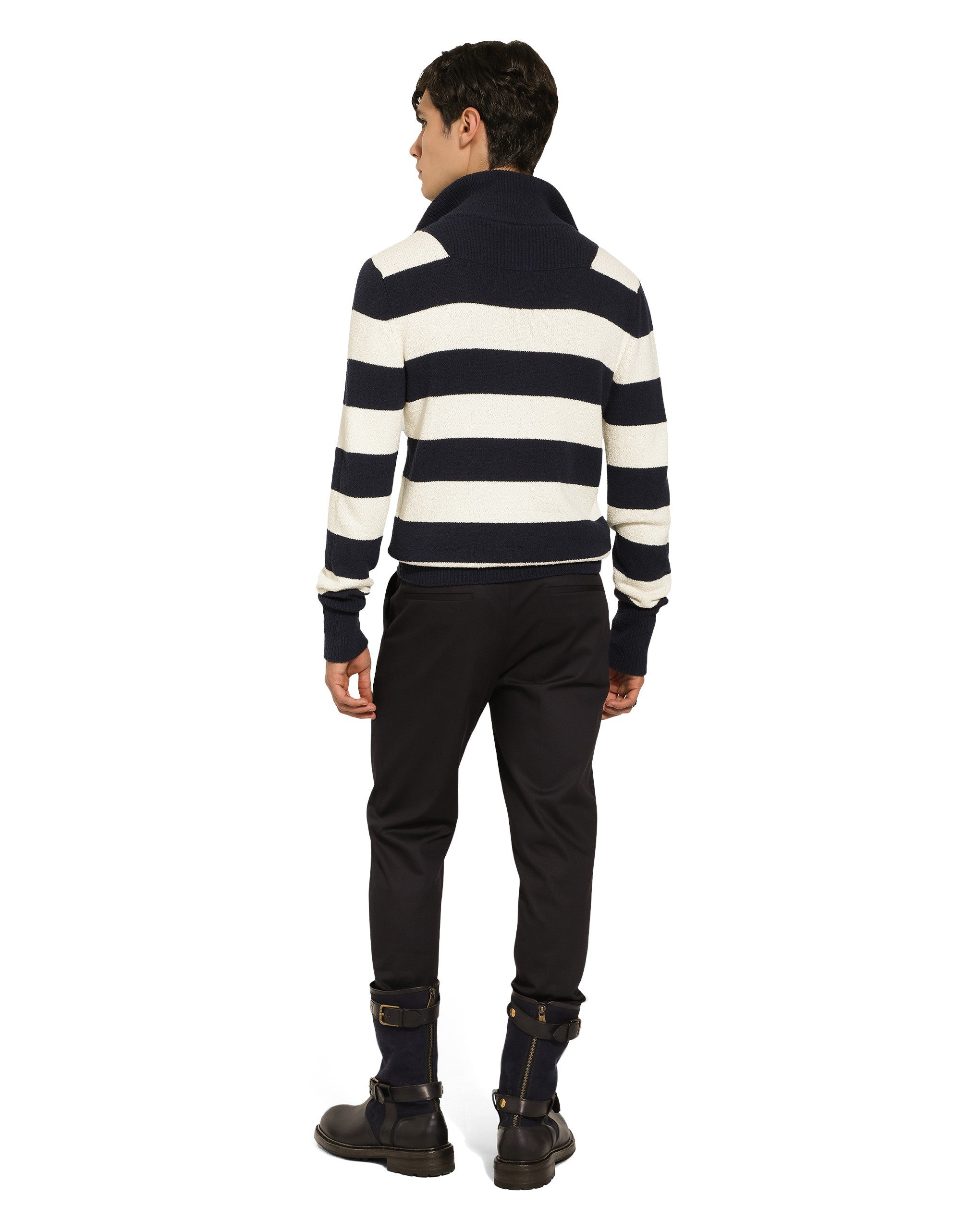 The Marina line has us dreaming of the Mediterranean sea and its myriad shades of blue, while also bringing weathered sailors to mind, yet with a contemporary edge. Aesthetic influences and clear lines, stormy sea blue jackets, multi-pocket pieces, waterproof garments, anchor prints and materials that invite us to discover the “lighthouse keeper”. Fascinating, enigmatic and at times lonely, it tells the tale of a new masculine sensuality built with small yet precise proportions and attention to stylish detail. Tailored stretch cotton pants with DG hardware: • Blue • Regular fit • Belt loops on the waist • Fly-covered zipper and button fastening • Front slant pockets and welt back pockets • The item measures 99 cm on the outer leg and the hem is 17 cm wide on a size IT 48 • Made in Italy