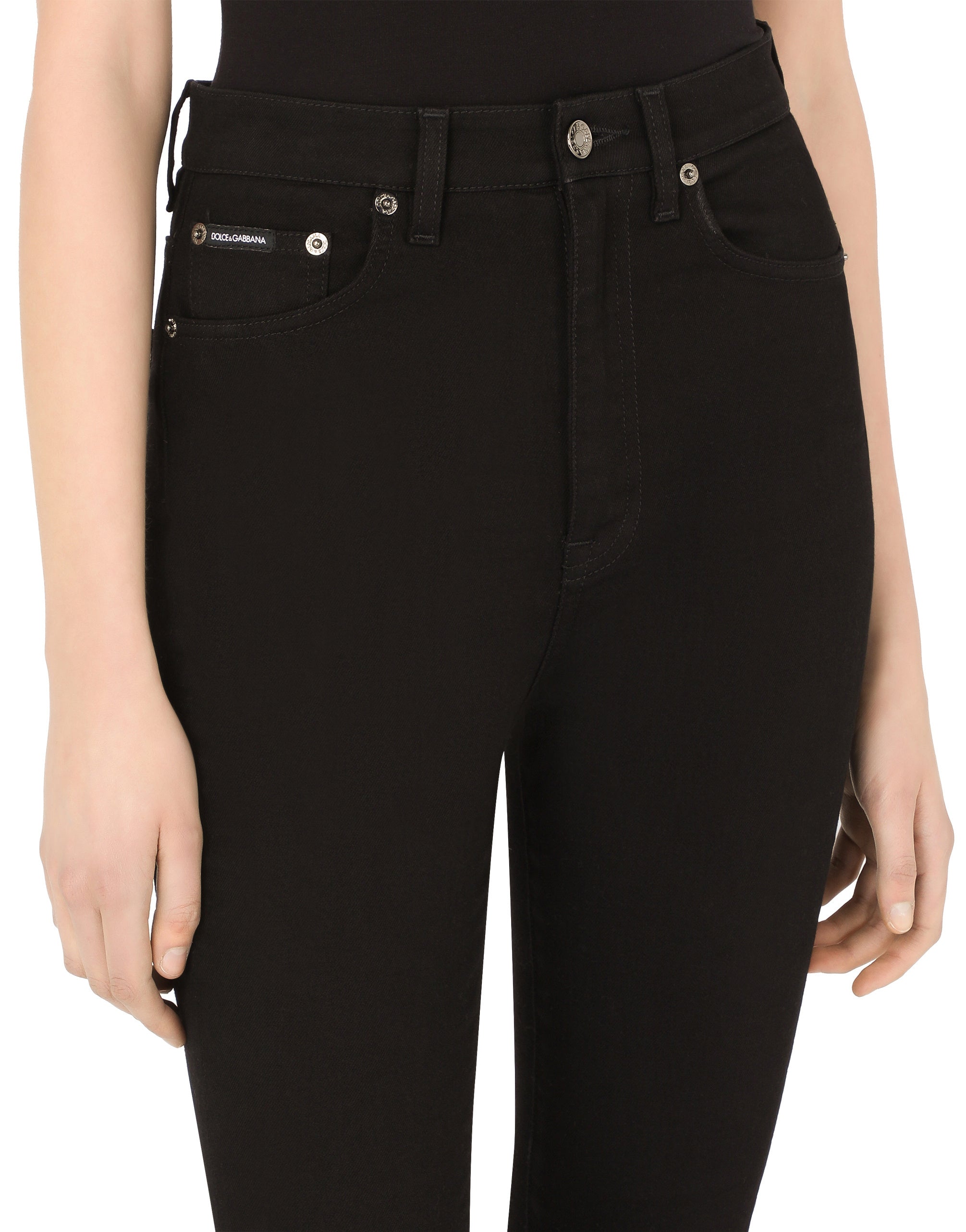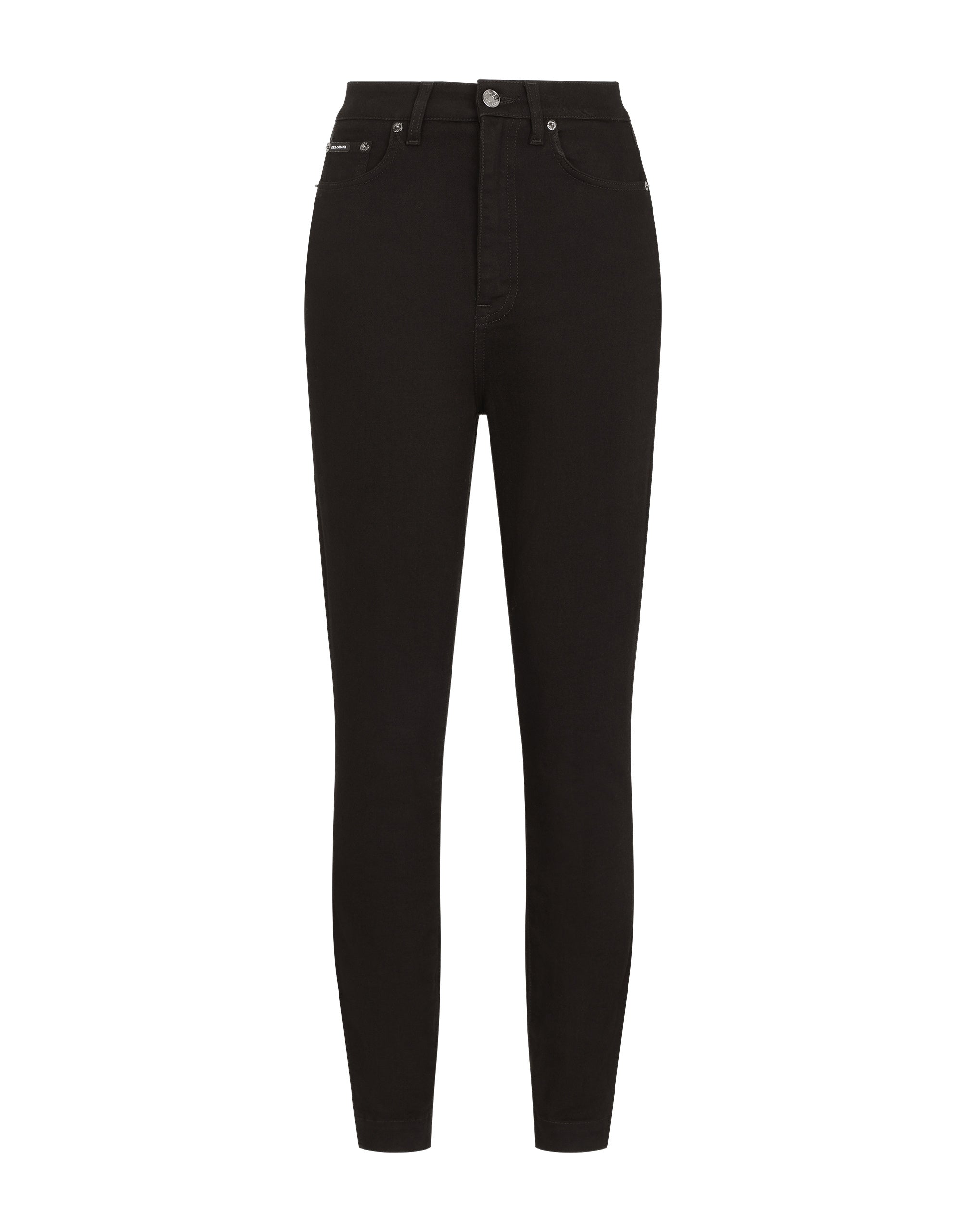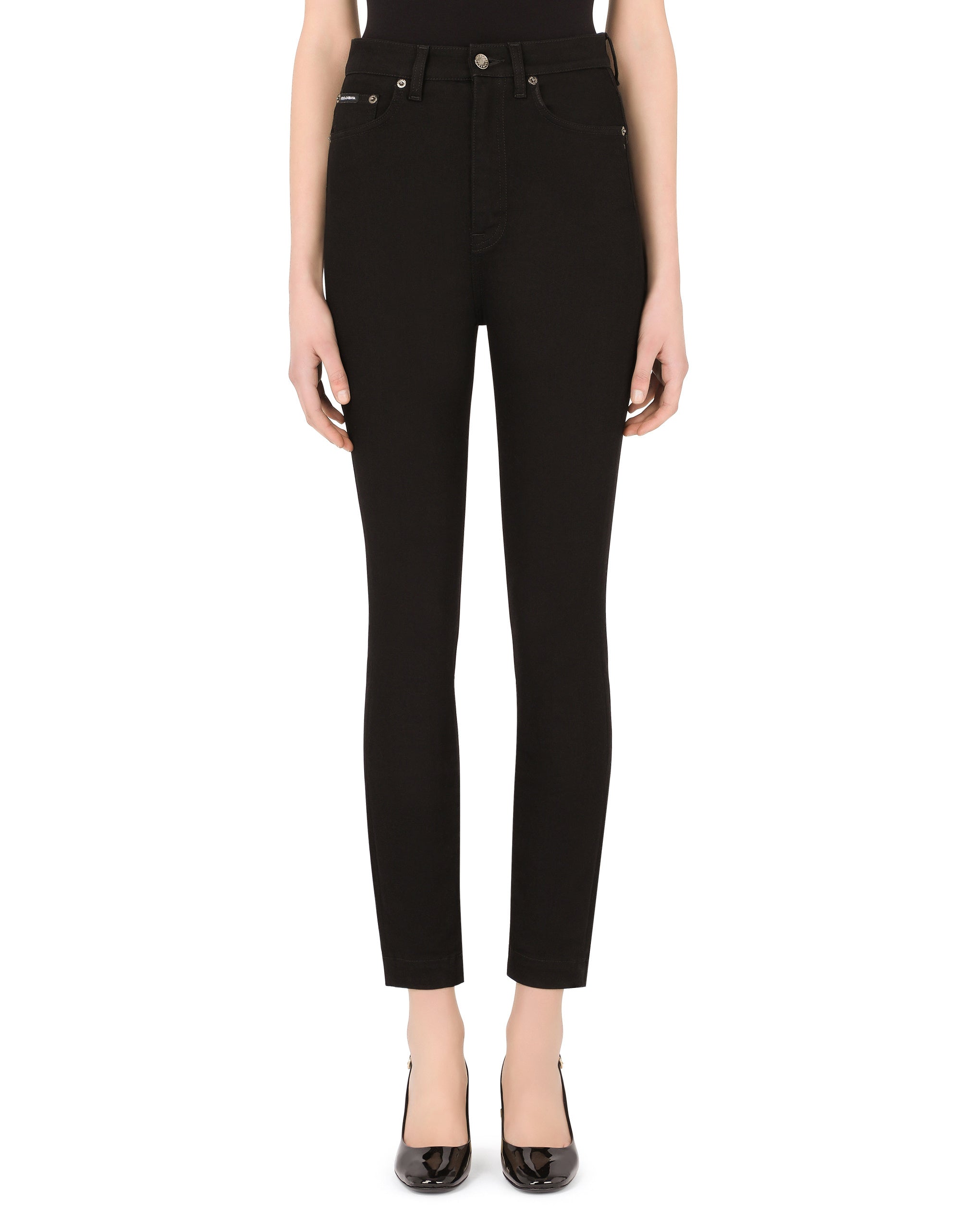 Dark blue, skinny fit, high-waisted, super-stretchy, these jeans have all the makings to become your favorite pair of five-pocket jeans that will perfectly adapt to any of your looks. • Dolce high waist • Branded fabric label on the coin pocket • Branded metal and leather plate on the back pocket • Inner leg. 72 cm - 28.3 inches • Crotch. 27.5 cm - 10.8 inches • Hem. 12.5 cm - 4.9 inches • Zipper and branded metal button fastening • The model is 175 cm - 68.9 inches tall and wears a size IT 40 • Made in Italy