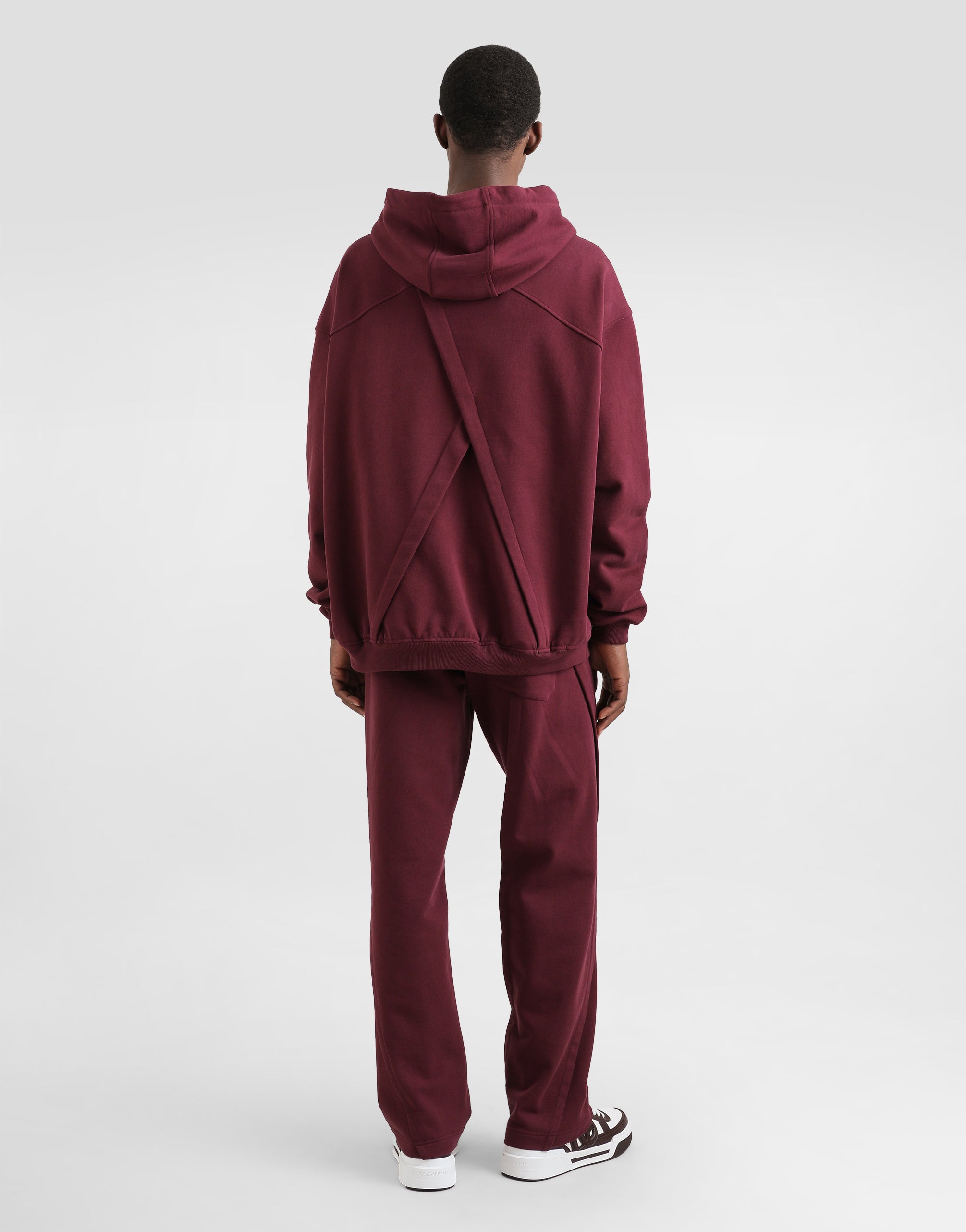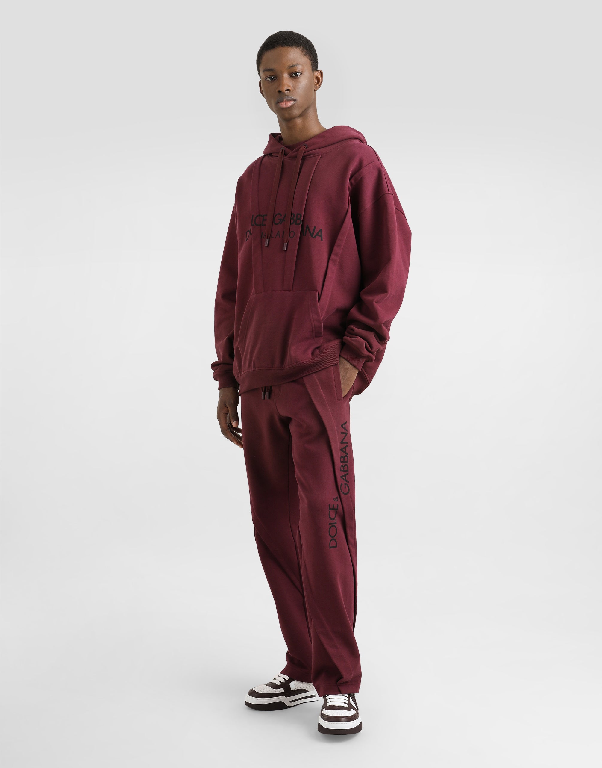 The DNA Men's Collection reimagines daily wear with bold contrasts, meticulous details, and innovative silhouettes. Outerwear stands out with clean lines and high-tech materials, merging sportiness with sophistication in sweaters, sweatshirts, and trousers. A striking color palette, including Black Sicily, caramel, cream, burgundy, and stone gray, pairs with iconic prints like Leopard and Polka dots, enhancing the collection's authentic and refined look. Stretch jersey jogging pants with Dolce&Gabbana logo label: • Burgundy • Drawstring fastening • Front slant pockets and a zipped back pocket • The item measures 105 cm on the outer leg and the hem is 22 cm wide on a size IT 48 • Made in Italy