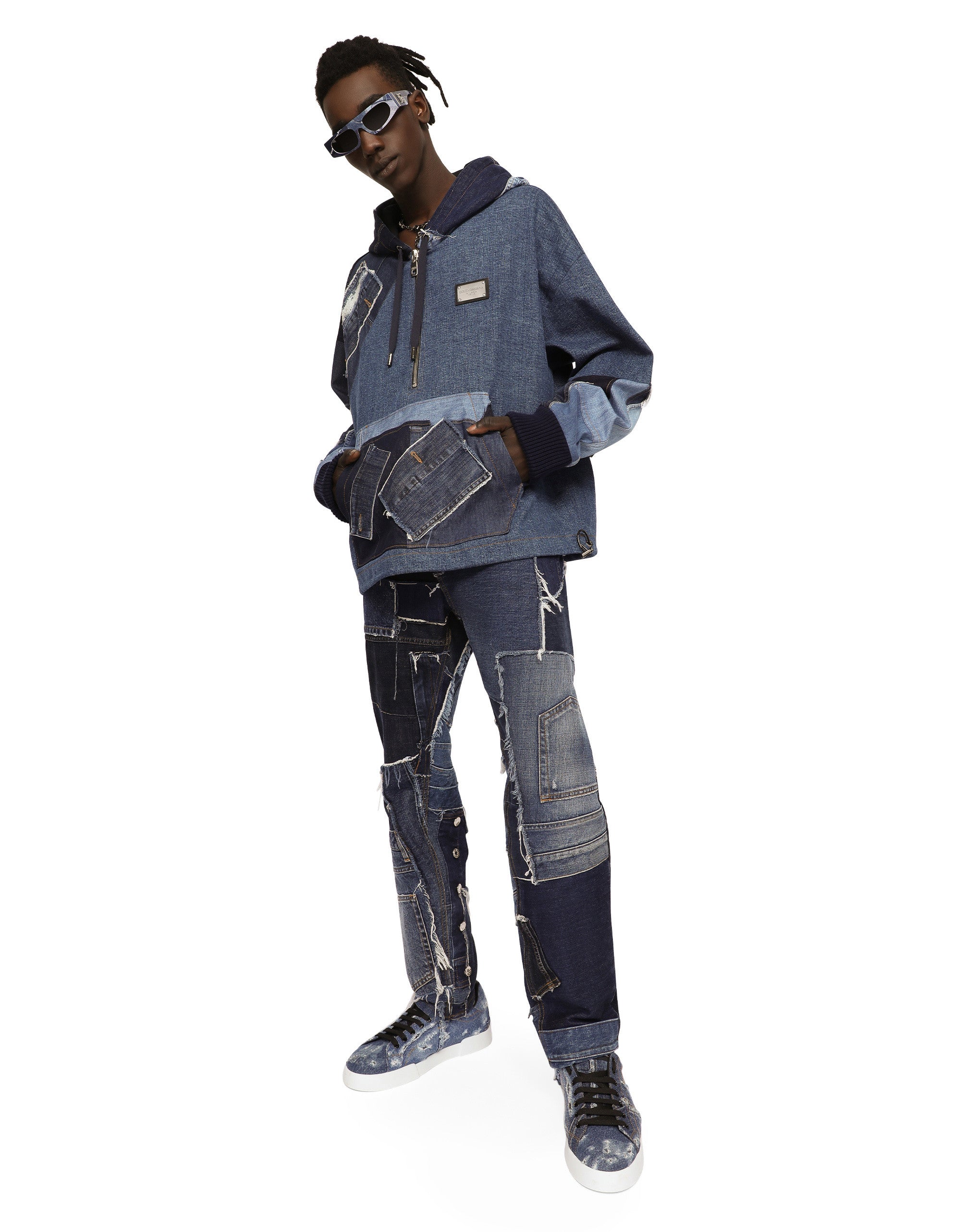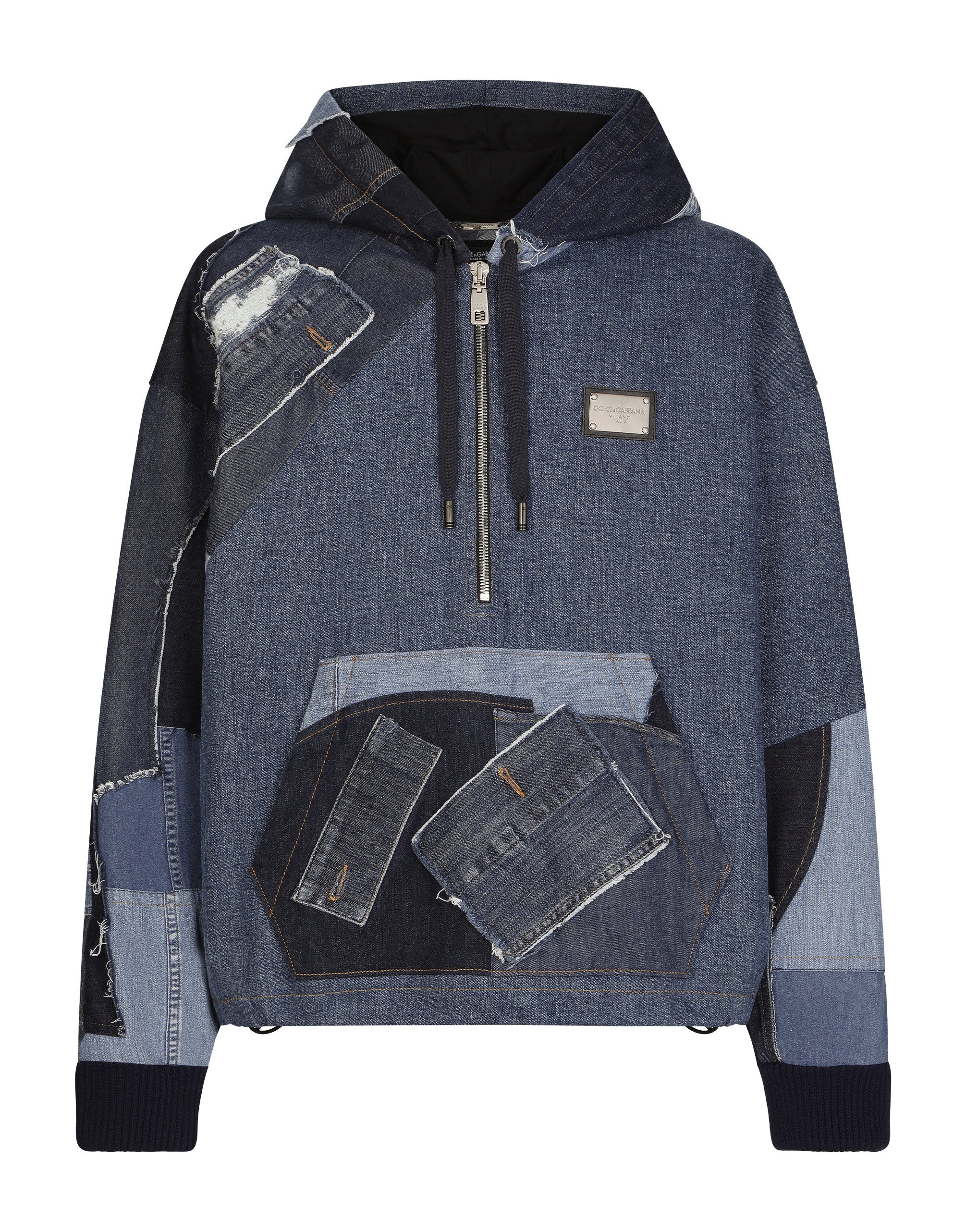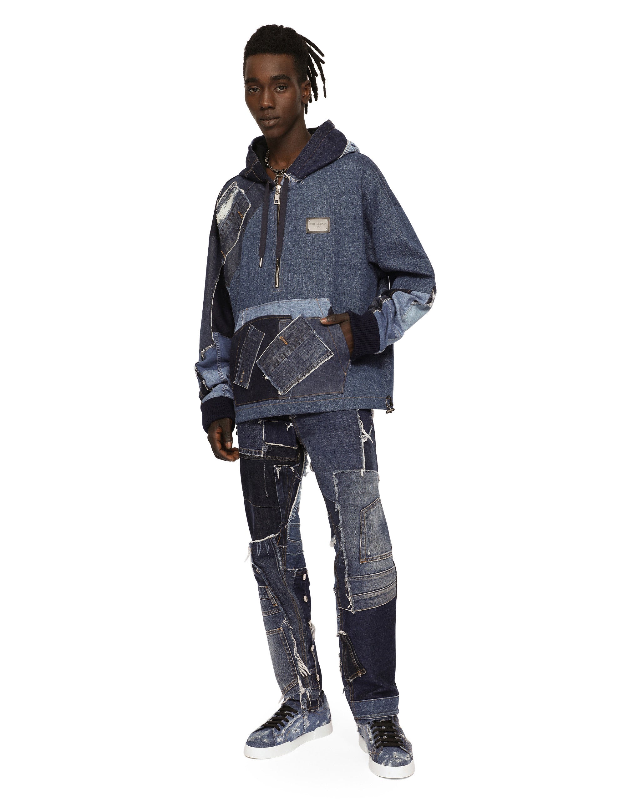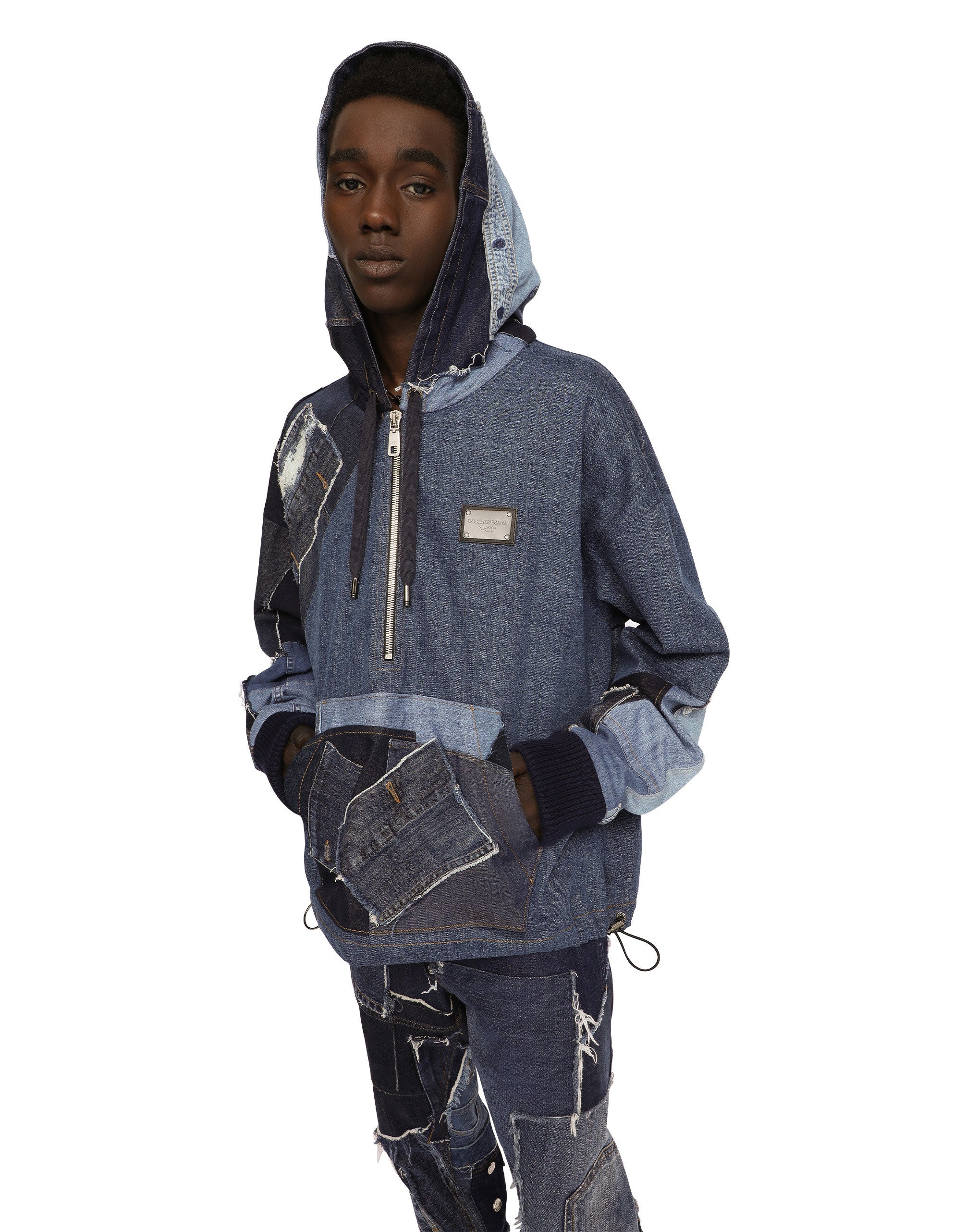 The “Denim” collection catapults us into a new reality of oversize looks, contrasting washes, raw-cut accents, patch details and layering. Denim, an ever-present staple of the everyday closet, has been broken down and reassembled in a contemporary way, complete with logo tag embellishment. Stretch patchwork denim hoodie with a metal tag featuring the Dolce&Gabbana logo: • Regular fit • Drawstring hood with branded metal aglets • Half-zip fastening on the front • Pouch pocket • Stretch knit cuffs • Drawstring hem • The piece measures 68 cm from the rear collar seam on a size IT 48 • The model is 185 cm tall and wears a size IT 48 • Made in Italy