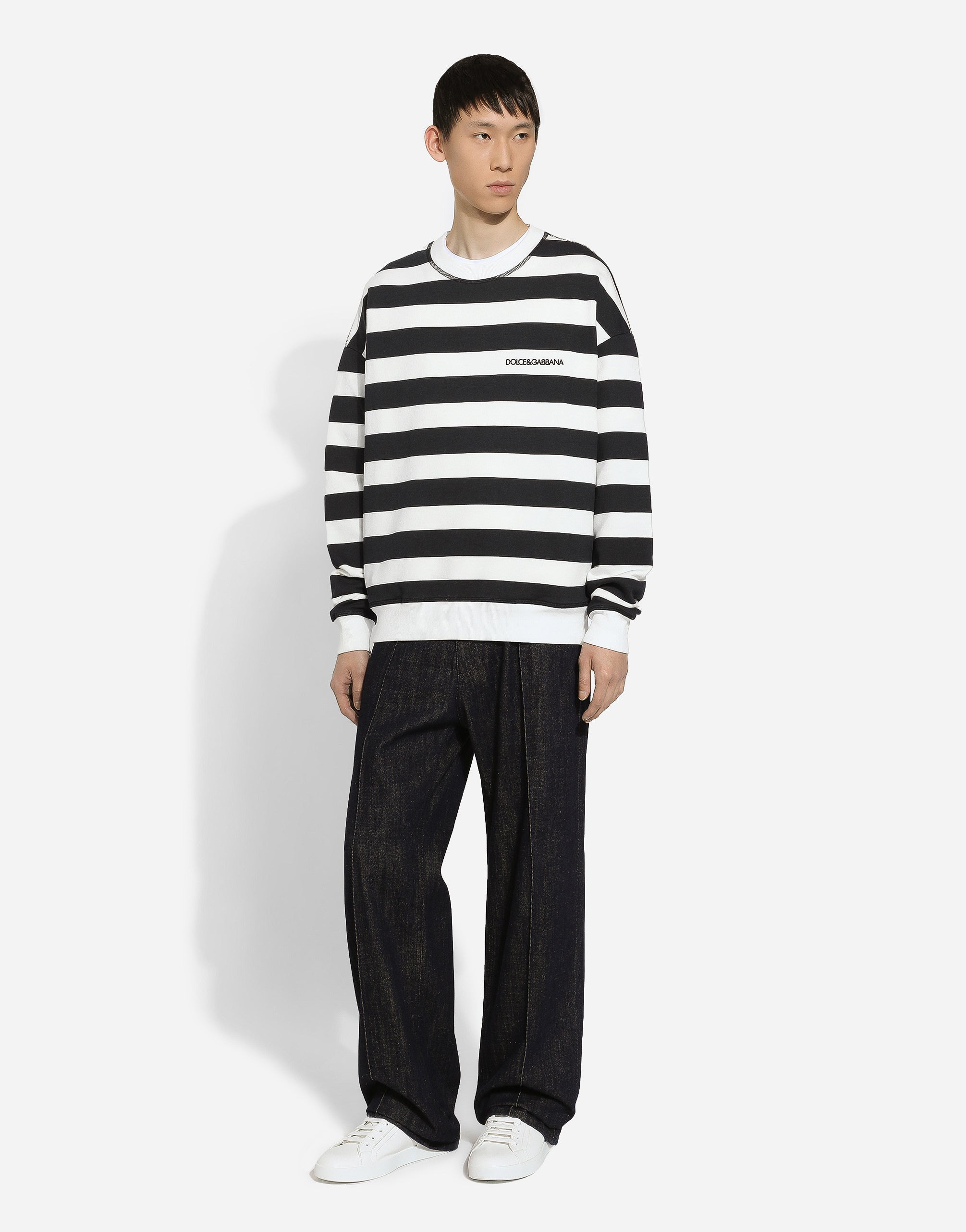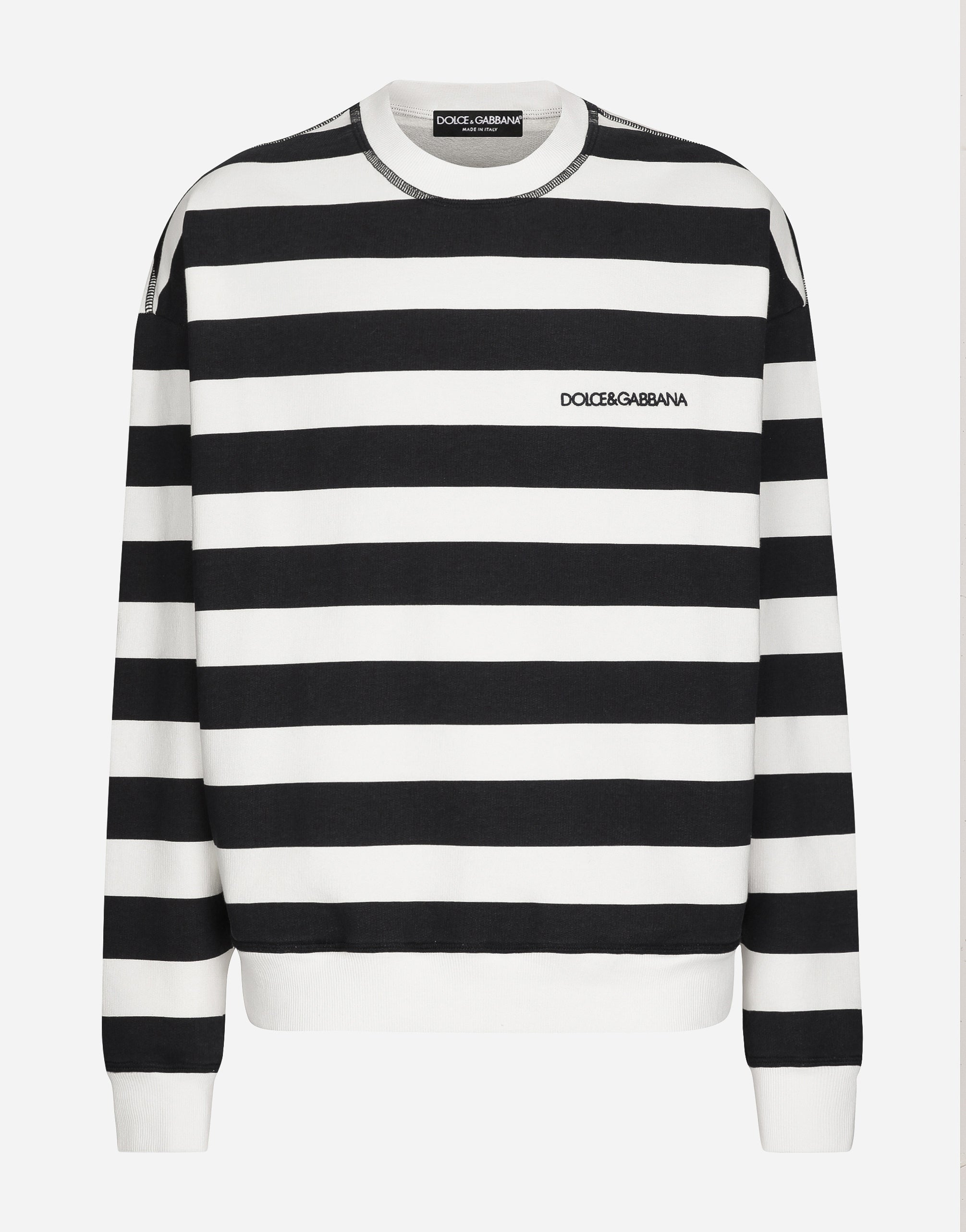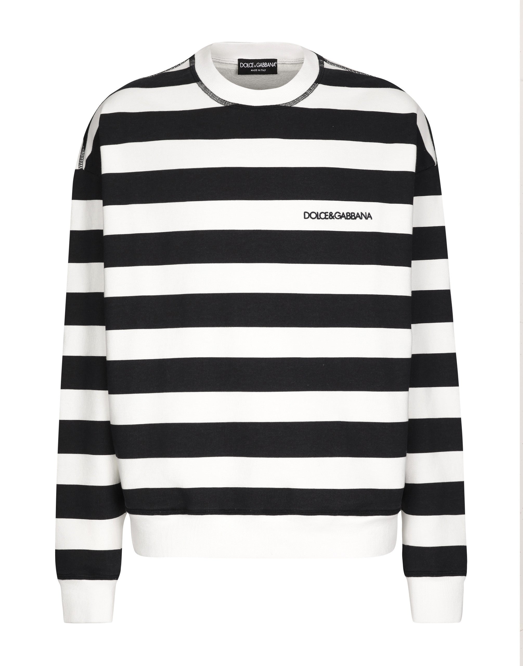 The Marina line has us dreaming of the Mediterranean sea and its myriad shades of blue, while also bringing weathered sailors to mind, yet with a contemporary edge. Aesthetic influences and clear lines, stormy sea Blue jackets, multi-pocket pieces, waterproof garments, anchor prints and materials that invite us to discover the “lighthouse keeper”. Fascinating, enigmatic and at times lonely, it tells the tale of a new masculine sensuality built with small yet precise proportions and attention to stylish detail. Striped cotton round-neck sweatshirt with Marina print: • White and blue • Oversize fit • Stretch knit hem, neck and cuffs • The piece measures 72 cm from the rear collar seam on a size L IT • Made in Italy