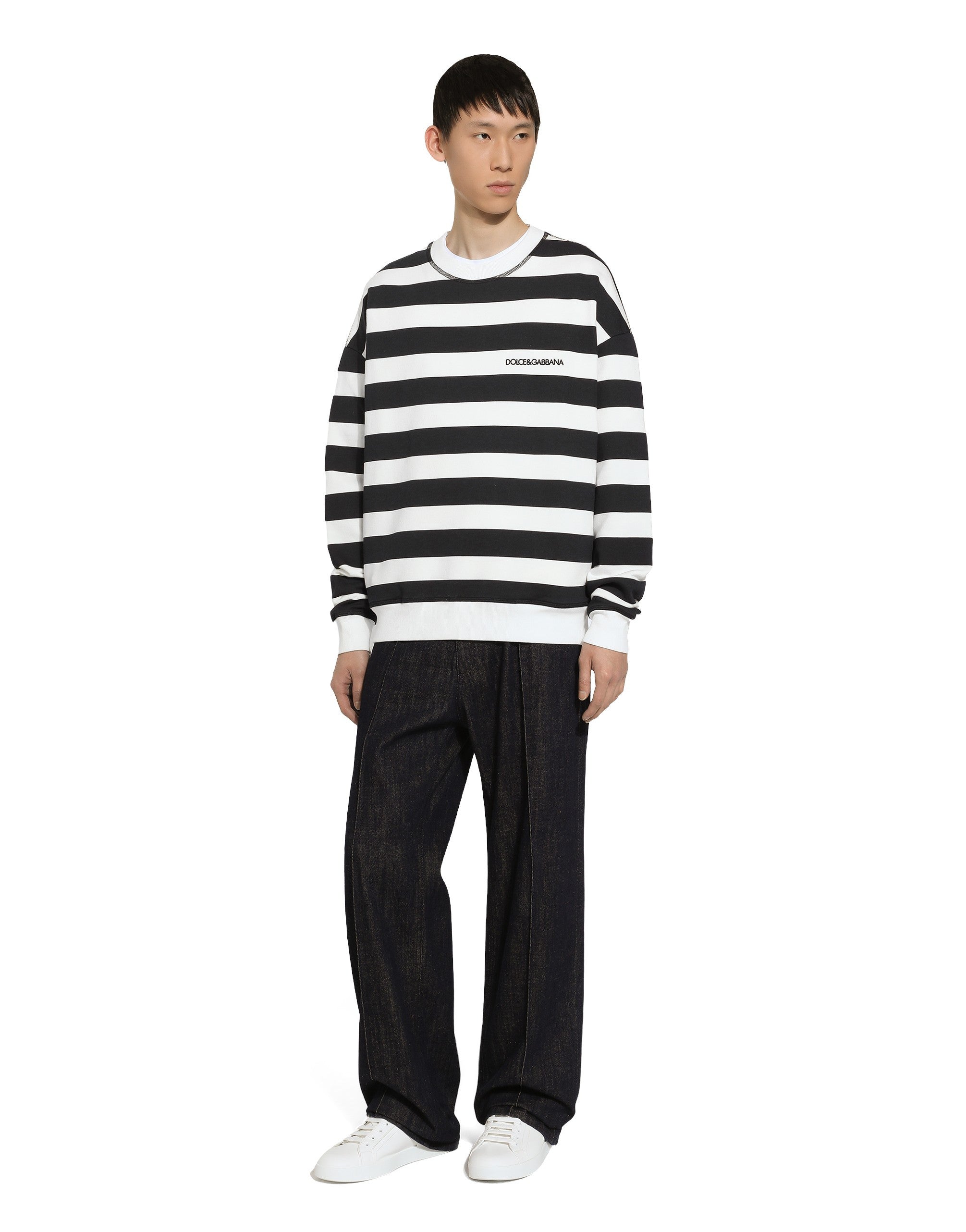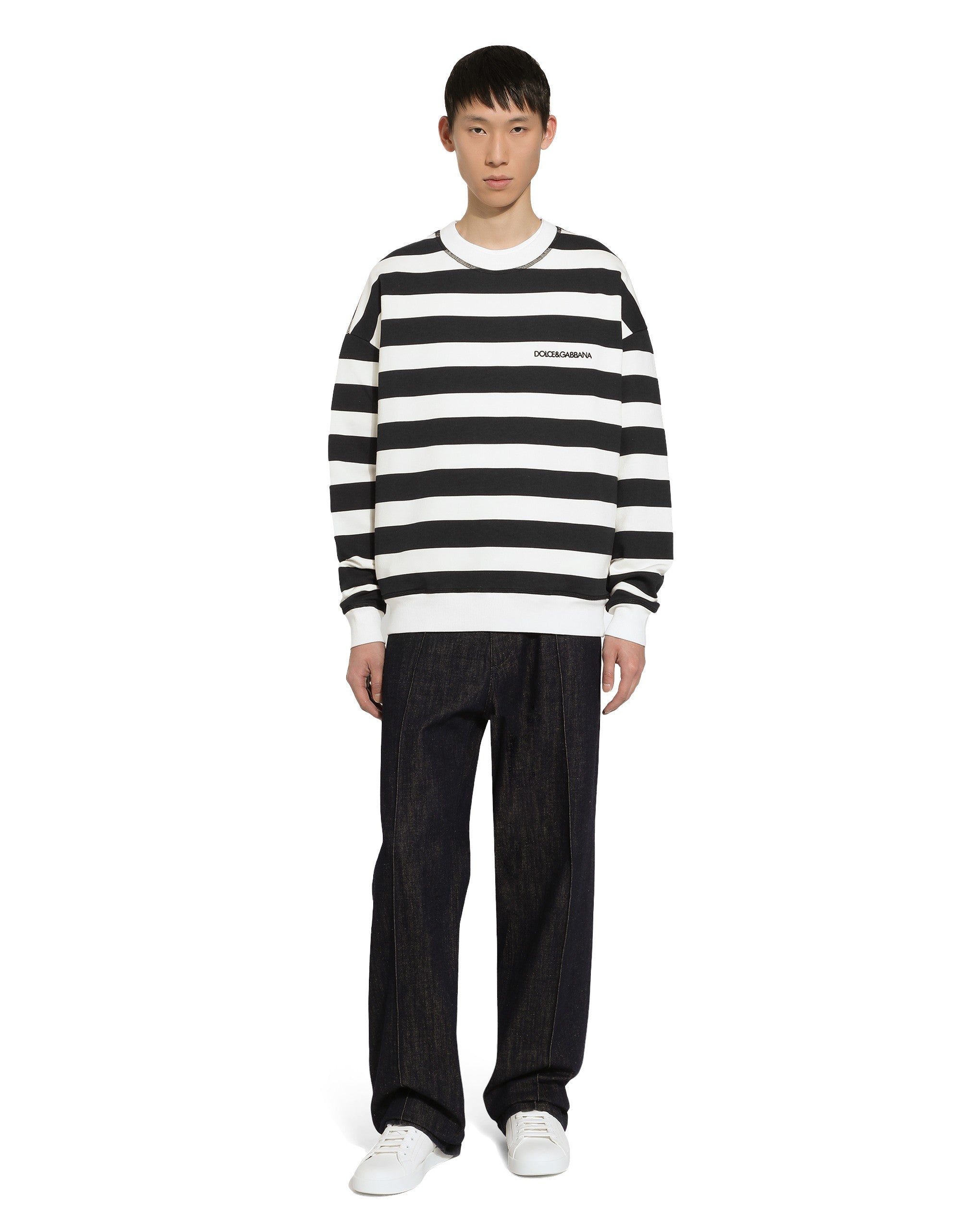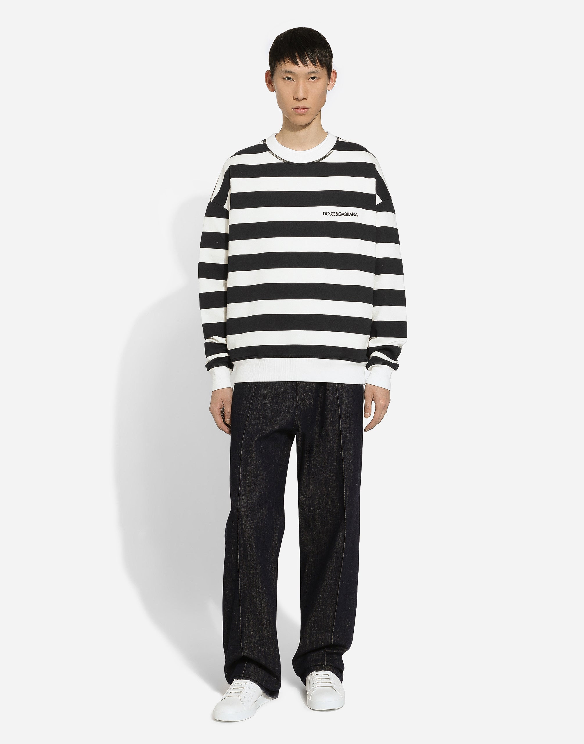The Marina line has us dreaming of the Mediterranean sea and its myriad shades of blue, while also bringing weathered sailors to mind, yet with a contemporary edge. Aesthetic influences and clear lines, stormy sea Blue jackets, multi-pocket pieces, waterproof garments, anchor prints and materials that invite us to discover the “lighthouse keeper”. Fascinating, enigmatic and at times lonely, it tells the tale of a new masculine sensuality built with small yet precise proportions and attention to stylish detail. Striped cotton round-neck sweatshirt with Marina print: • White and blue • Oversize fit • Stretch knit hem, neck and cuffs • The piece measures 72 cm from the rear collar seam on a size L IT • Made in Italy