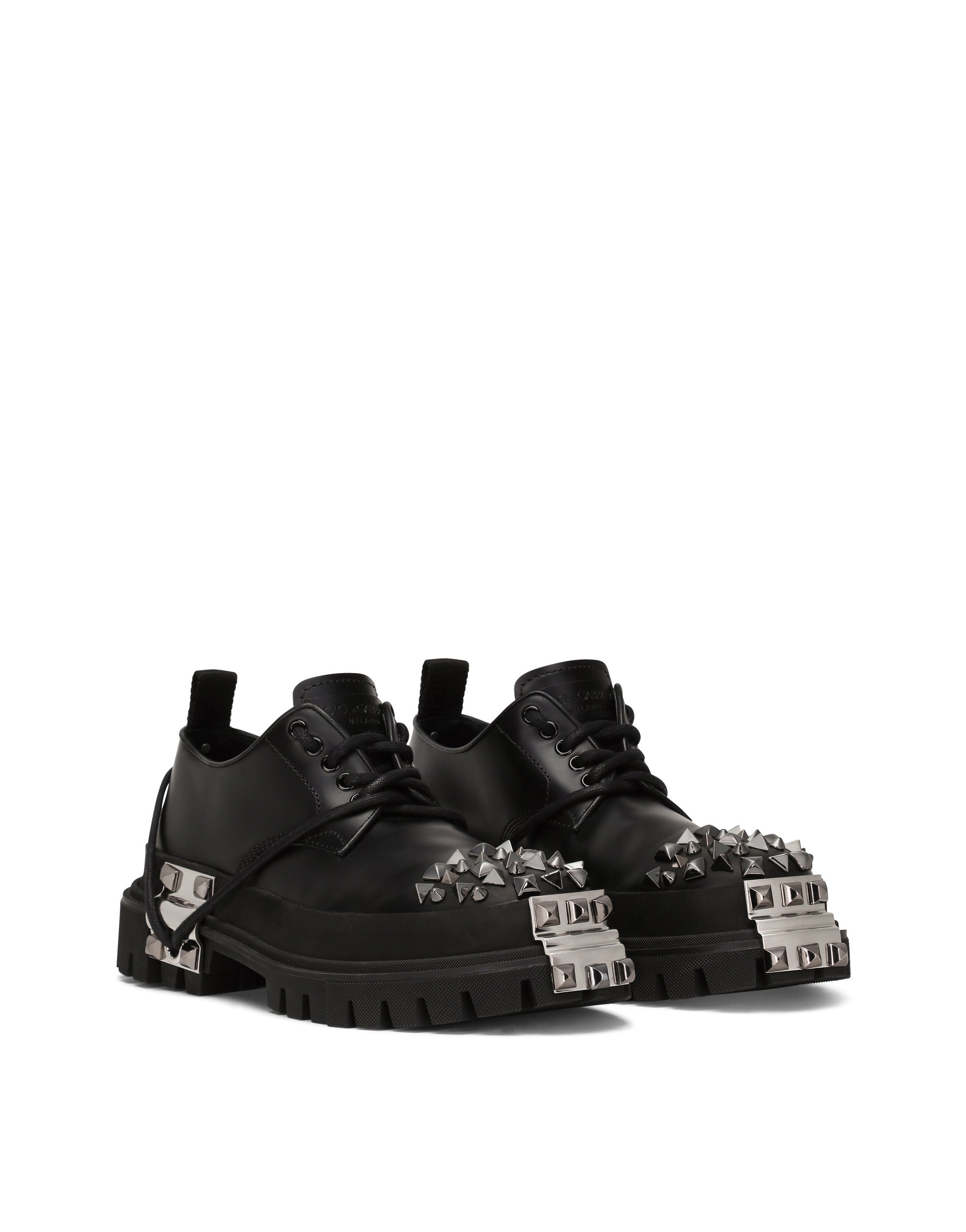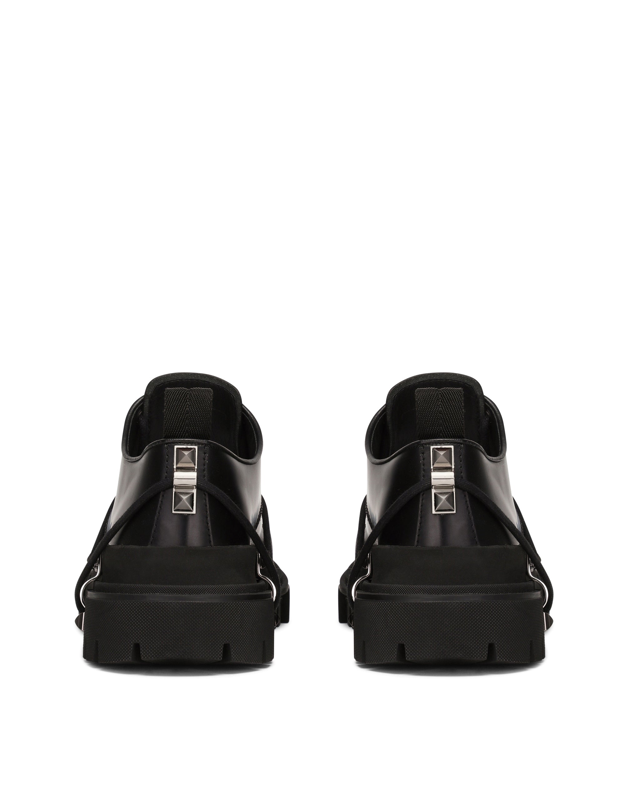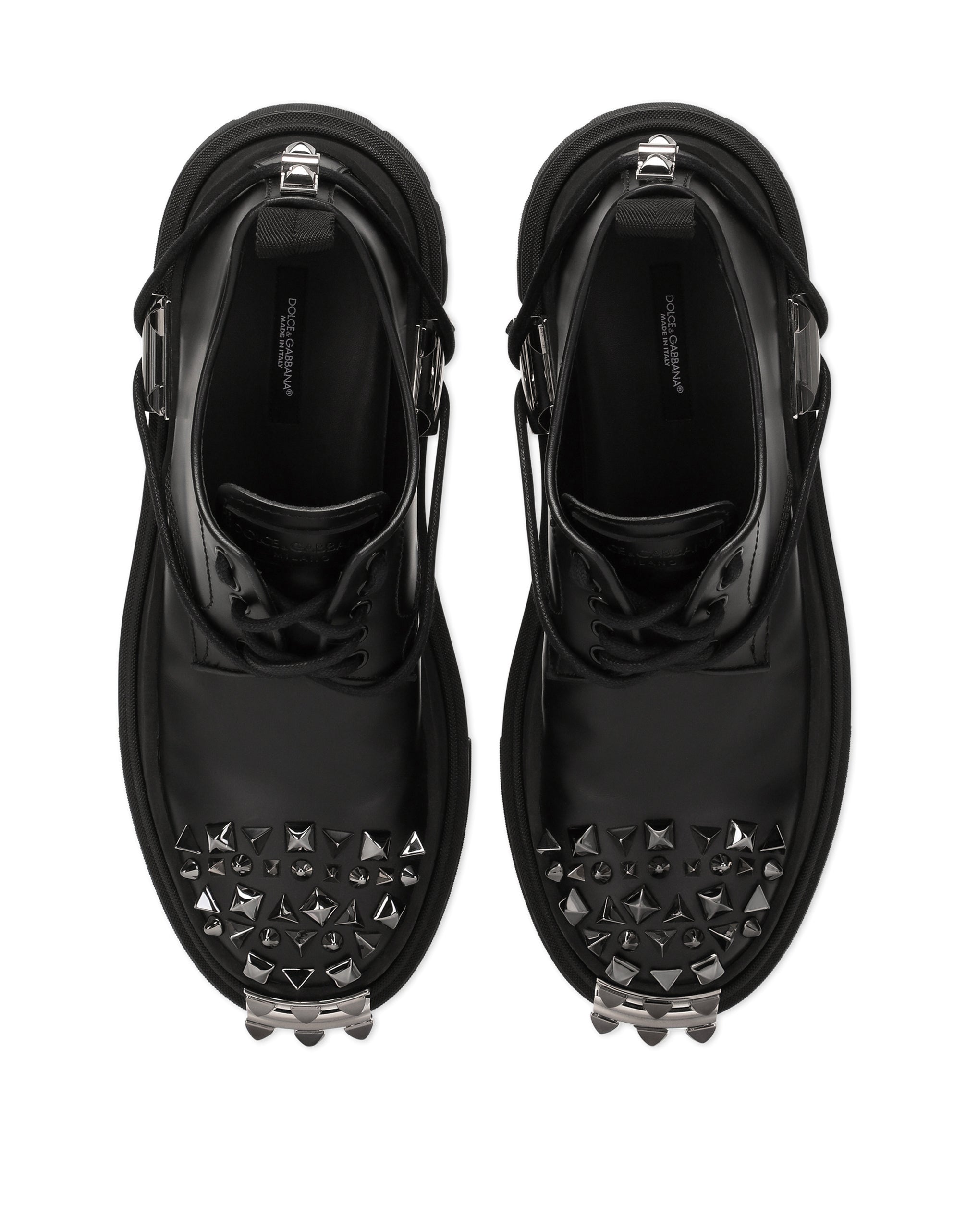The Dark Side collection, inspired by the Punk Rock world, wants to be an ode to communication, emancipation and laying claim to our own way of being and living. This collection is giving life to these new high-trekking Derby shoes in calfskin. A series of studs and metal hardware distinguish them and make them bold. They also feature the leather Dolce&Gabbana logo on the tongue. • Rubberized calfskin upper • Waxed tubular laces inserted in the sole • Gros-grain pull-tab • Calfskin insole with branded label • Branded rubber sole • Item comes with themed packaging • Made in Italy