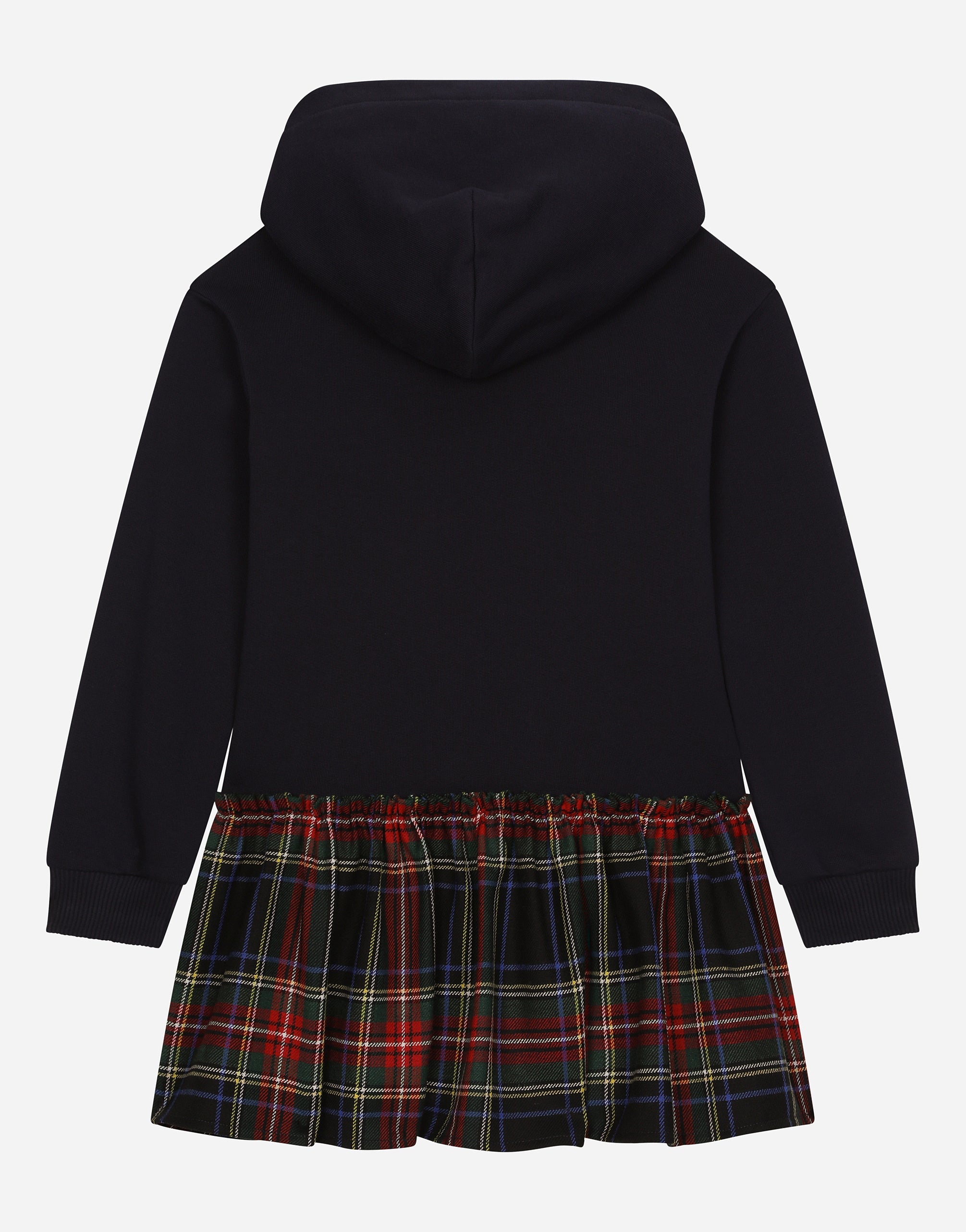 The 2024 Boy’s and Girl’s Back to School collection is reworking the Anglo-Saxon imagery of British boarding schools in full Dolce&Gabbana style. From floral prints to bright hues, like ruby red, as well as more subdued tones of navy blue, white and stone gray, the collection delivers a mix of pairings, embroidered details and pop prints that will add some verve to closets that merge functionality with fun. A tribute to freedom of movement that invites children to be bold and carefree when mixing and matching the pieces. Tartan cotton jersey and wool-blend dress with embroidered DG logo patch and tulip print: • Multi-colored • Regular fit • Round neck with hood • Lined sleeves with stretch knit cuffs • Placed print • The item in the size 6 years measures 60 cm from the shoulder seam • Made in Italy The difference in the print placement that you may find on this product is a feature of Dolce&Gabbana’s “Handmade” pieces. A detail that makes every garment or accessory unique and exclusive.