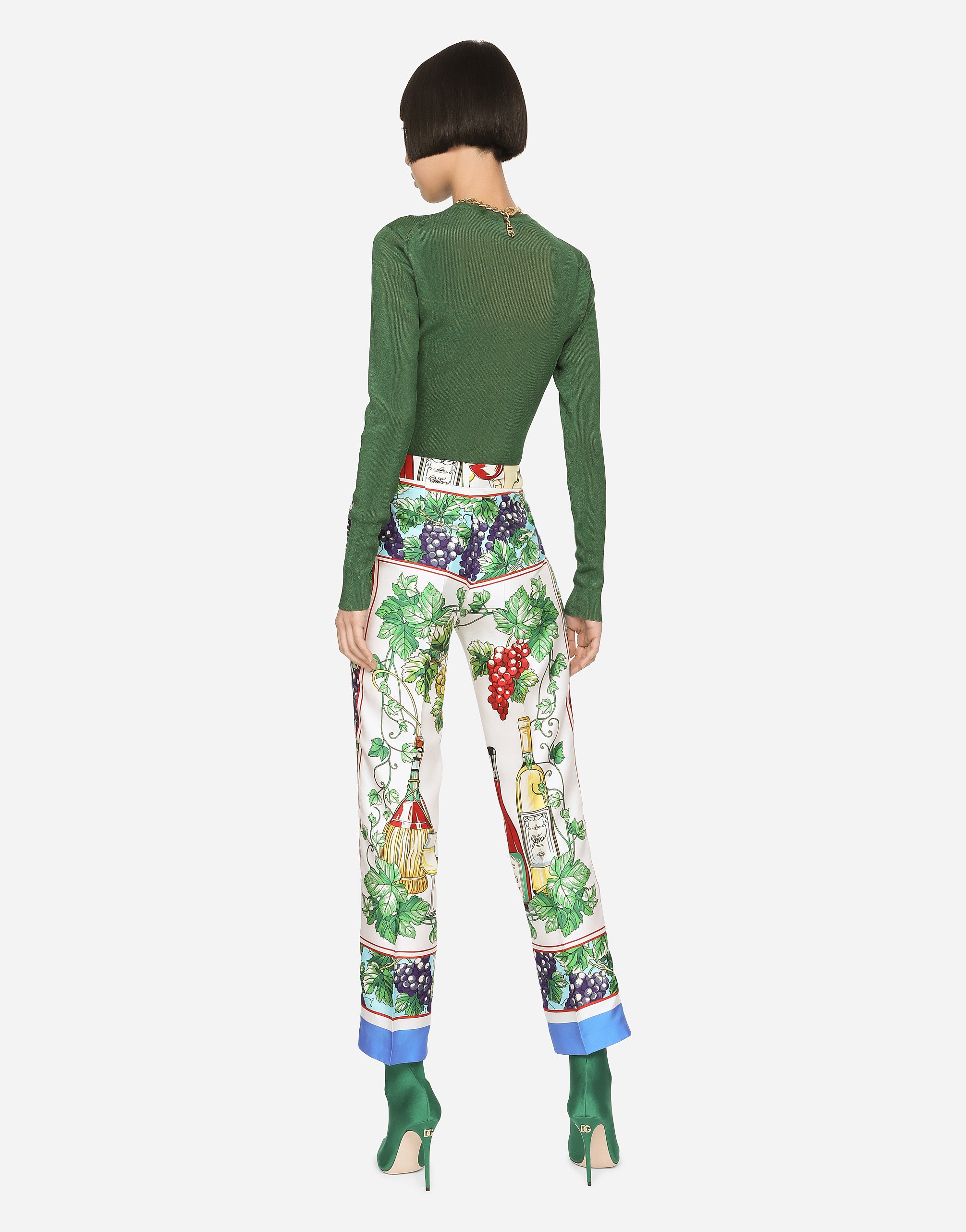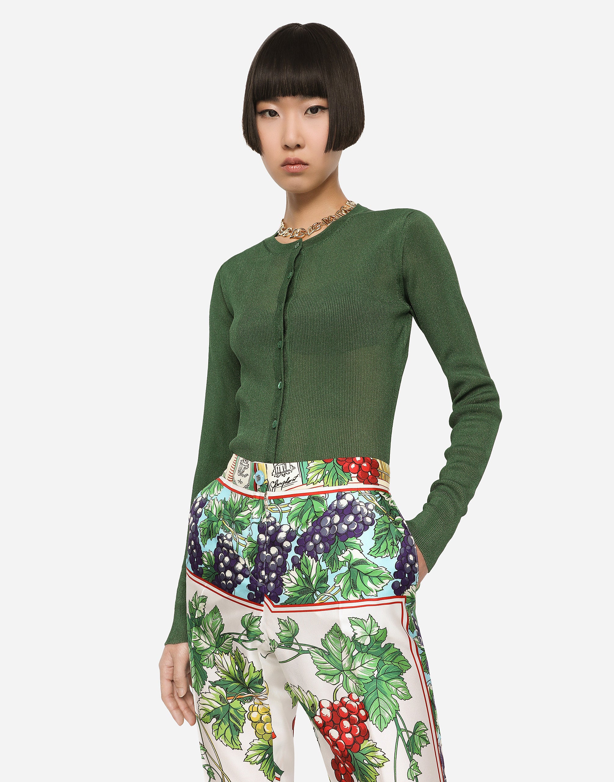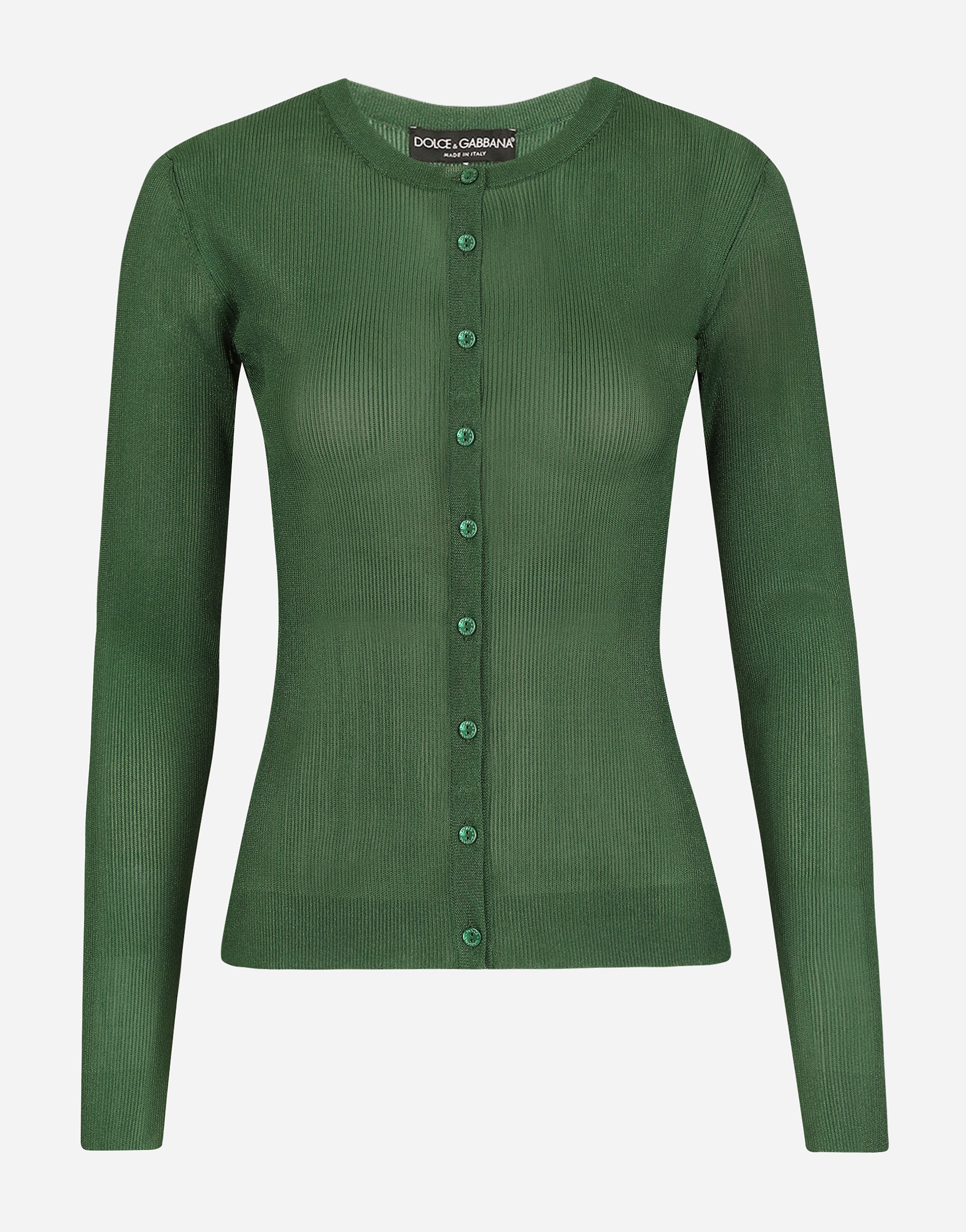 A bright yarn has been woven into the fine-rib of this slim-fit cardigan in a vibrant bottle green hue. It will go perfectly with any look, both tailored pieces and modern, sophisticated ensembles. • 21-gauge knit • Round neck • Long sleeves • Regular fit • Fine-rib trims • Branded mother-of-pearl button fastenings • The piece measures 61 cm from the shoulder seam on a size IT 40 • The model is 175 cm tall and wears a size IT 40 • Made in Italy