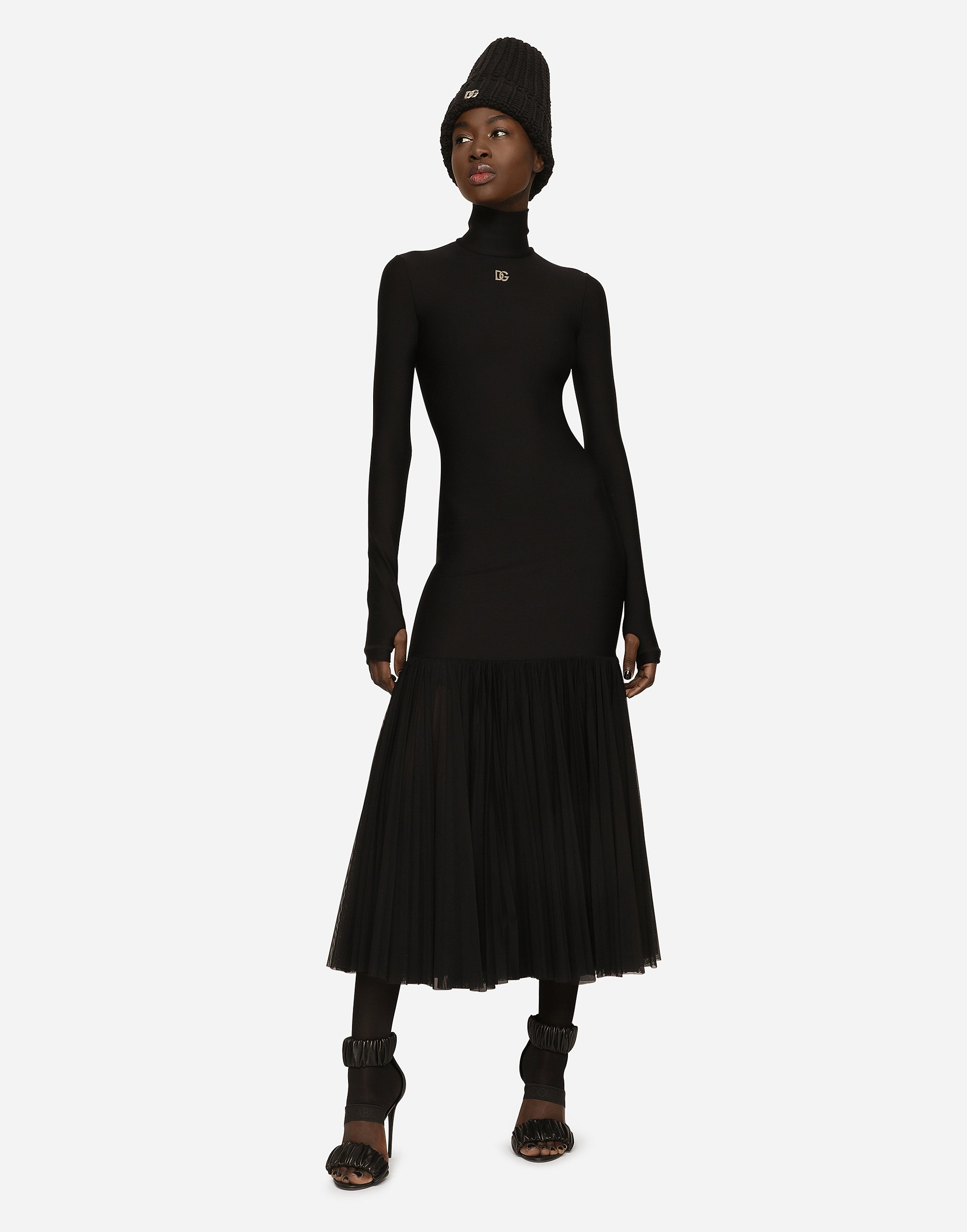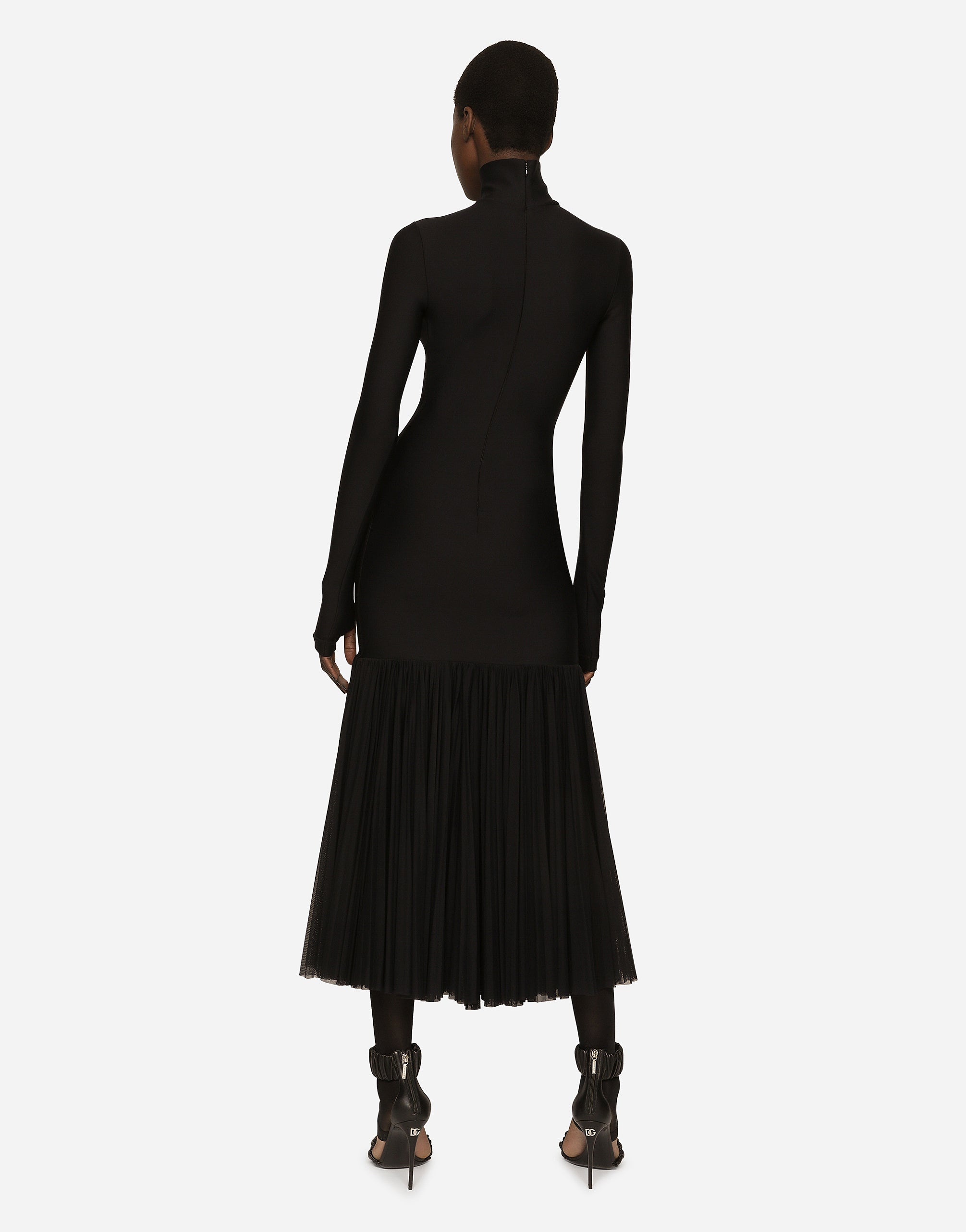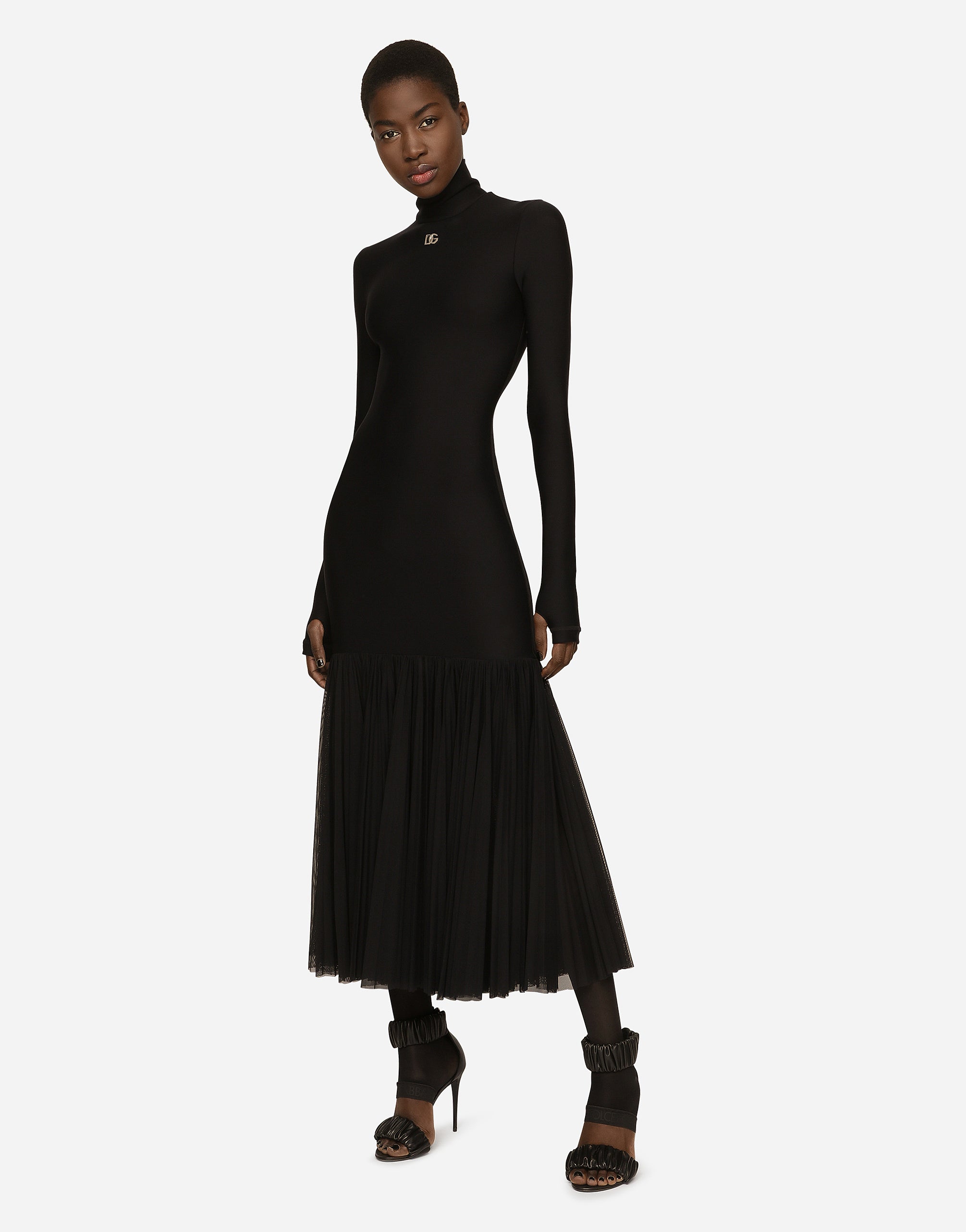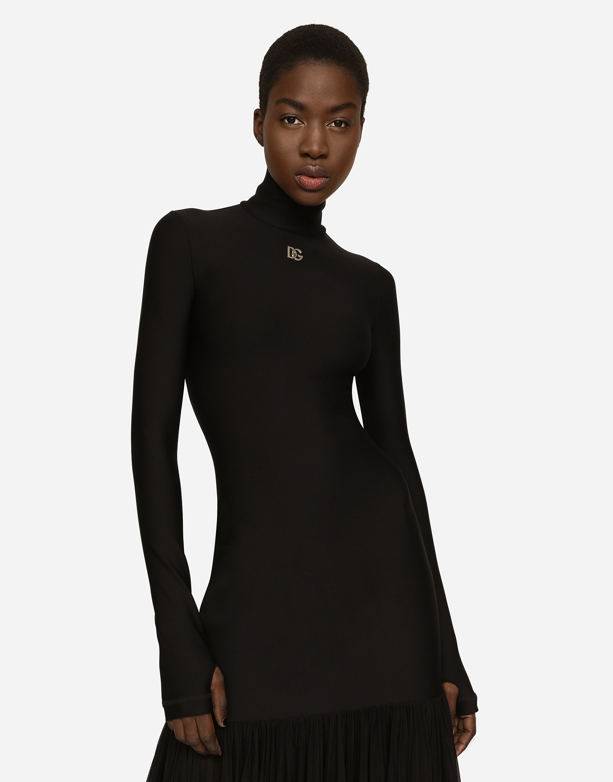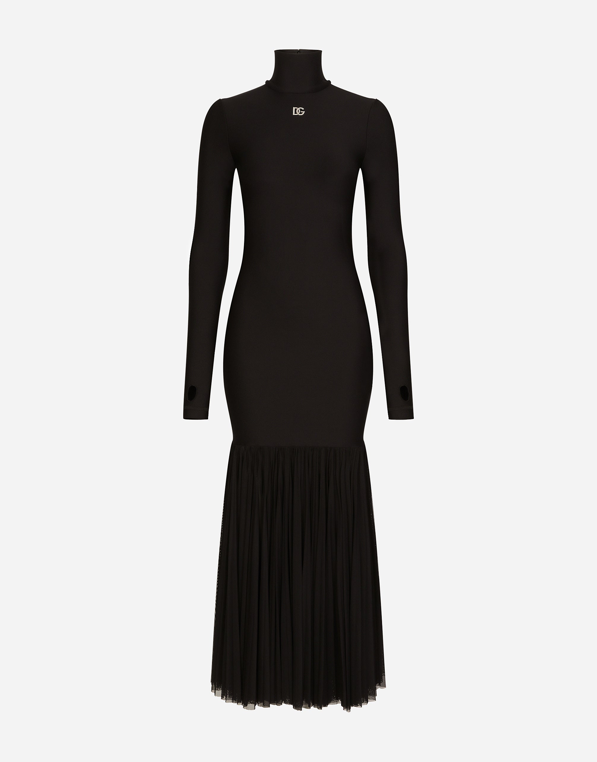 Dolce&Gabbana is rewriting the rules of its signature aesthetic. Starting from the basis of its identity, the brand is imbuing its classical elements with new contemporaneity. Pieces with modern allure, such as this fitted technical jersey dress with tulle ruffle, will give your looks unmistakable personality. • Round neck with the metal DG logo • Long sleeves with half glove • Unlined • Invisible zip and hook-and-eye fastening on the back • The piece measures 90 cm from the waist down on a size IT 40 • The model is 175 cm tall and wears a size IT 40 • Made in Italy