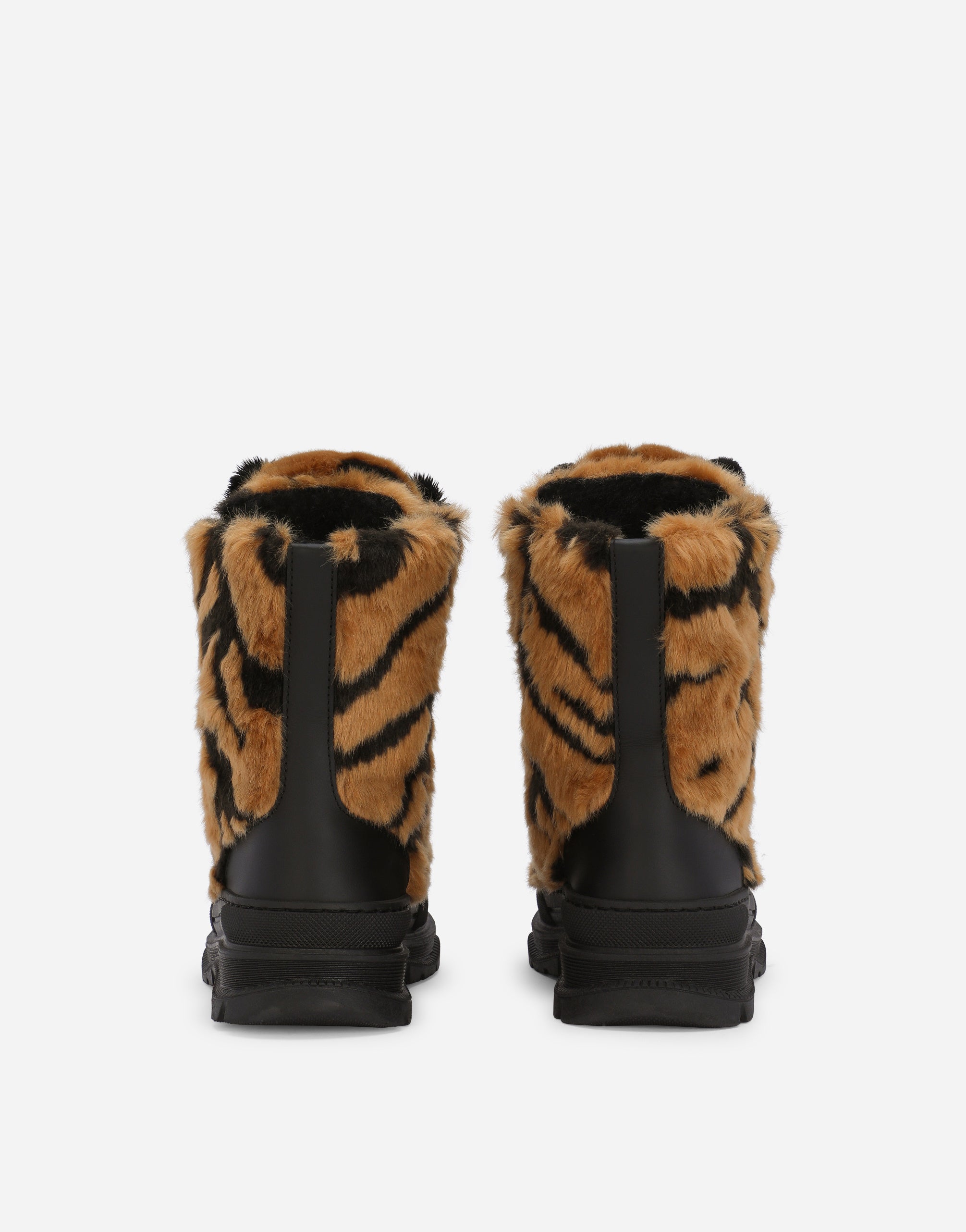 The Winter Savana capsule collection plays around with the brand’s signature details in a mix & match of animal prints. Zebra, leopard and tiger prints mix to enhance glamor and personality. Faux fur paired with chiffon, printed jersey and a pop of denim create a fun and contemporary total look. These boots will add a glam touch to all little girls. • Tiger faux fur upper • Laces • Handmade tiger face on the tongue • Faux fur footbed with branded label • Rubber outsole and bottom assembly • Made in Italy