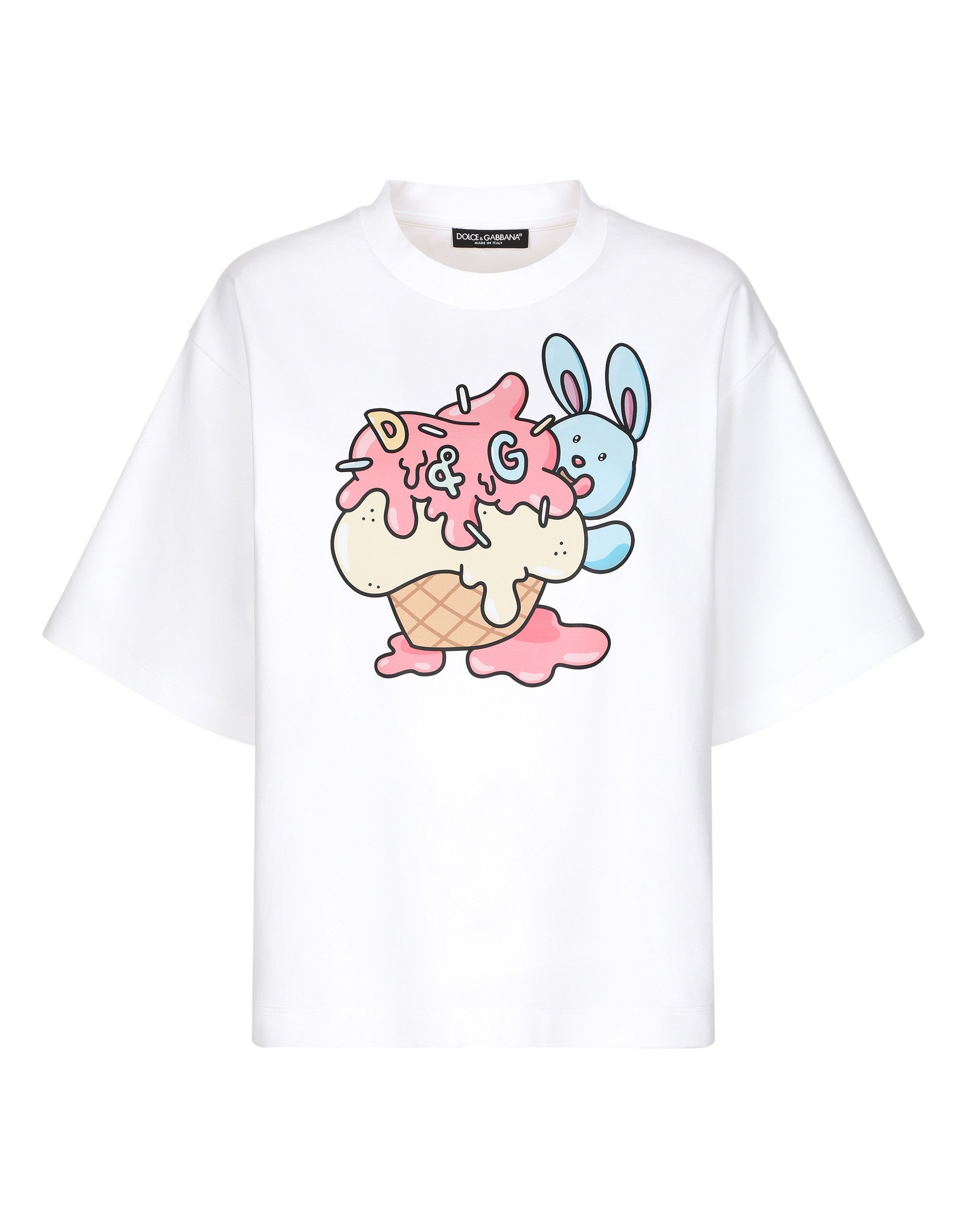 Stefano and Domenico are continuing their collaboration with young international artists by getting the Italian cartoon designer Gianpiero D'Alessandro involved. His art and mode of self-expression come from dialog and the fusion of reflection, emotion and sentiment. He has created “Sweet Bunny” for us, a character that is the star of our T-shirts, sweatshirts and knitwear, created to incarnate the concept of family, love and all the values that represent the cornerstone of Dolce&Gabbana’s projects. • Fine-rib round neck • Short sleeves • Boxy fit • The piece measures 60 cm from the rear seam on a size S IT • The model is 175 cm tall and wears a size S • Made in Italy