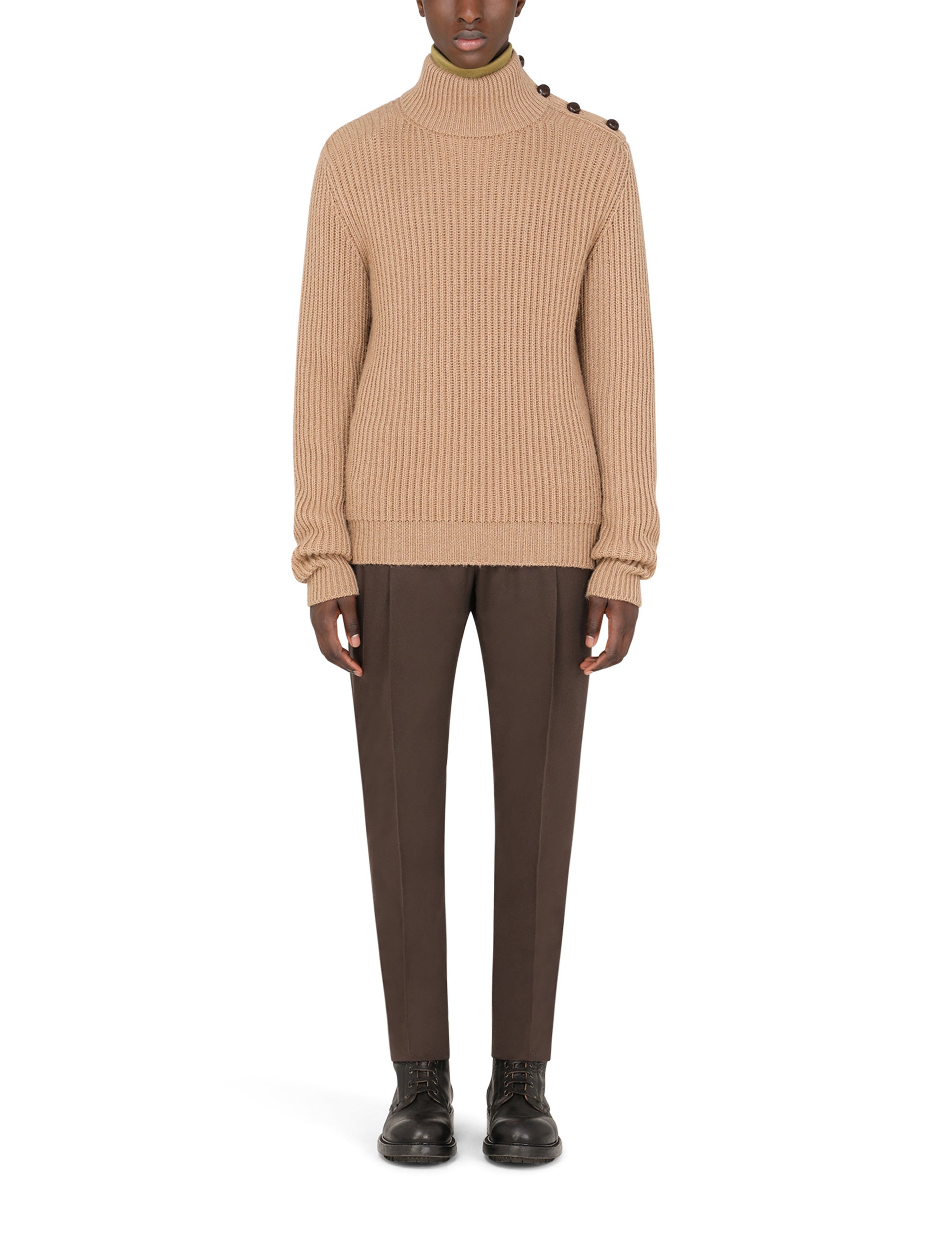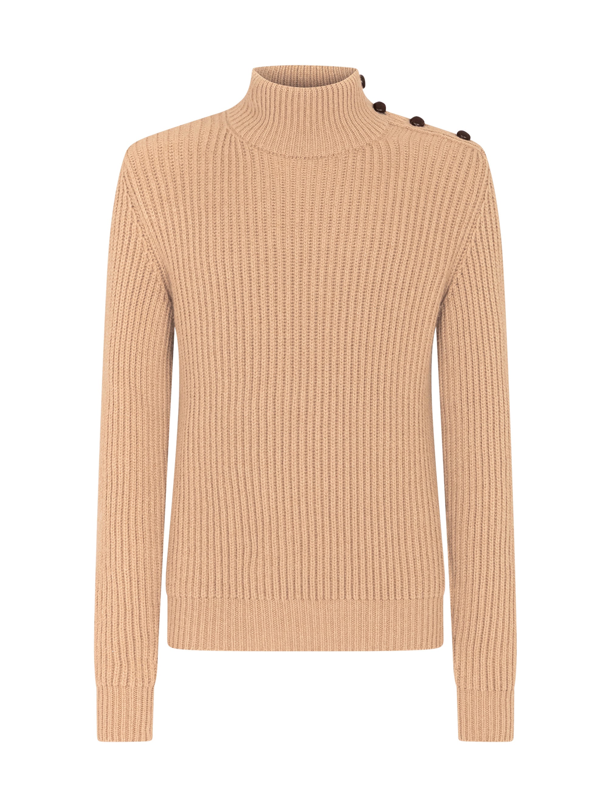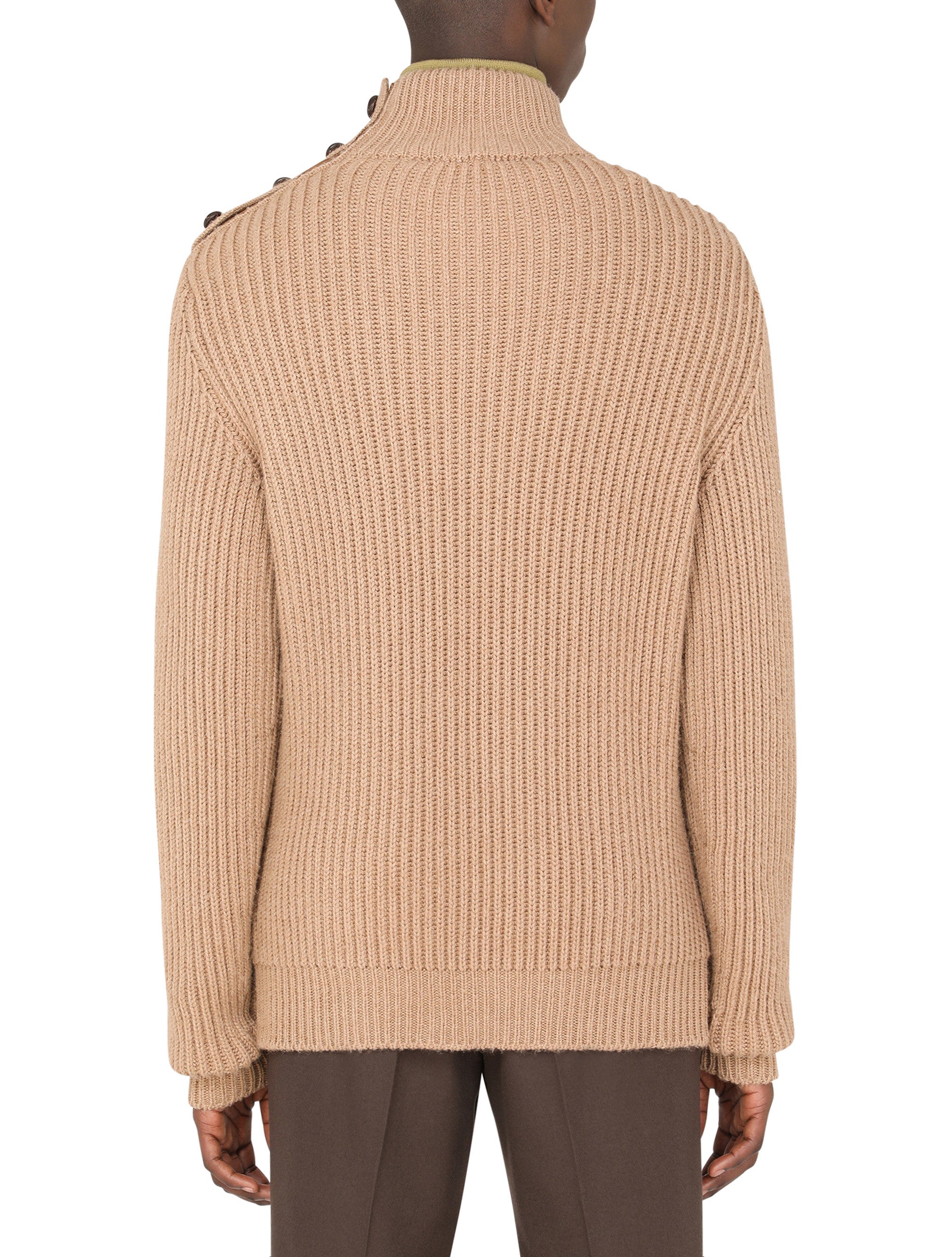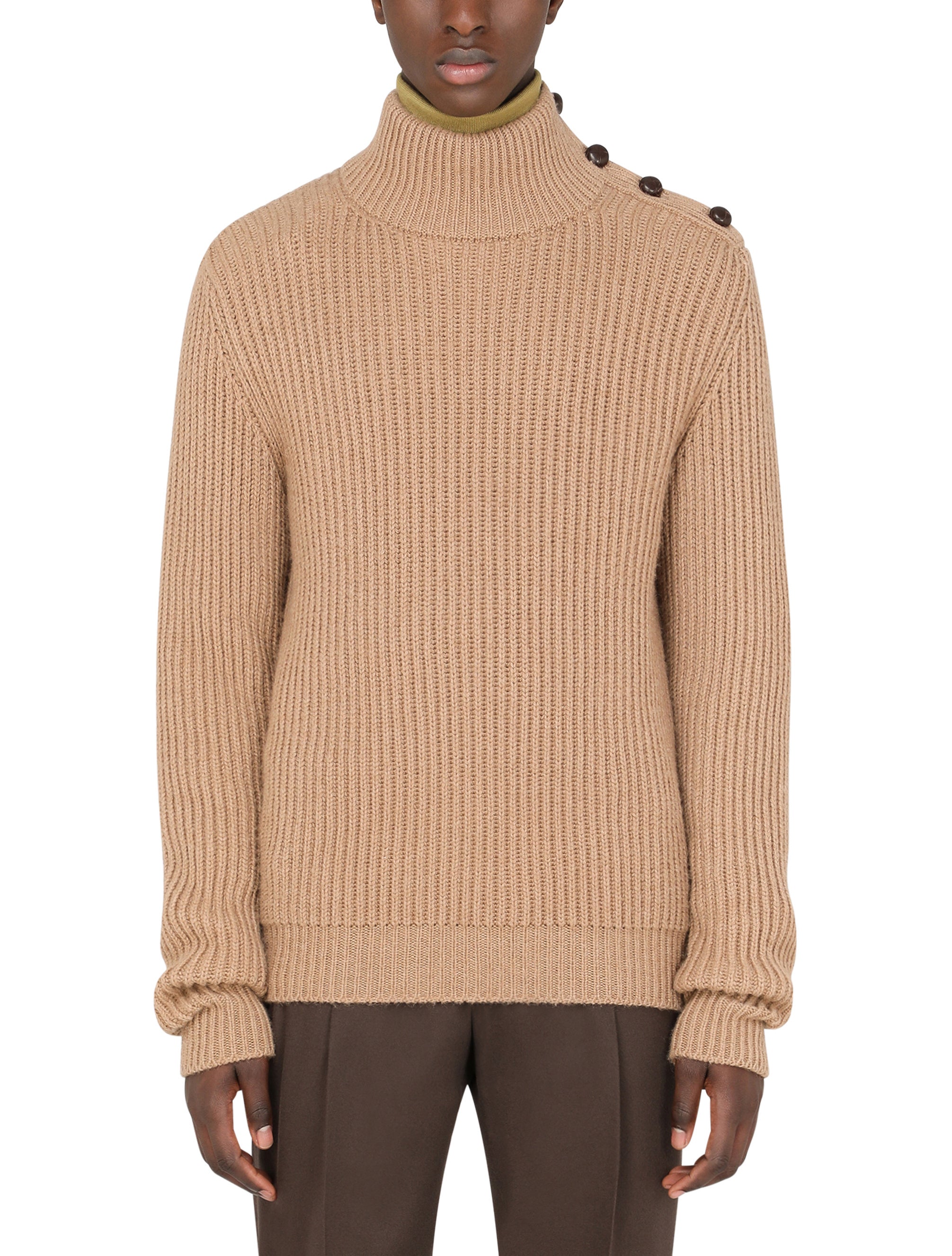 Elegant turtle-neck sweater in camel wool with lambskin-covered buttons on the neck. • Regular fit • Long sleeves • 5-gauge ribbed knit • The piece measures 68 cm - 26.8 inches from the rear collar seam on a size IT 48 • The model is 185 cm - 72.8 inches tall and wears a size IT 48 • Made in Italy