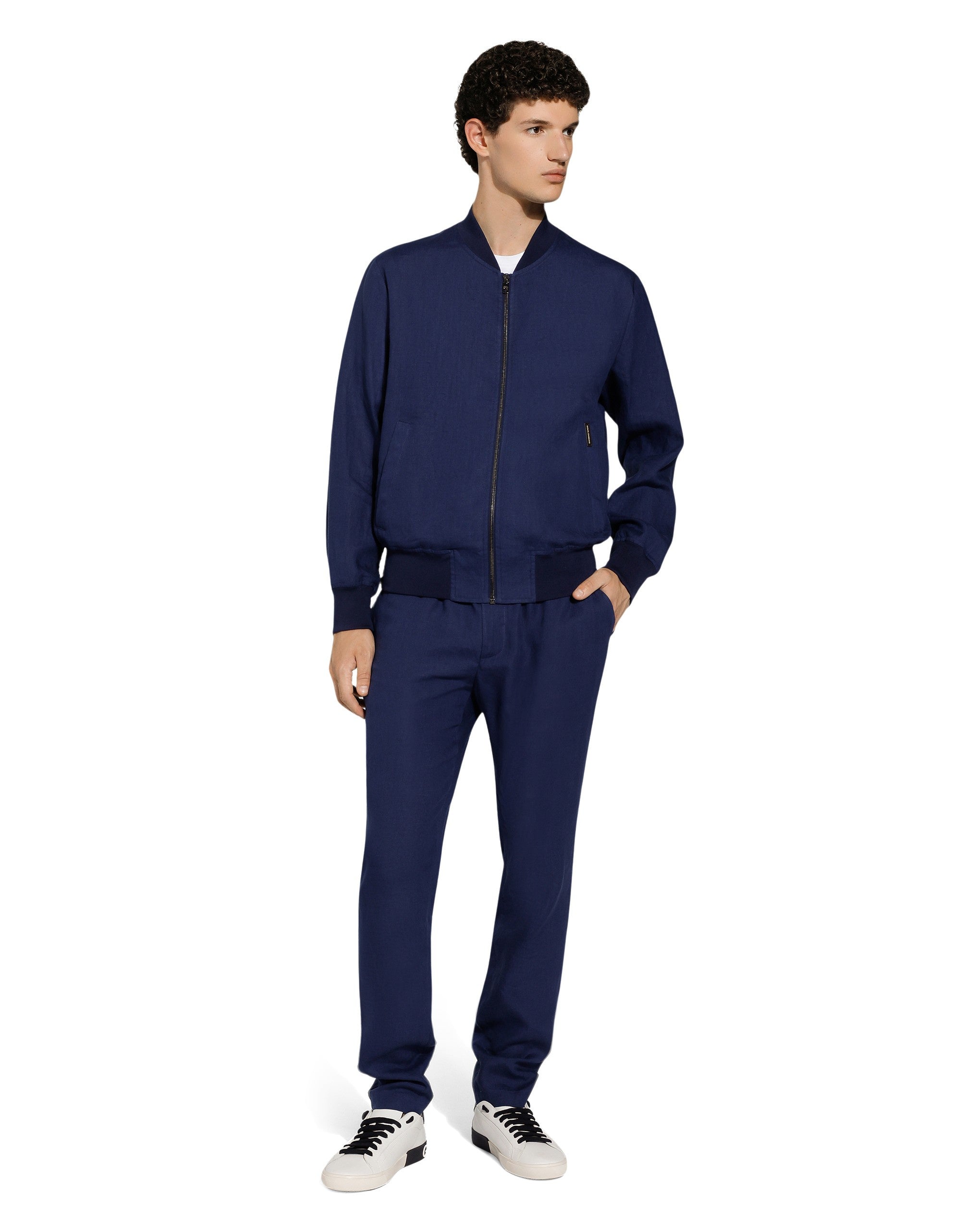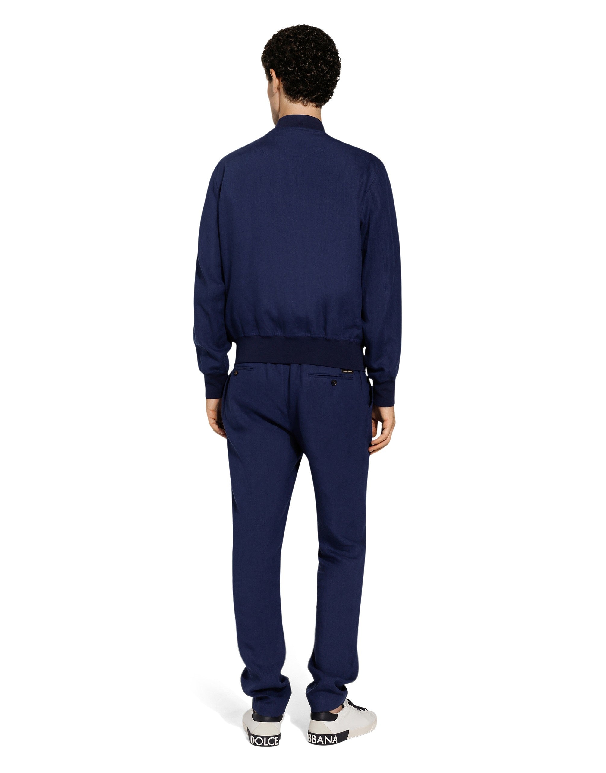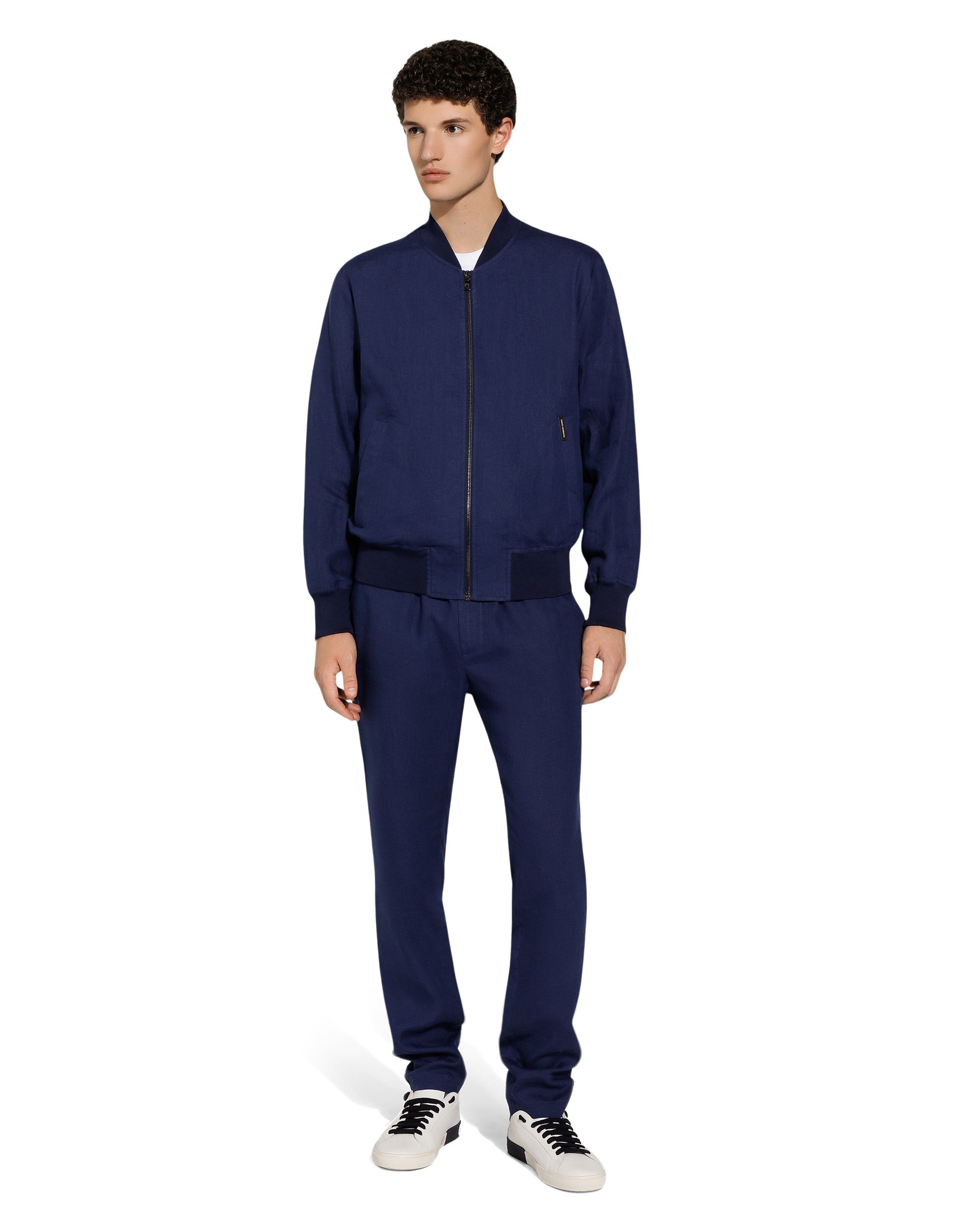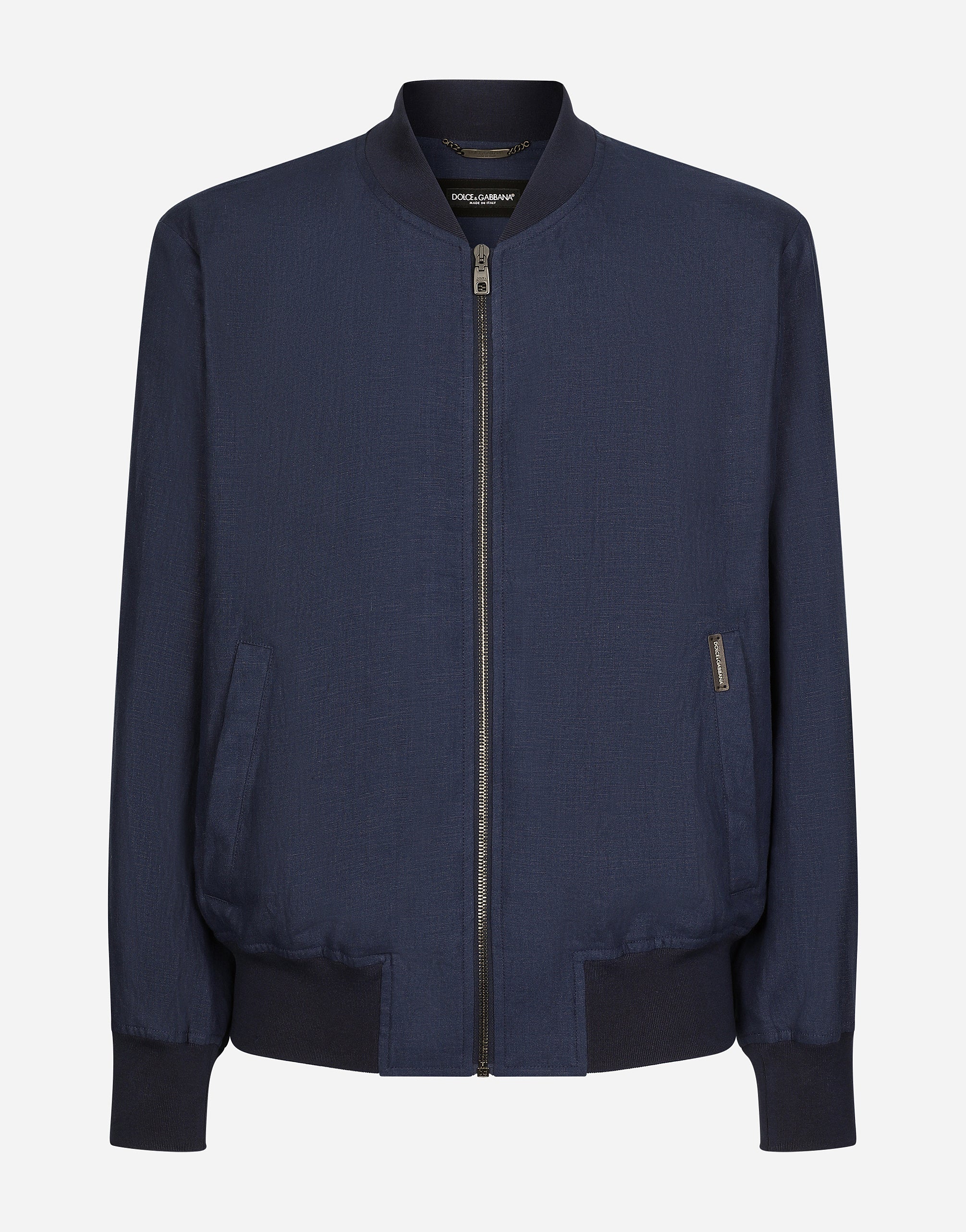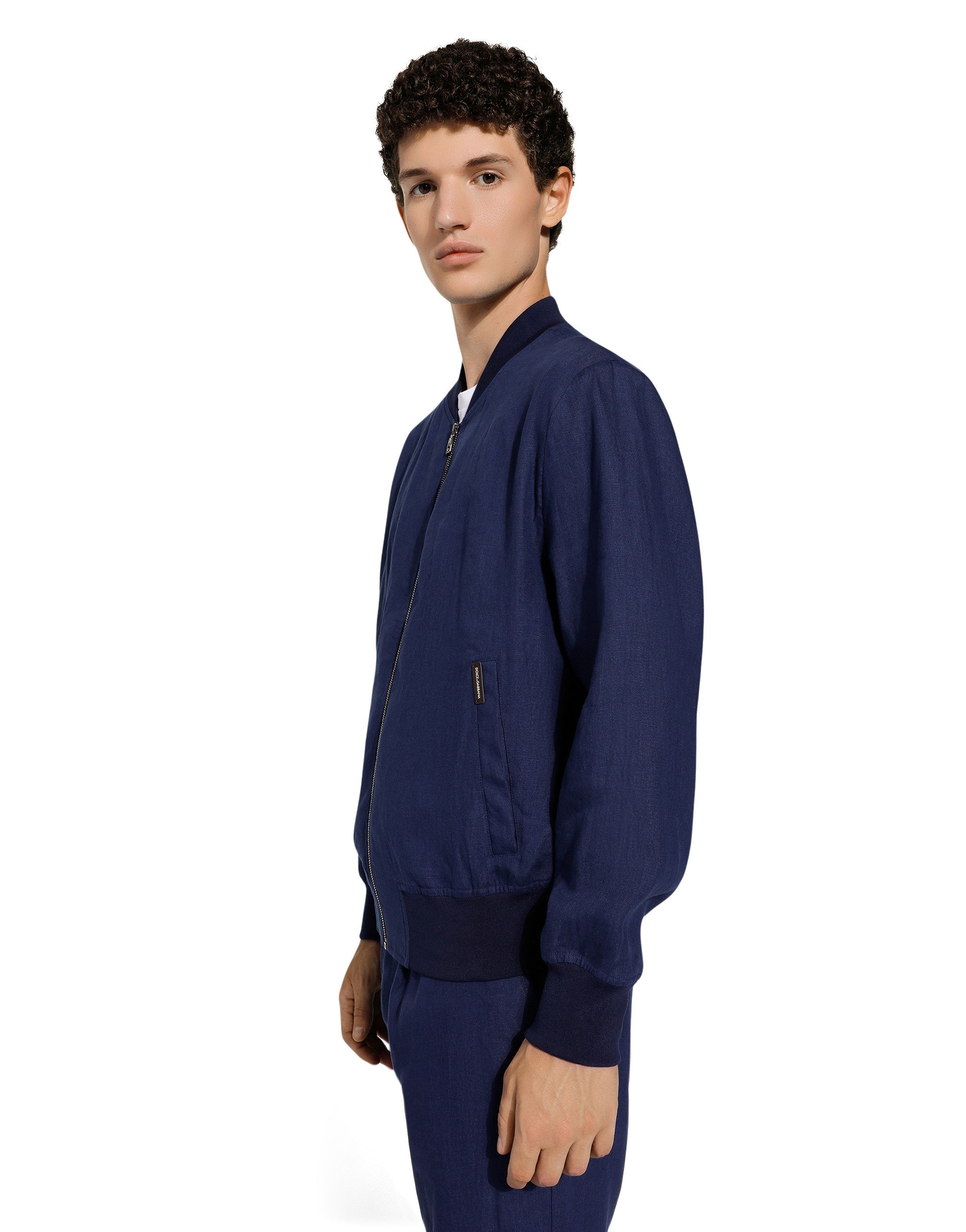 The Palermo collection represents the link between the Sicilian man’s world and the unspoiled nature of the island. A language marked by warm hues – sand, cream, Nero Sicilia black – floral paintings and iconic prints. The Dolce&Gabbana closet must-haves have been reworked in different materials, in pursuit of a new form of harmony. A collection rich in suggestion, such as the stripes inspired by the old mattresses of the 1940s and 1950s, and the timeless aesthetic of the looks. Unlined linen bomber jacket: • Blue • Regular fit • Stretchy jacquard neck, hem and cuffs • Outer pockets and inner welt pockets with button • The piece measures 65 cm from the rear collar seam on a size IT 48 • Made in Italy