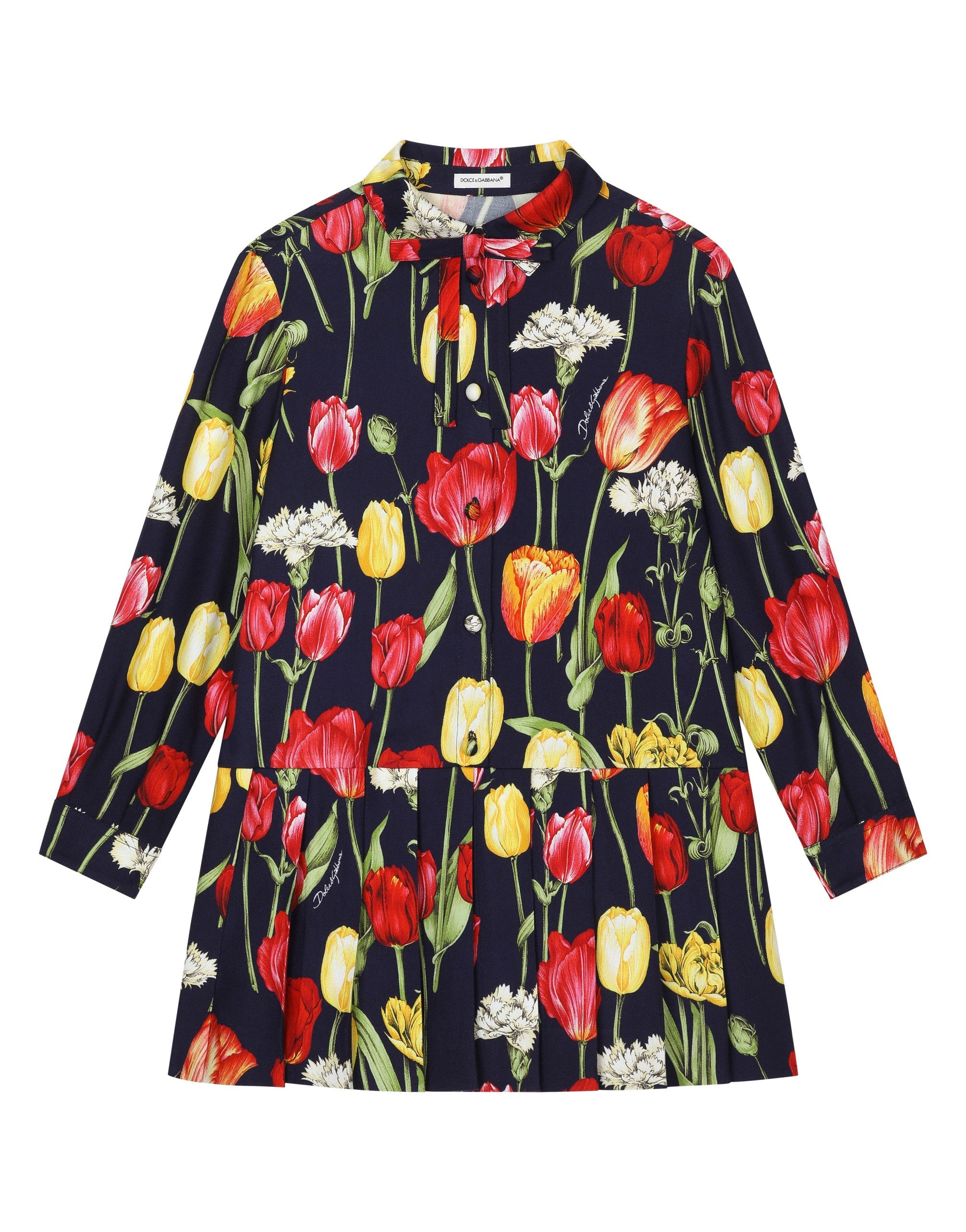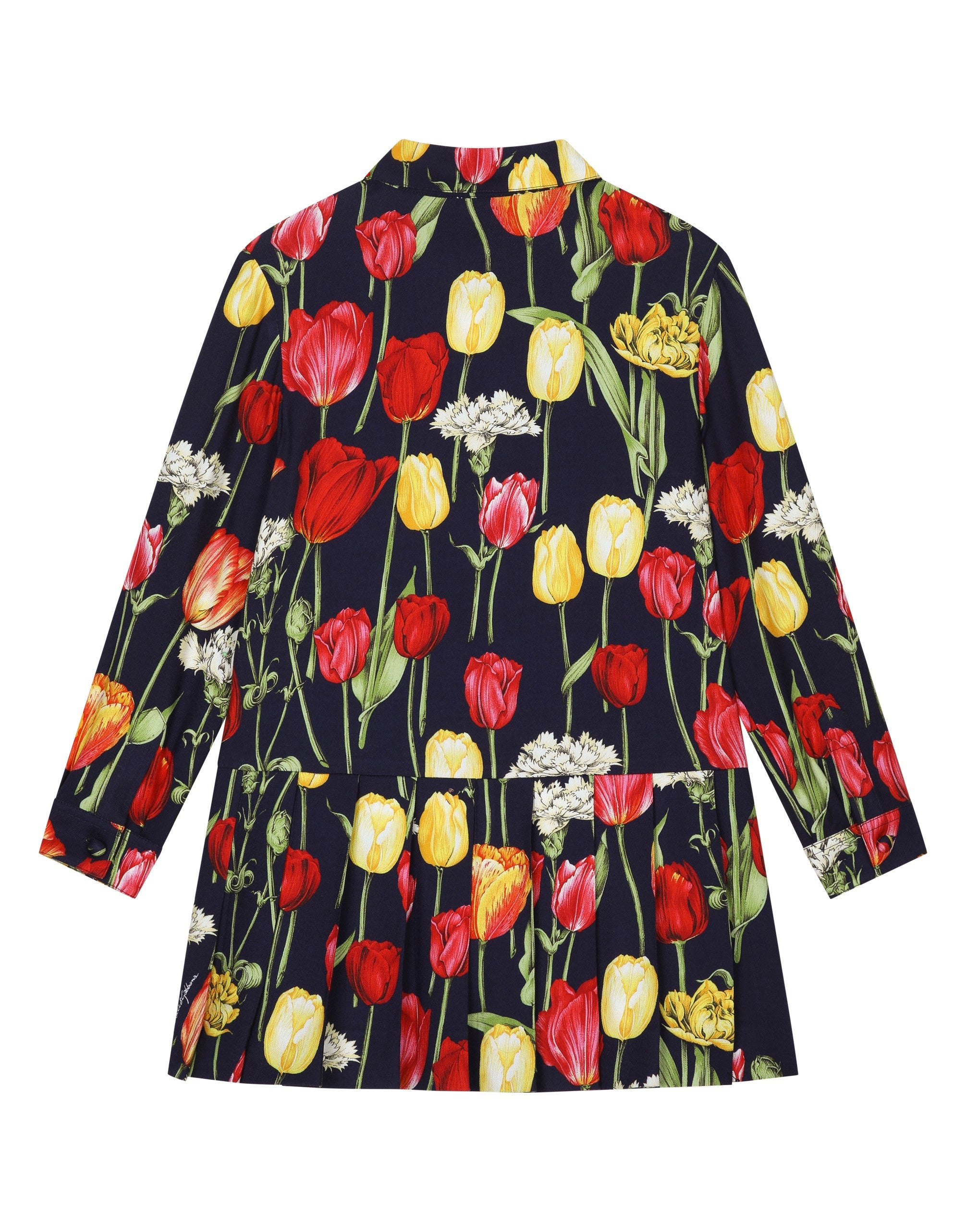 The 2024 Boy’s and Girl’s Back to School collection is reworking the Anglo-Saxon imagery of British boarding schools in full Dolce&Gabbana style. From floral prints to bright hues, like ruby red, as well as more subdued tones of navy blue, white and stone gray, the collection delivers a mix of pairings, embroidered details and pop prints that will add some verve to closets that merge functionality with fun. A tribute to freedom of movement that invites children to be bold and carefree when mixing and matching the pieces. Viscose viyella dress with all-over tulip print: • Multi-colored • Regular fit • Round neck with collar • Removable fabric bow with small press-stud button • Long sleeves • Pleated skirt • Fabric-lined button fastening at the front • Placed print • The item in the size 6 years measures 65.5 cm from the arm trim • Made in Italy The difference in the print placement that you may find on this product is a feature of Dolce&Gabbana’s “Handmade” pieces. A detail that makes every garment or accessory unique and exclusive.