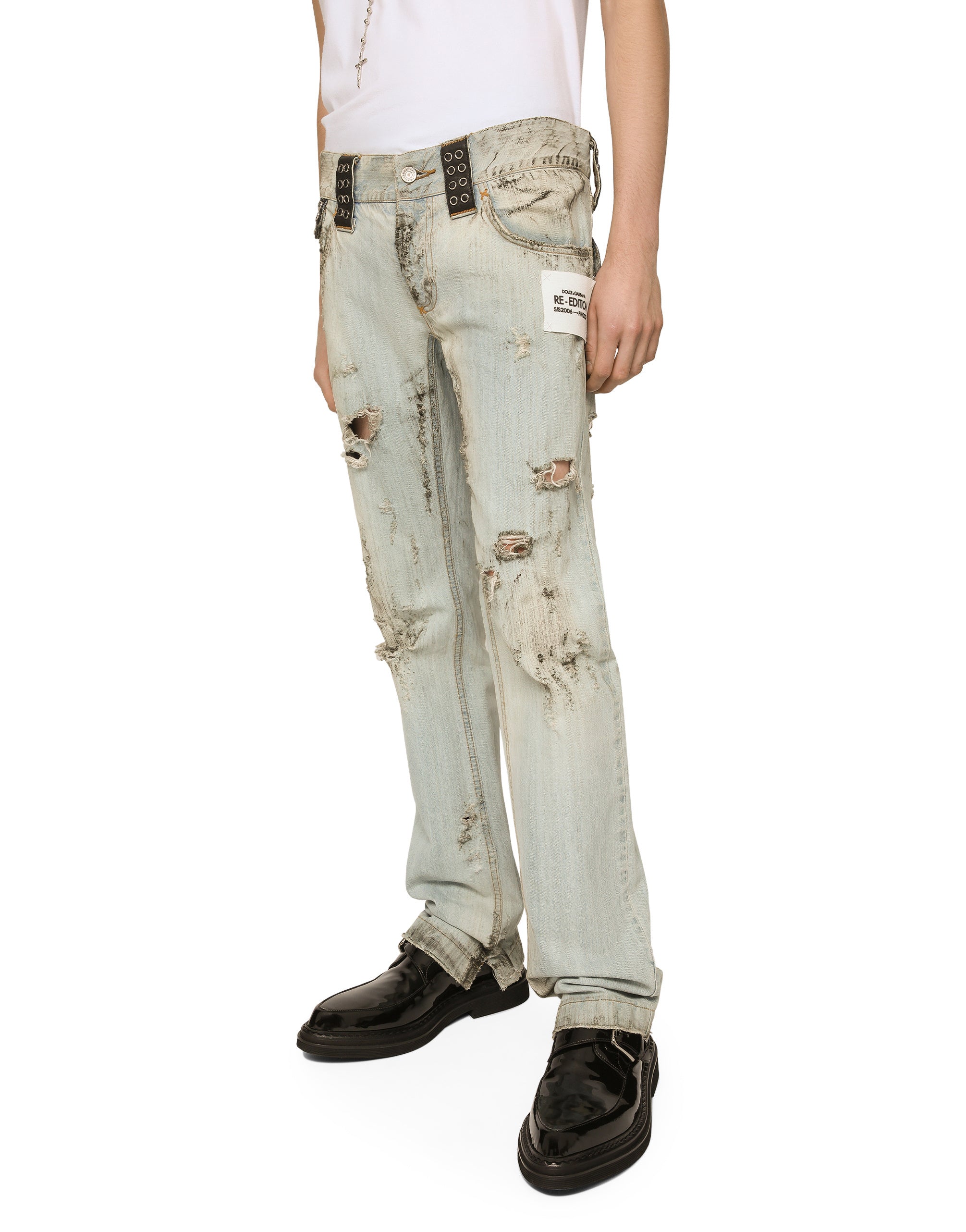 For FW23, Dolce&Gabbana rereads its own historical archive, which is an inexhaustible source of inspiration that is rich in fascination and creativity. The garments accompanied by a “Re-Edition” label report the dates referenced by the collection. Each look enhances in all its sophistication the concept of timeless relevance of a historical archive allowing new generations to discover a past but always current universe that is rich in creative insights and possible personal interpretations. Five-pocket dirty washed denim jeans with rips and leather details with the Re-Edition label: • Light blue • Regular fit • Fly-covered zipper and button fastening • Leather belt loops with metal rings • Leather label on the back with metallic DG logo • Back pockets with leather flaps with metal rings • The item measures 108 cm on the outer leg and the hem is 20 cm wide on a size IT 48 • The model is 185 cm tall and wears a size IT 48 • Made in Italy