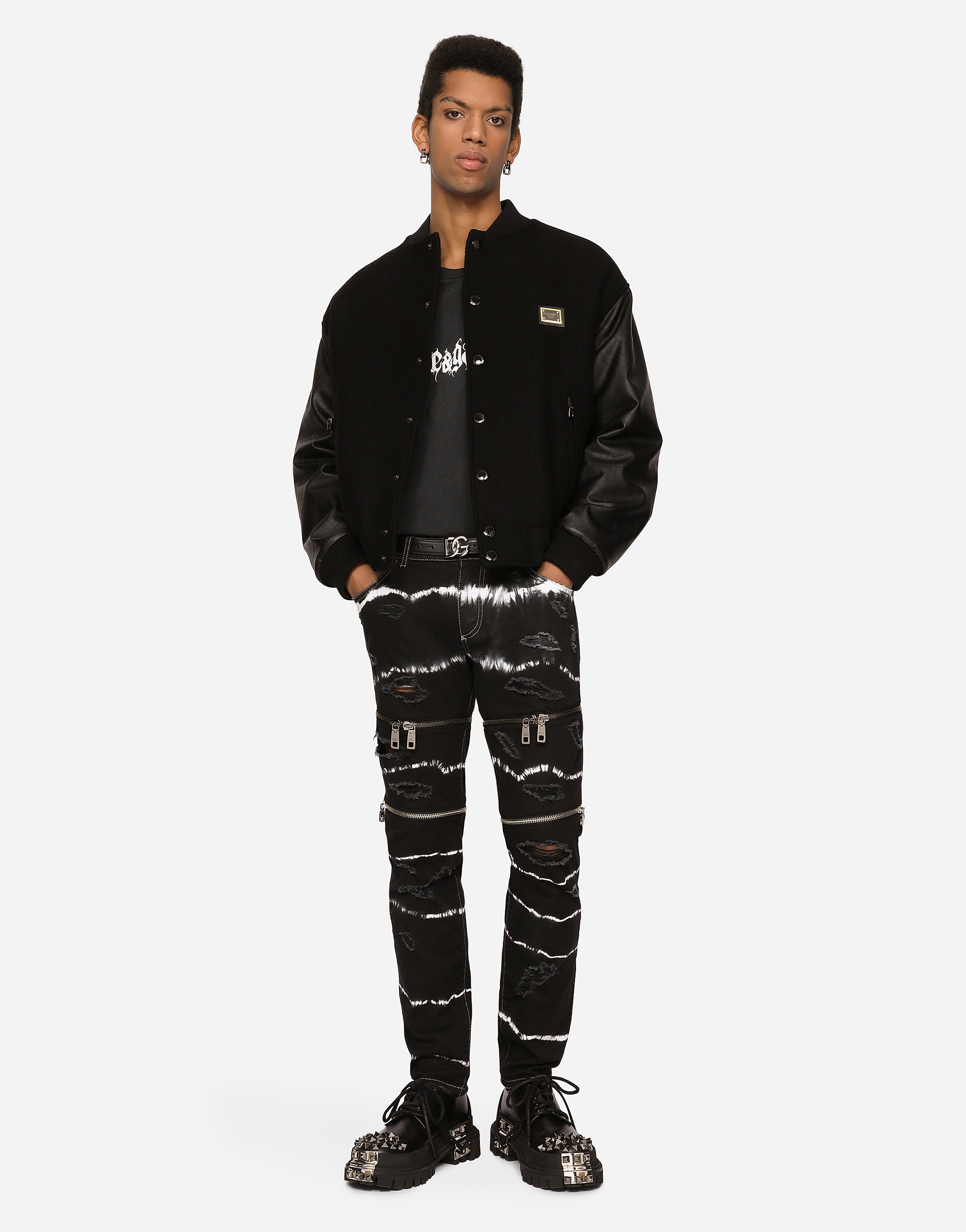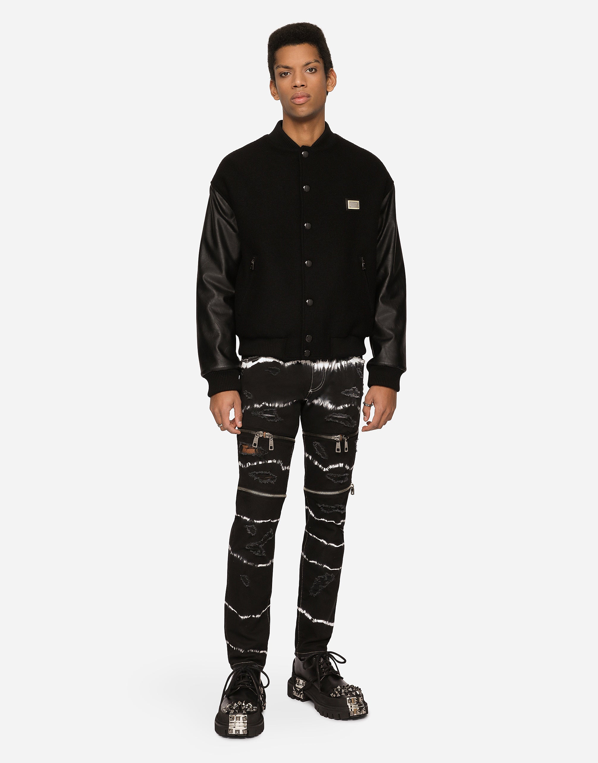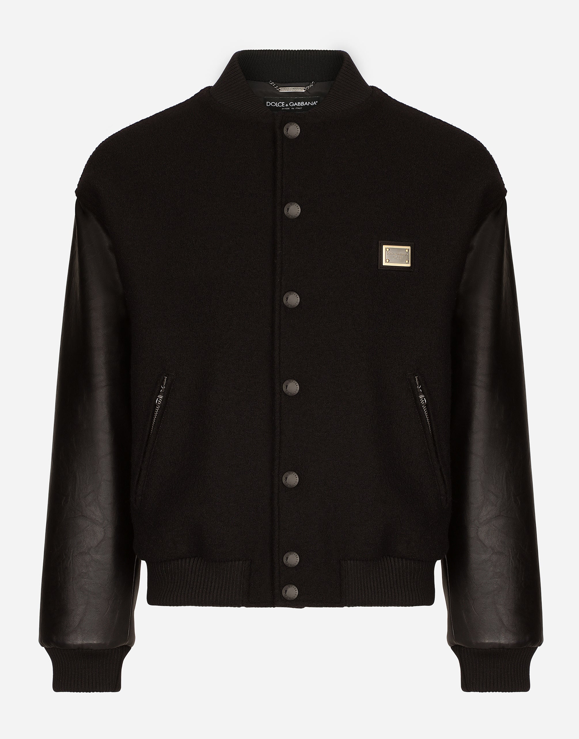 The “Dark Side” Collection is inspired by the Punk Rock movement that was on the rise in England and the United States in the mid-70s. Looking at Punk, Dolce&Gabbana is paying tribute to the legends of entire generations, celebrating uniqueness, individuality and provocation by making men free to express themselves with the language of today. Wool jacket with faux leather sleeves and a metal tag featuring the Dolce&Gabbana logo. • Regular fit • Branded press-stud fastenings on the front • Outer welt pockets with zipper • Stretch knit neck, hem and cuffs • Lined • The piece measures 63 cm from the rear collar seam on a size IT 48 • The model is 185 cm tall and wears a size IT 48 • Made in Italy