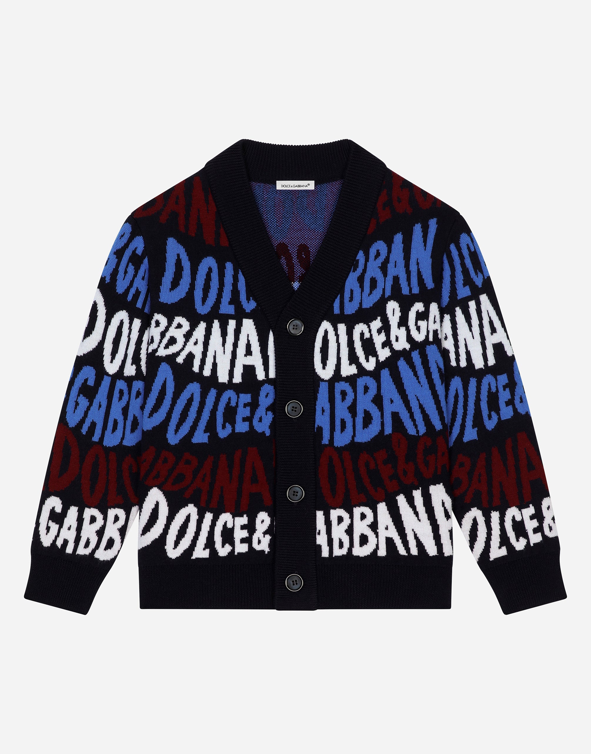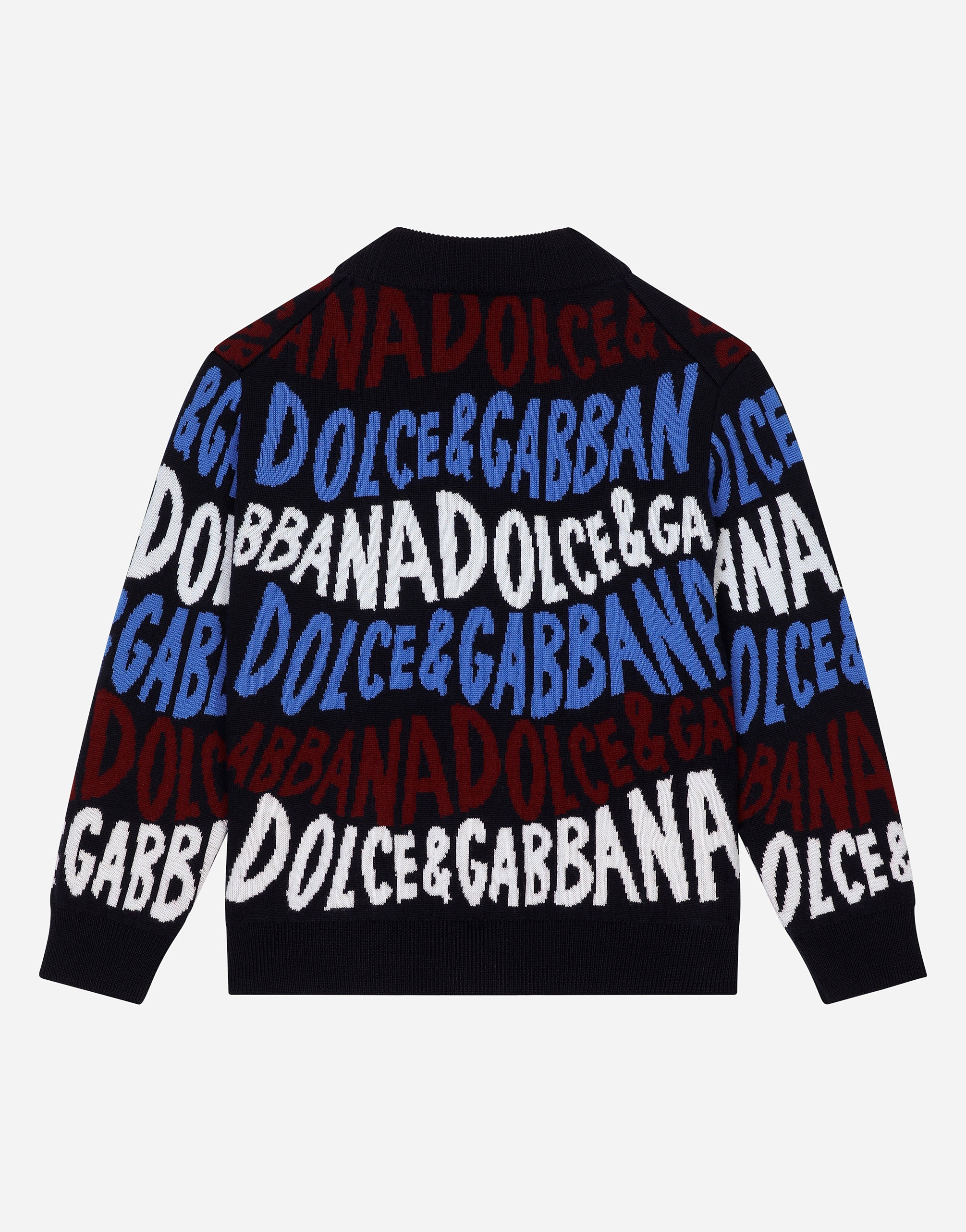 The 2024 Boy’s and Girl’s Back to School collection is reworking the Anglo-Saxon imagery of British boarding schools in full Dolce&Gabbana style. From floral prints to bright hues, like ruby red, as well as more subdued tones of navy blue, white and stone gray, the collection delivers a mix of pairings, embroidered details and pop prints that will add some verve to closets that merge functionality with fun. A tribute to freedom of movement that invites children to be bold and carefree when mixing and matching the pieces. Wool jacquard cardigan with all-over Dolce&Gabbana logo: • Multi-colored • Regular fit • V-neck • Lined sleeves with stretch knit cuffs • Branded button fastenings on the front and a stretch knit trim • The item in the size 6 years measures 50 cm from the shoulder seam • Made in Italy