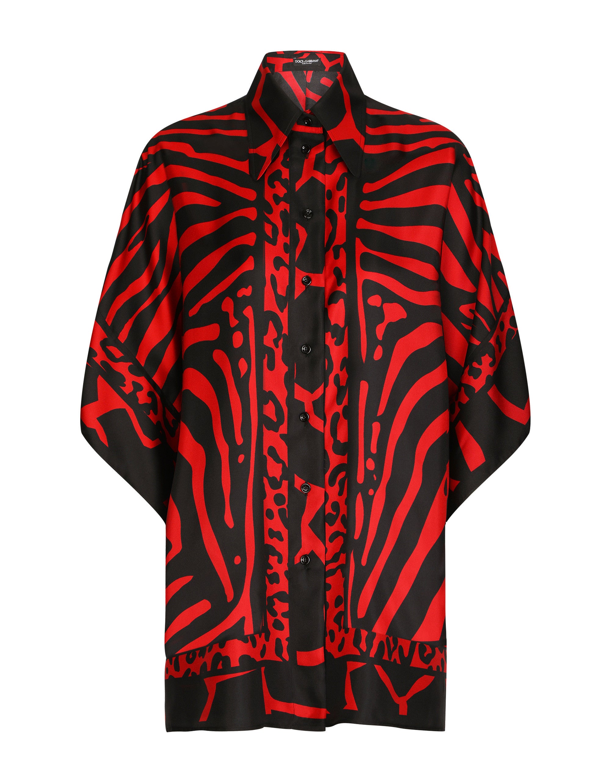 The volcano red hue, chosen by Dolce&Gabbana as an emblem of sensuality and passion, becomes the absolute star of this collection. The animal prints are changing their look and being updated in contrasting black and red that exudes contemporary allure, thereby becoming a gritty and seductive graphic design. Zebra and leopard-print twill shirt: • Shirt collar • Cap sleeves • Oversize fit • Galastil button fastenings • The piece measures 78 cm from the rear collar seam on a size IT 40 • The model is 175 cm tall and wears a size IT 40 • Made in Italy